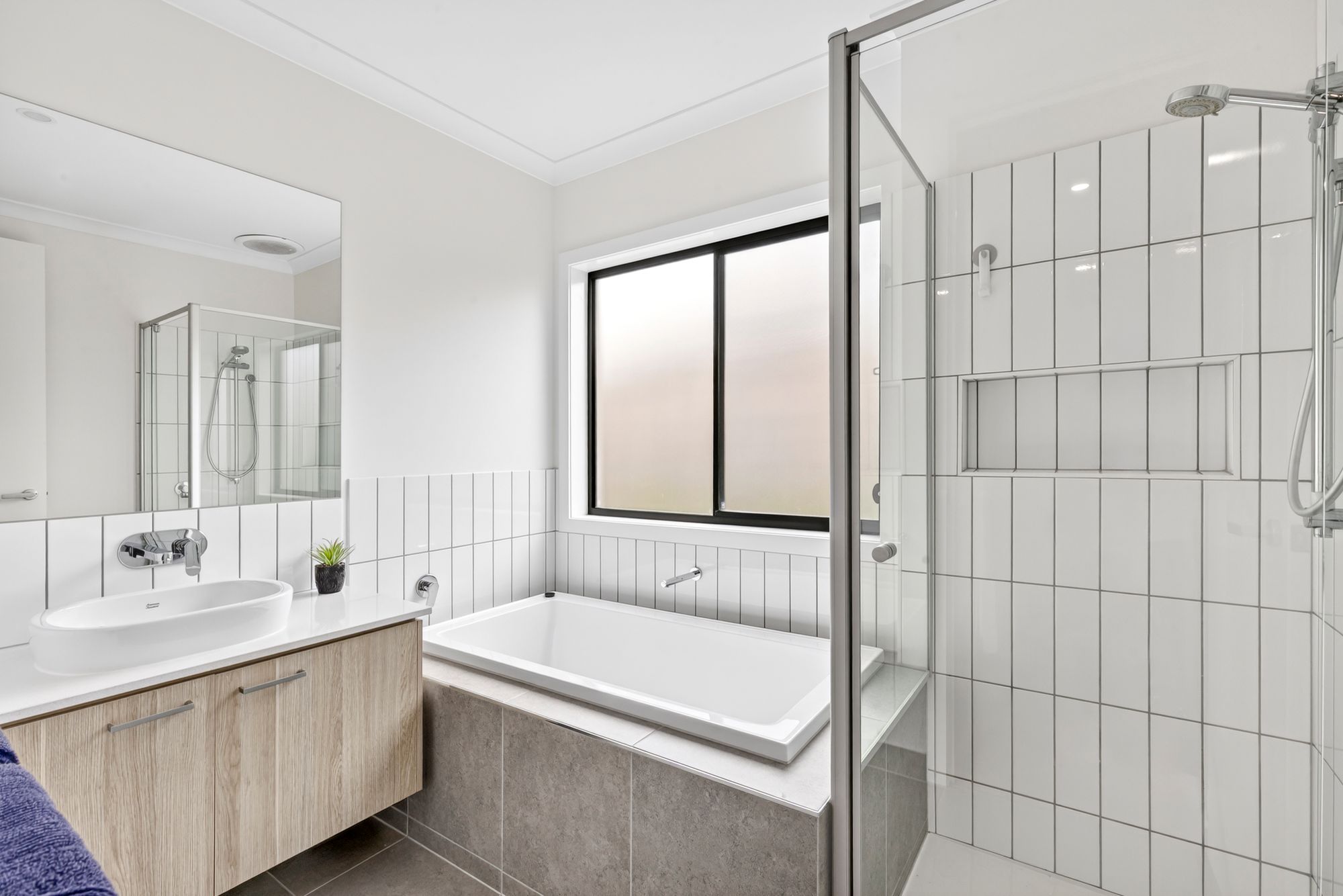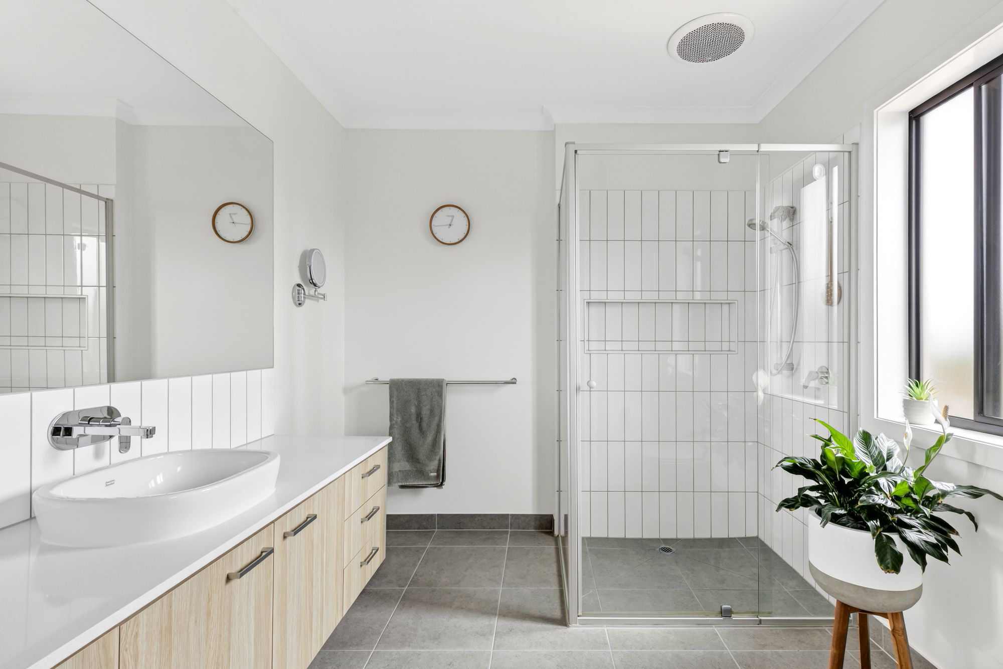 Main Bathroom: Stylishly appointed with a single vanity, tiled splashback, semi-frameless shower with tiled bath base, and built in storage under the sink. Additionally, a separate toilet.