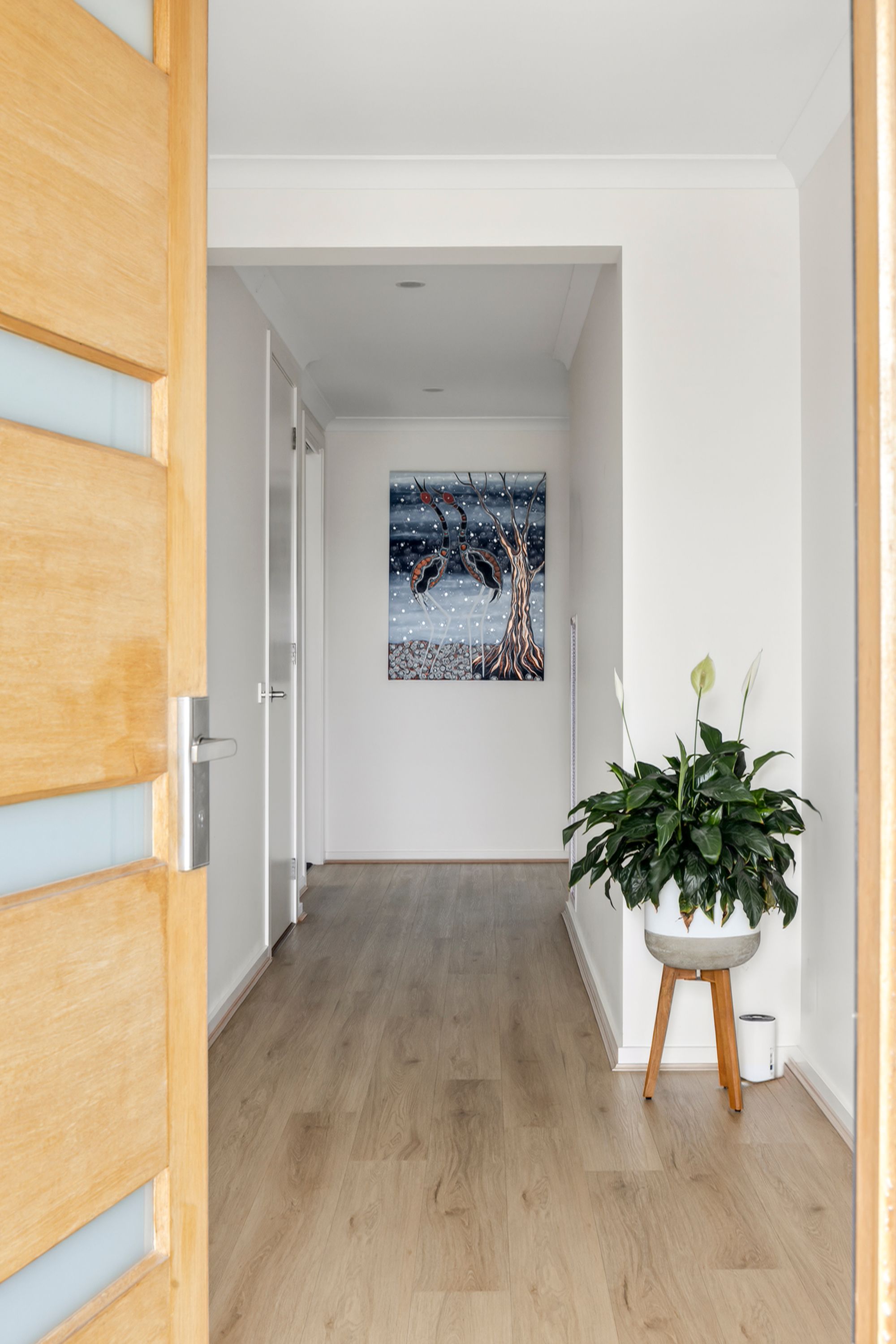 Living/Dining: The open-plan design seamlessly connects the kitchen, dining and living areas. With upgraded hybrid flooring, ducted heating, evaporative cooling, DC ceiling fan, downlights, double blinds, and large glass sliding doors opening to the backyard and undercover alfresco.
