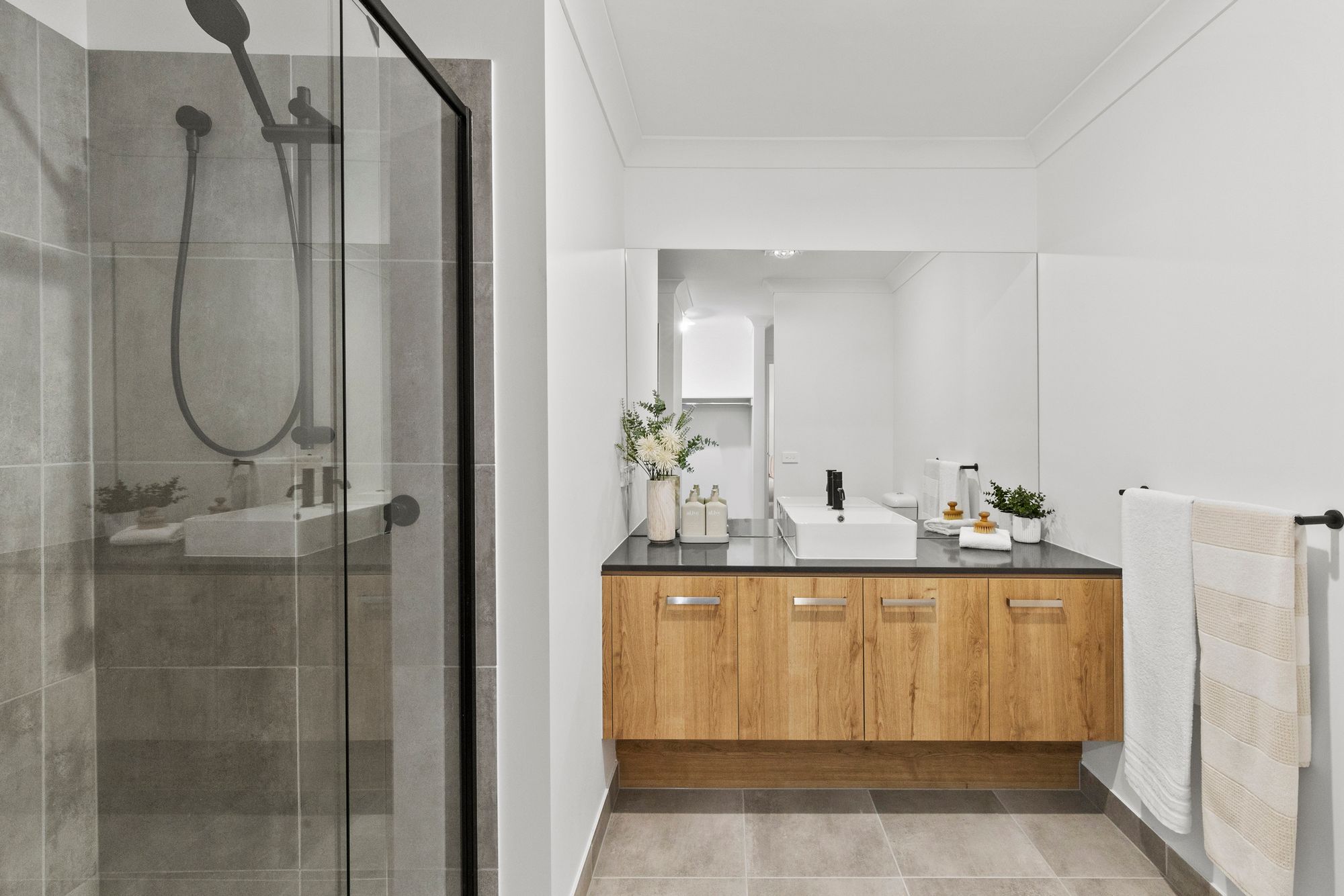 Master bedroom: upgraded carpet flooring, lux walk in robe, split-system heating & cooling, roller blinds, tv & data points, Ensuite; 20mm stone benchtop, single basin and large vanity, feature wooden cabinetry, extended semi-shower with niche & toilet, blacked fittings, hand held shower head, mirror splashback