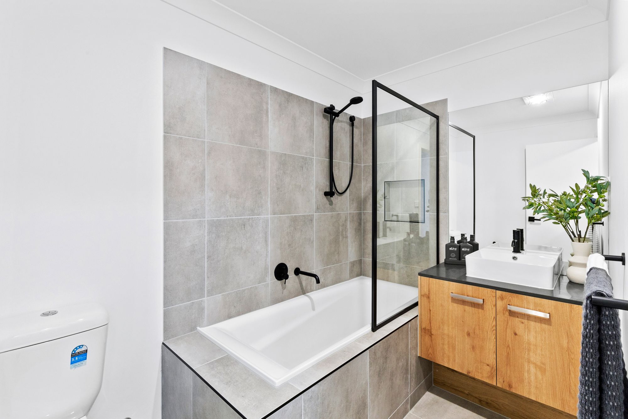 Main bathroom: 20mm stone benchtop, single basin and vanity with feature wooden cabinetry, bath-shower with niche, blacked fittings, toilet