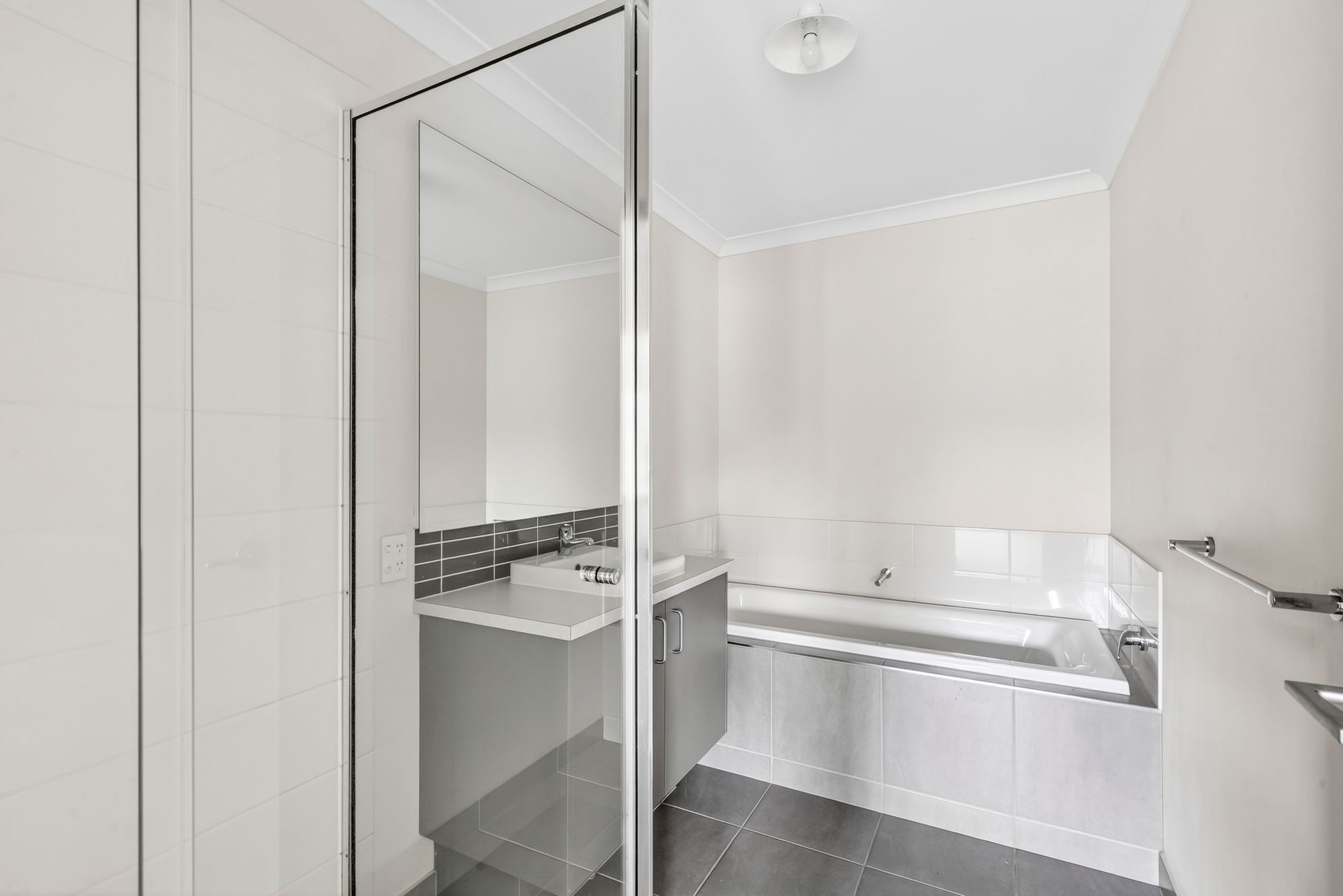 Main bathroom: Tiled, semi-frameless shower, single basin and vanity with storage and mirror splashback, bath, chrome fittings, separate toilet.