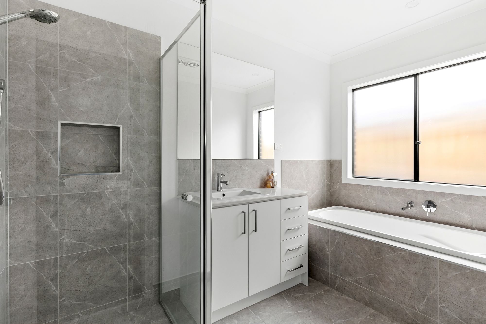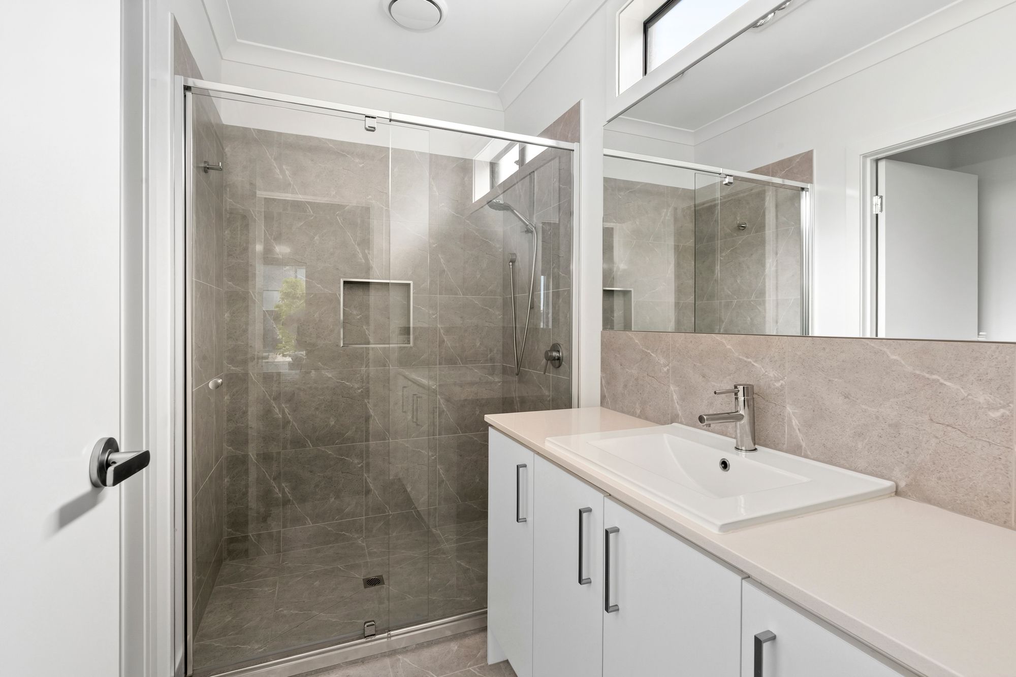 Main bathroom: ath, extended semi-frameless shower with niche, extended vanity with basin and mirror splashback, heat lamps, chrome fittings, frosted windows & separate toilet with exhaust fan.