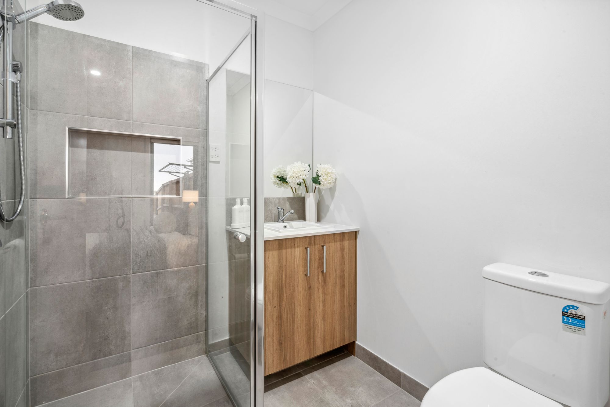 Master Suite: downlights, roller blinds, ducted heating, carpet floooring, ensuite with semi-frameless shower, tiles, shower niche, single basin and vanity, 20mm stone benchtop, mirror splash back & toilet.