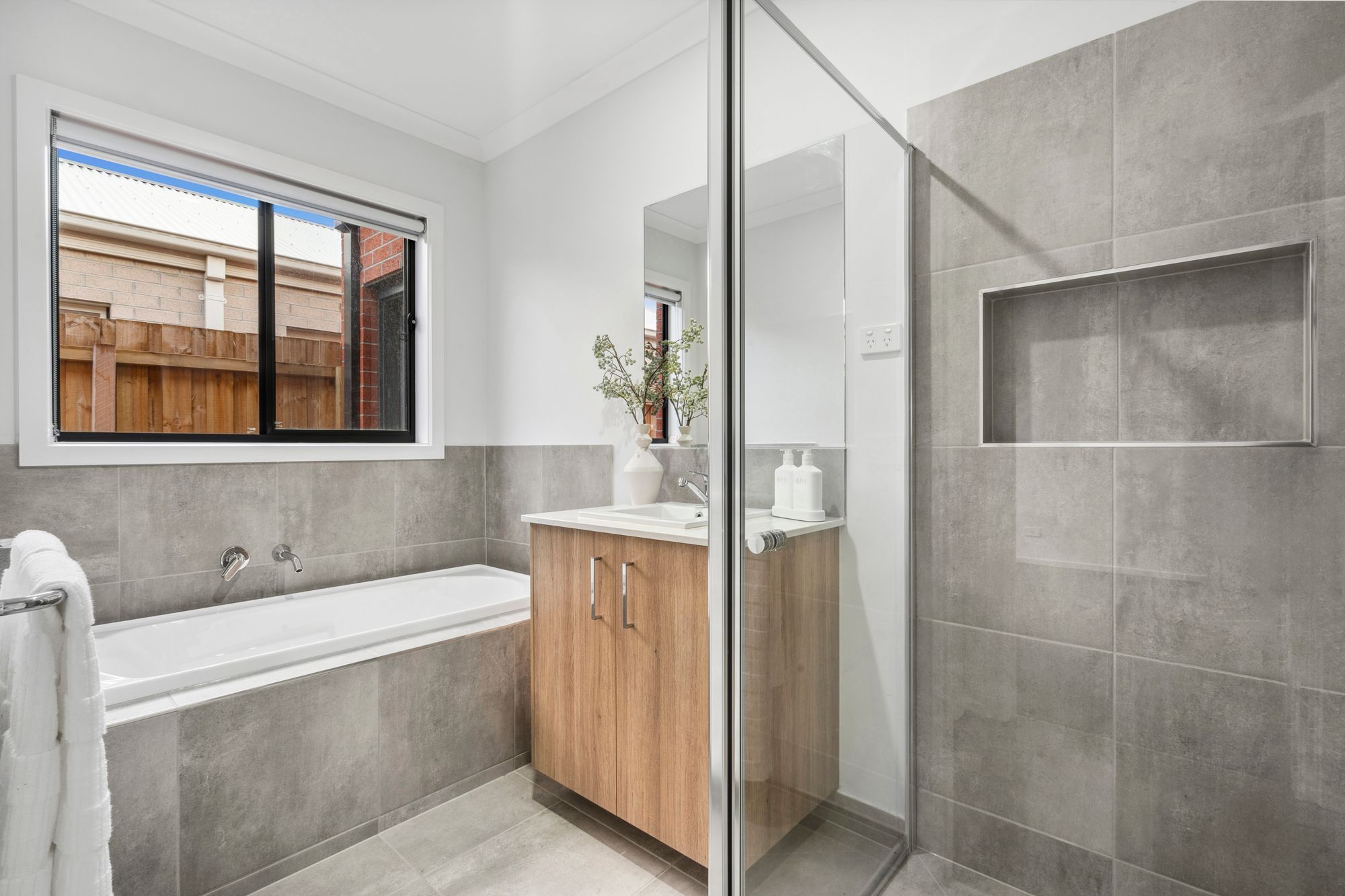 Main bathroom: semi frameless shower with niche, bath, tiles, basin and storage vanity, tile and mirror splash back, 20mm stone benchtop.