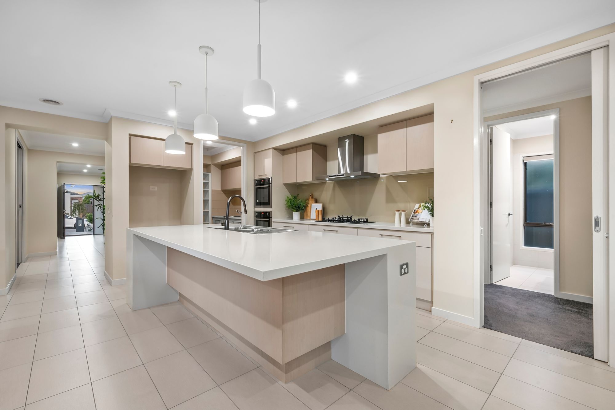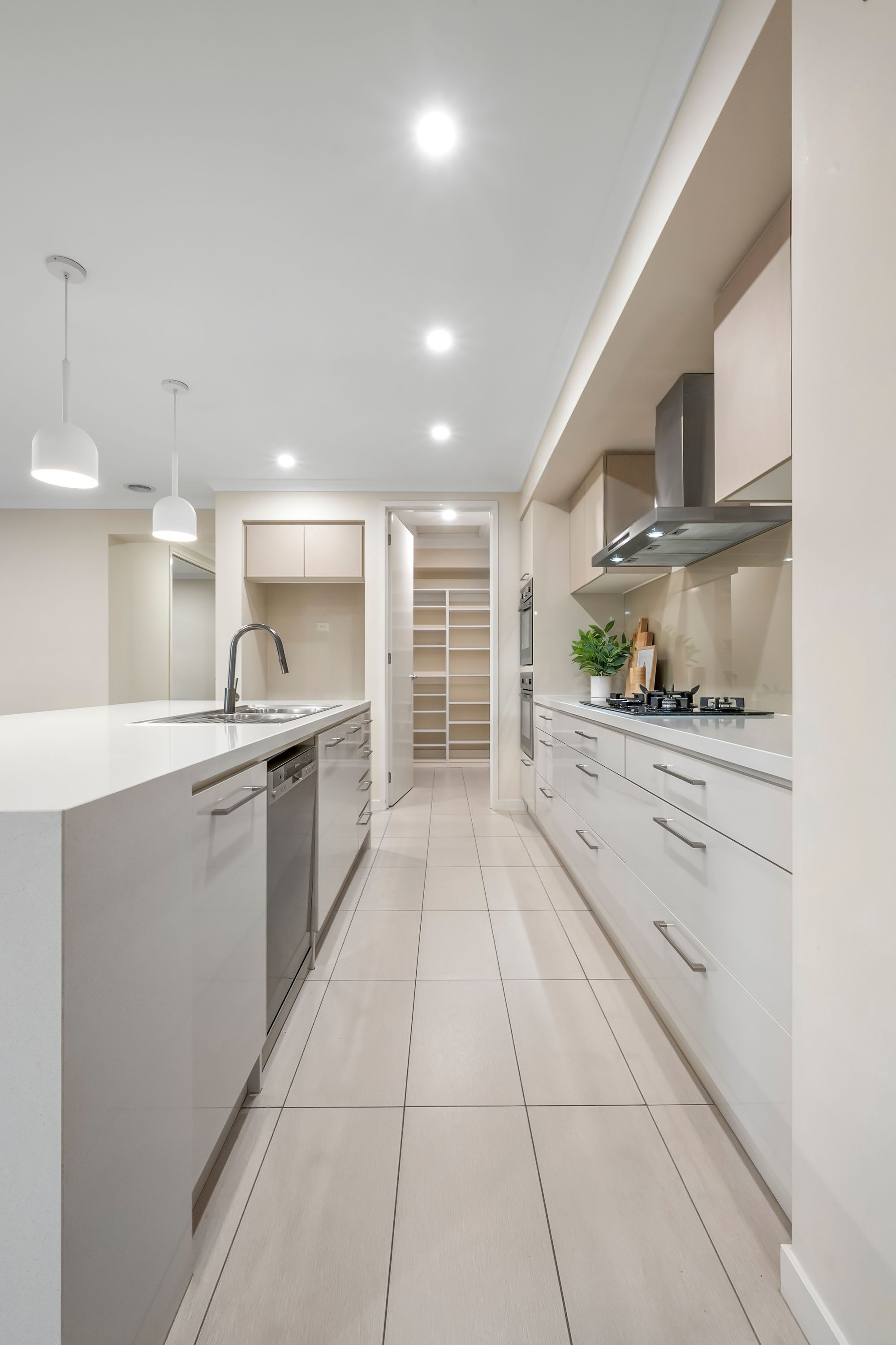 Tiled, 40mm stone benchtops, wide island bench breakfast bar with stone waterfall and power points, 900mm integrated gas cooktop & rangehood, dual wall ovens, drawer kitchen cabinets, overhead cabinetry, neutral glass splashback, pendant lighting, chrome fittings, dishwasher, fridge alcove with plumbed tap tap, high ceilings, downlights, Walk in butlers pantry; 20mm stone bench, downlights, ample shelving & cabinetry, drop sink and door entrance.
