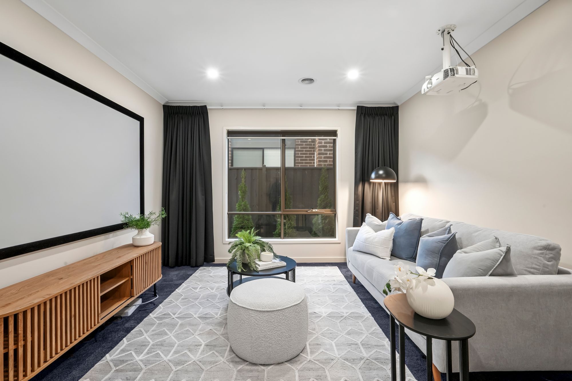 Secluded with dual cavity sliding doors, projector & 100″ screen, ducted heating, carpet flooring with upgraded underlay, sound mitigating insulation, roller blind & blackout curtains, down lights, double glazed windows