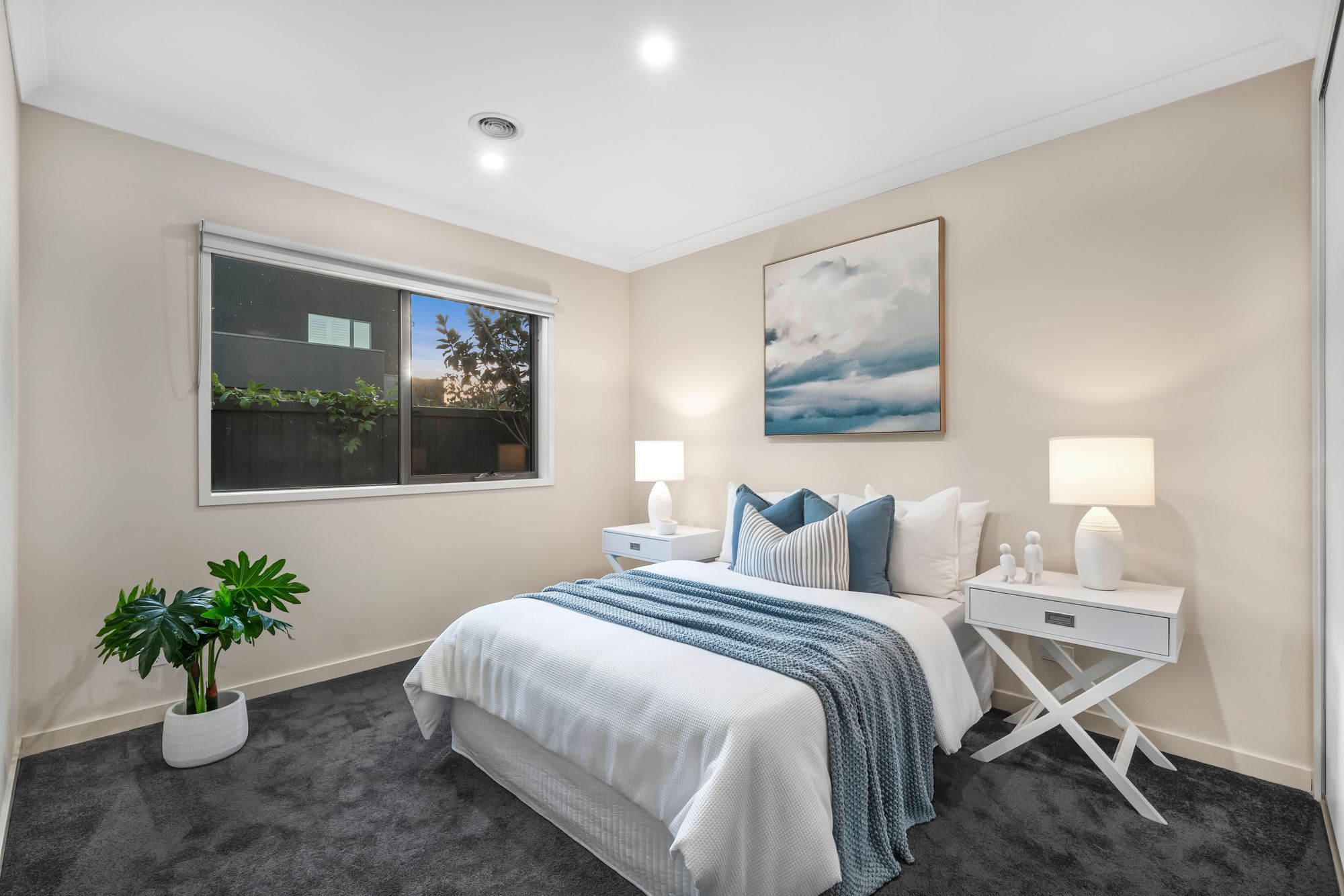 Carpet flooring with upgraded underlay, ducted heating, downlights, ceiling fan, split system heating and cooling, blackout roller blinds & blackout curtains, double glazed windows, luxe walk in robe fully fitted out with shelving, cabinetry & door, high ceilings, tv point, Ensuite; Double semi-frameless shower containing waterfall & dual hand held shower heads, shower niche, large mirror splash back, twin vanity with ample storage, 40mm stone benchtop, towel rail, chrome fittings, private toilet with door.