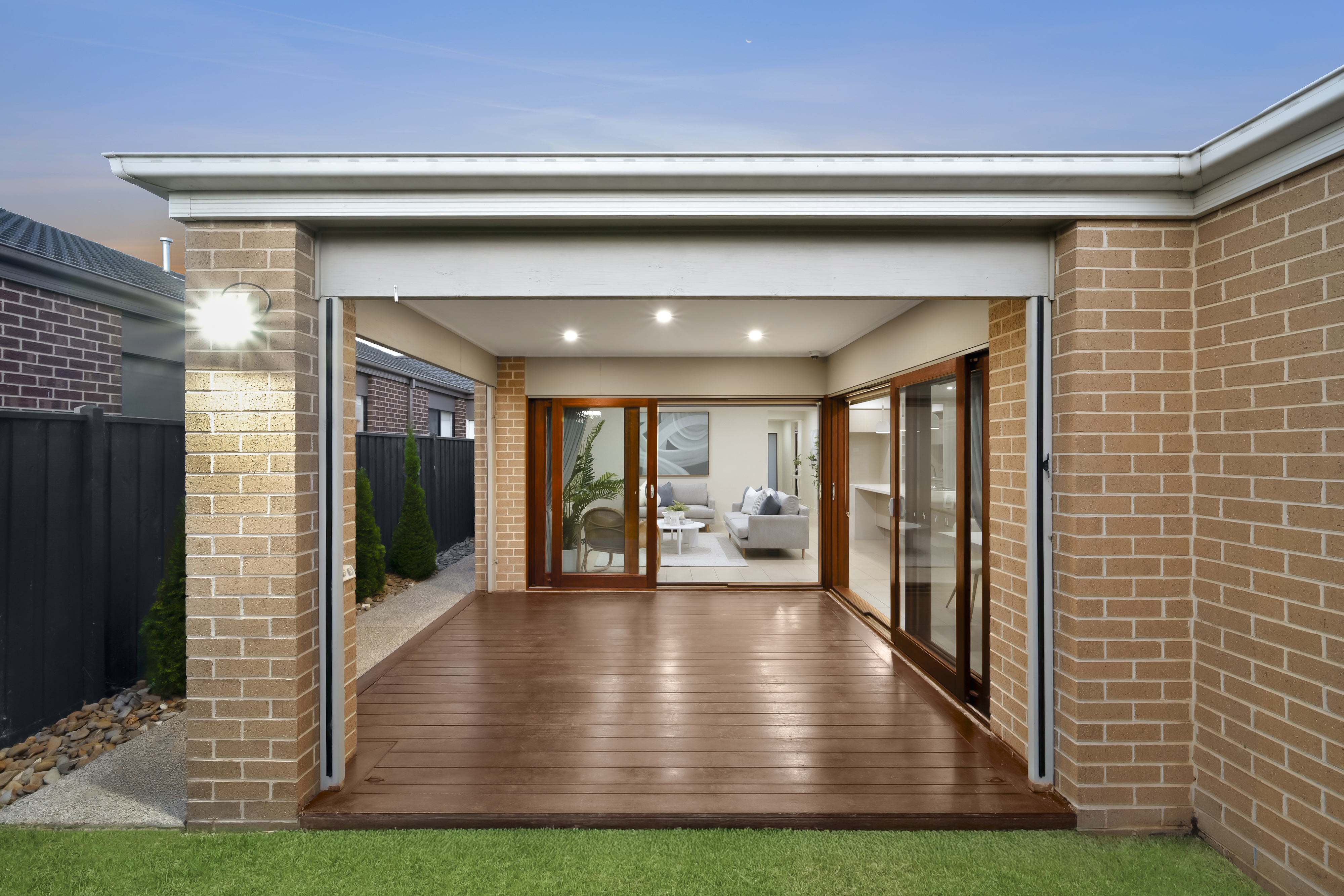 Well-maintained front yard with grass and established gardens, façade downlights, aggregate concrete driveway and path up to porch, backyard undercover decked alfresco with alfresco downlights, glass siding stacker doors to indoor, garden beds, established grass and hedging, low-maintenance backyard, garden shed