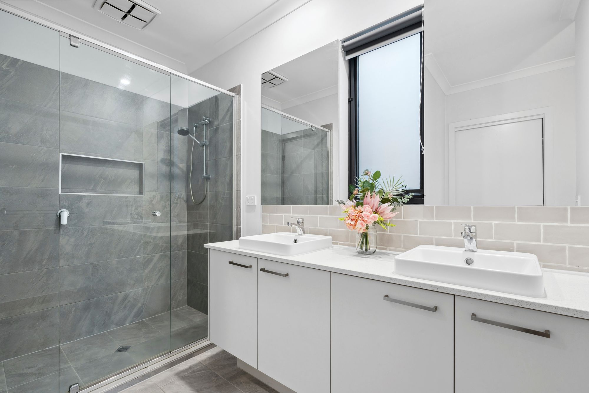 Master Suite: Generously sized and situated at the front of the home, it showcases a spacious walk-in robe and elegant ensuite. Complete with North-facing awning windows accompanied by day and night blinds, plush carpet underfoot, ducted heating and ceiling fan, creating a comfortable space year round. The gorgeous ensuite consists of a tiled shower with niche and wall-mounted/handheld showerhead, dual basin on a wide 20mm stone benchtop vanity with tiled/mirrored splashback, private toilet, downlights and frosted sliding window with blockout blinds.