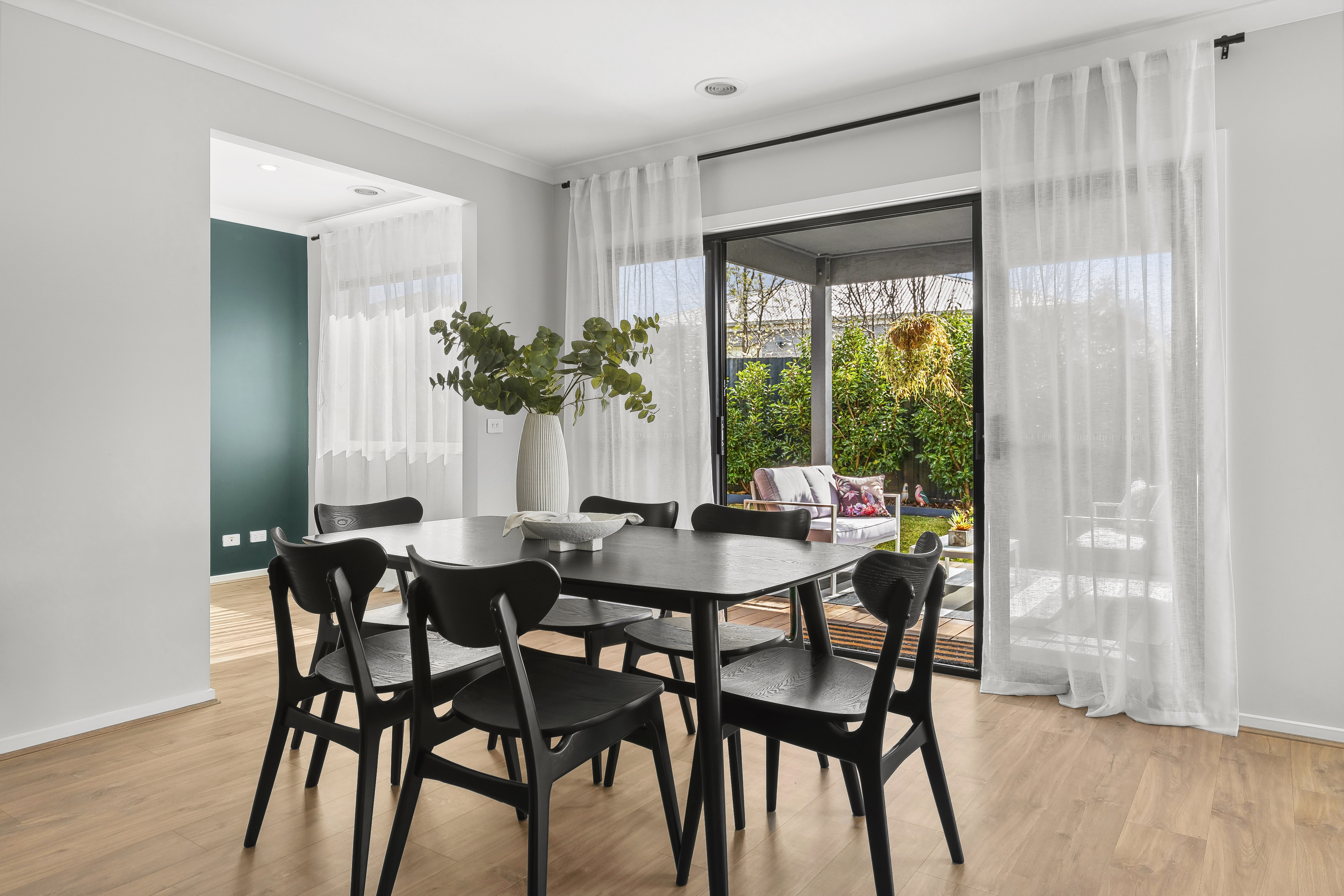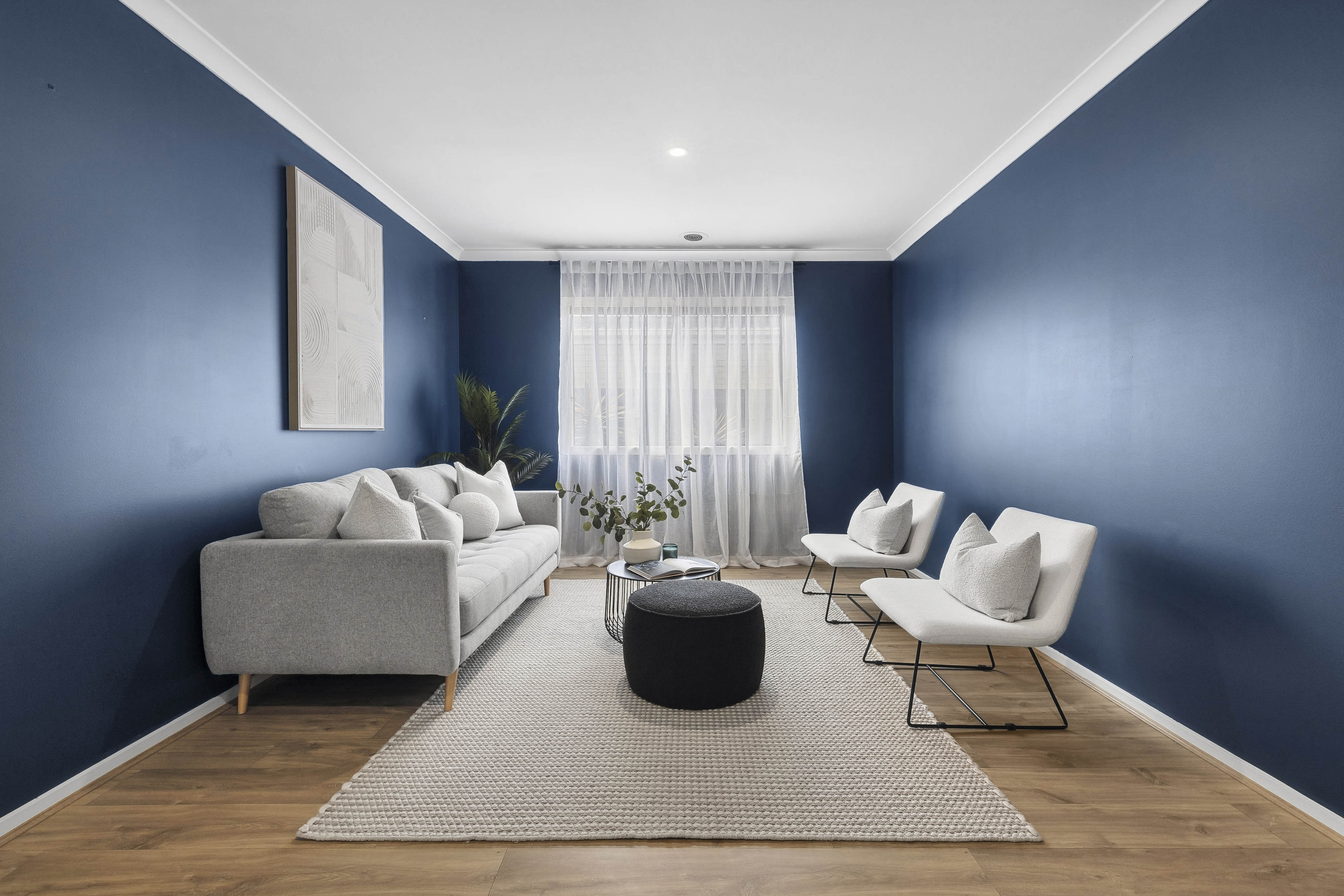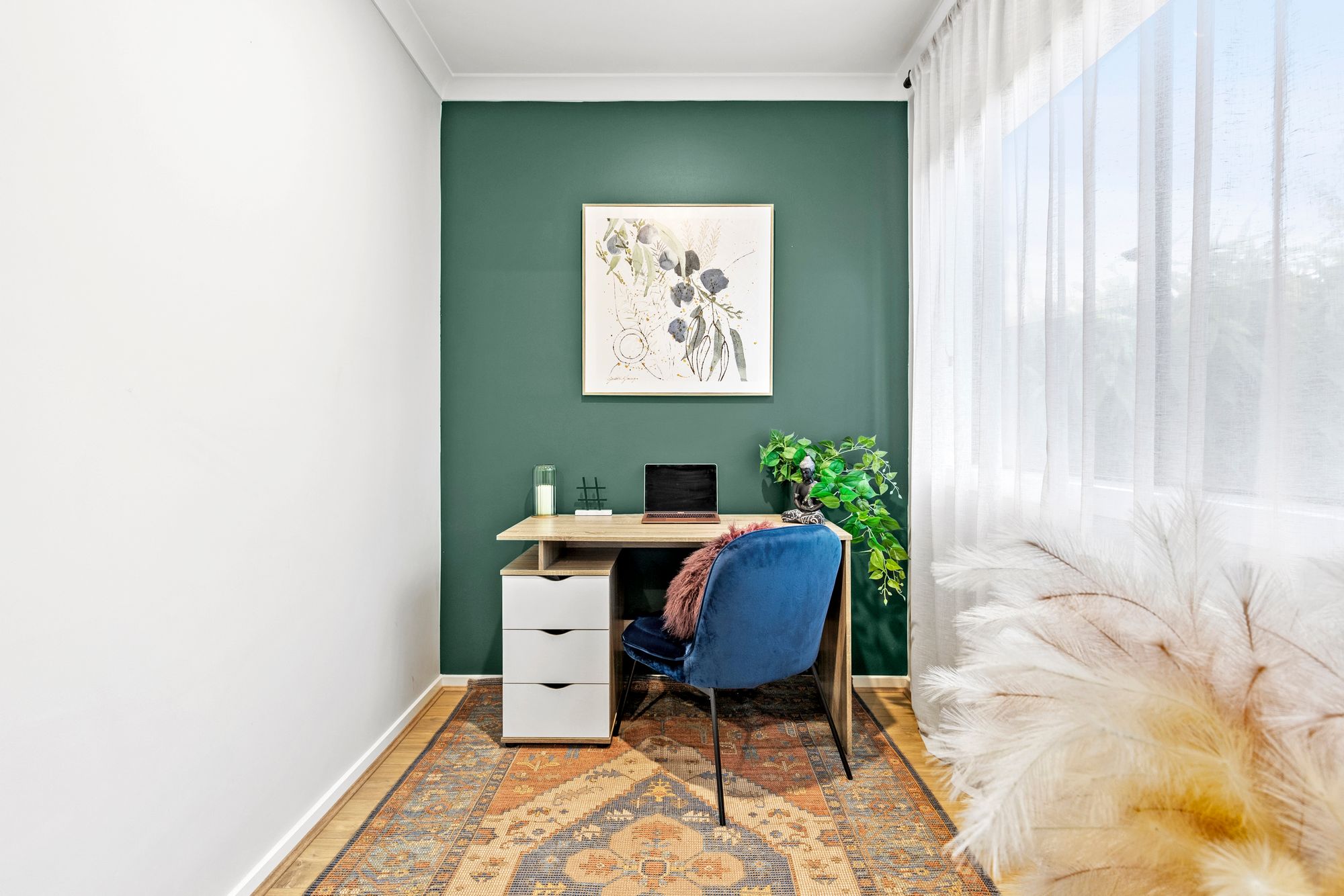 Separate Study: Downlights, timber laminate floorboards, window with sheer curtains & roller blinds