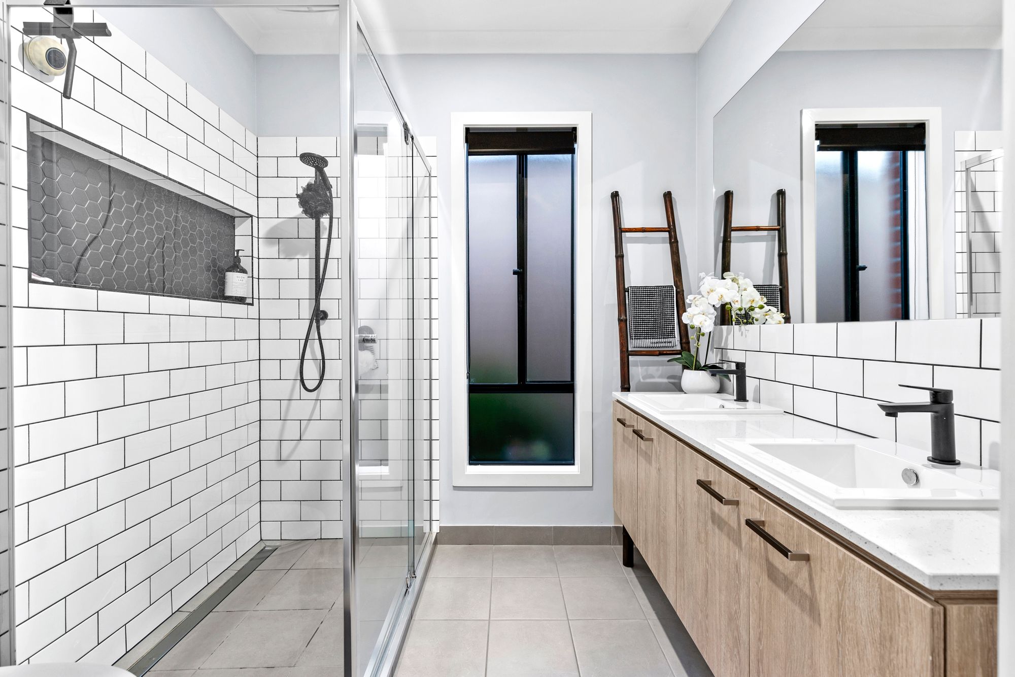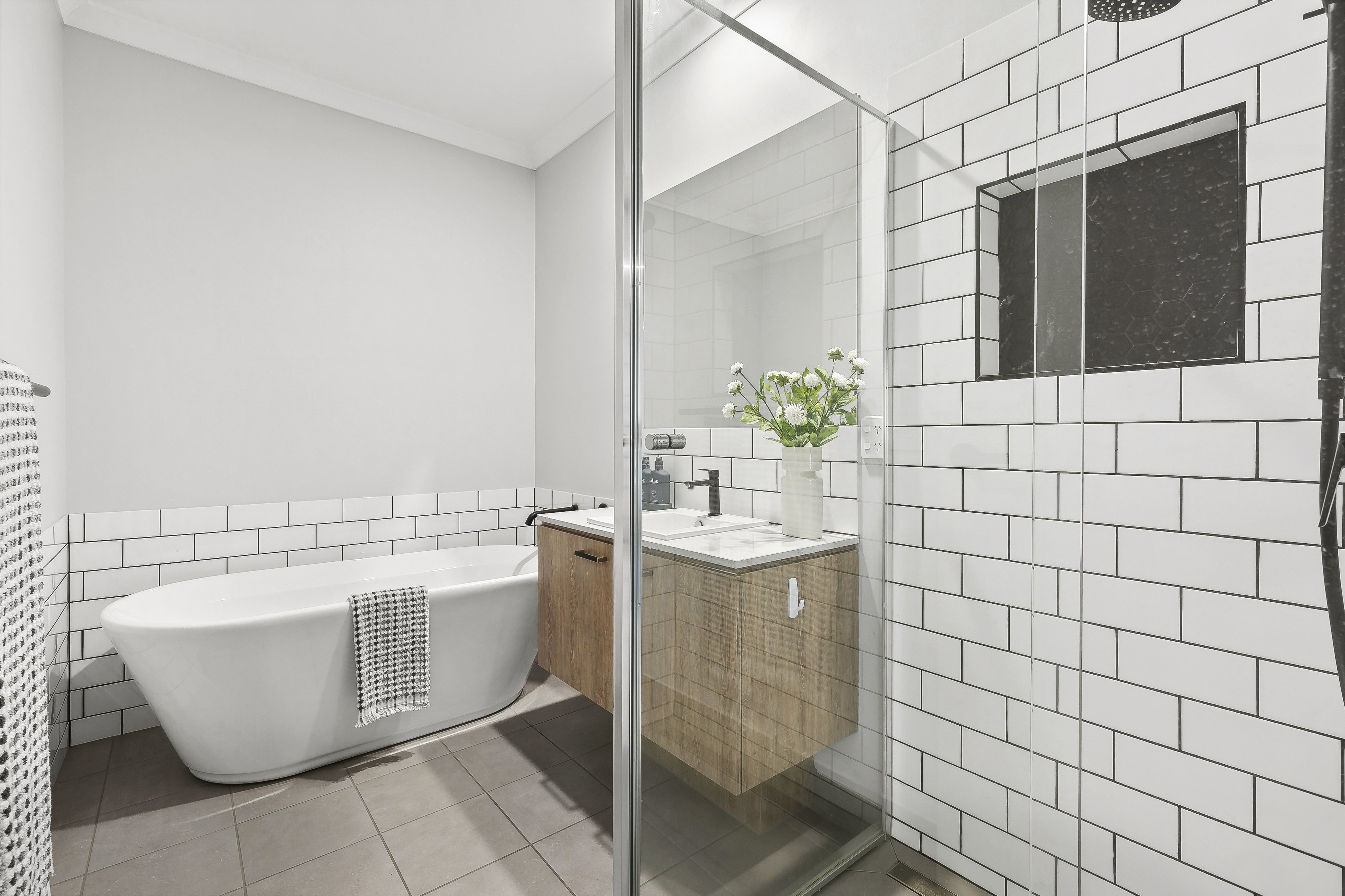Main bathroom: Freestanding bath, feature subway tiling, semi frameless shower with niche & handheld shower head, basin and vanity with mirror splashback, stone benchtops, black tapware