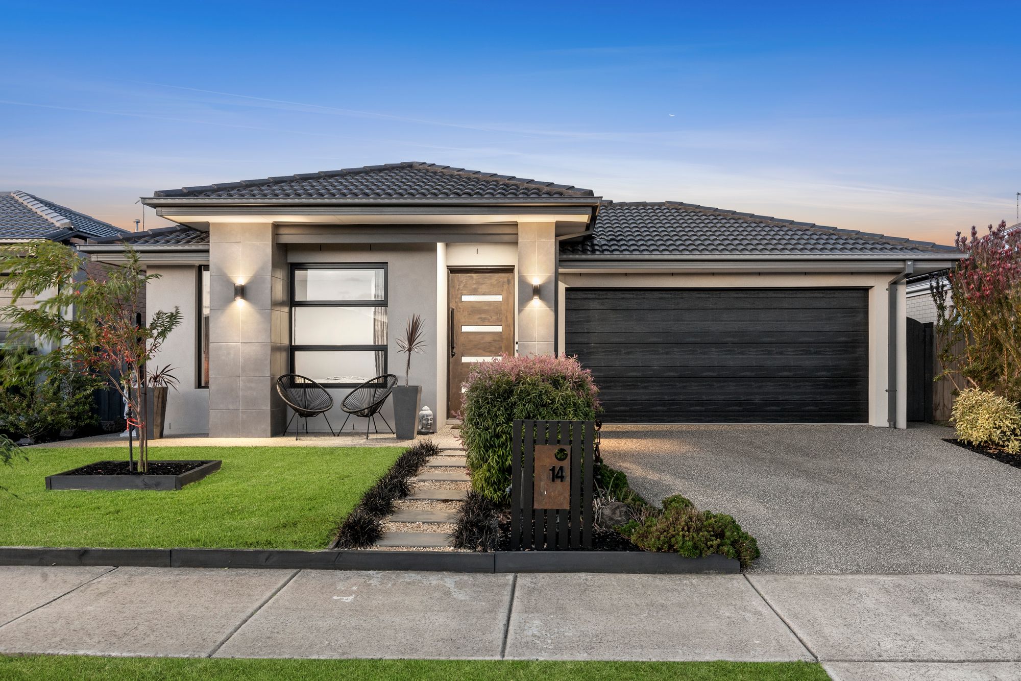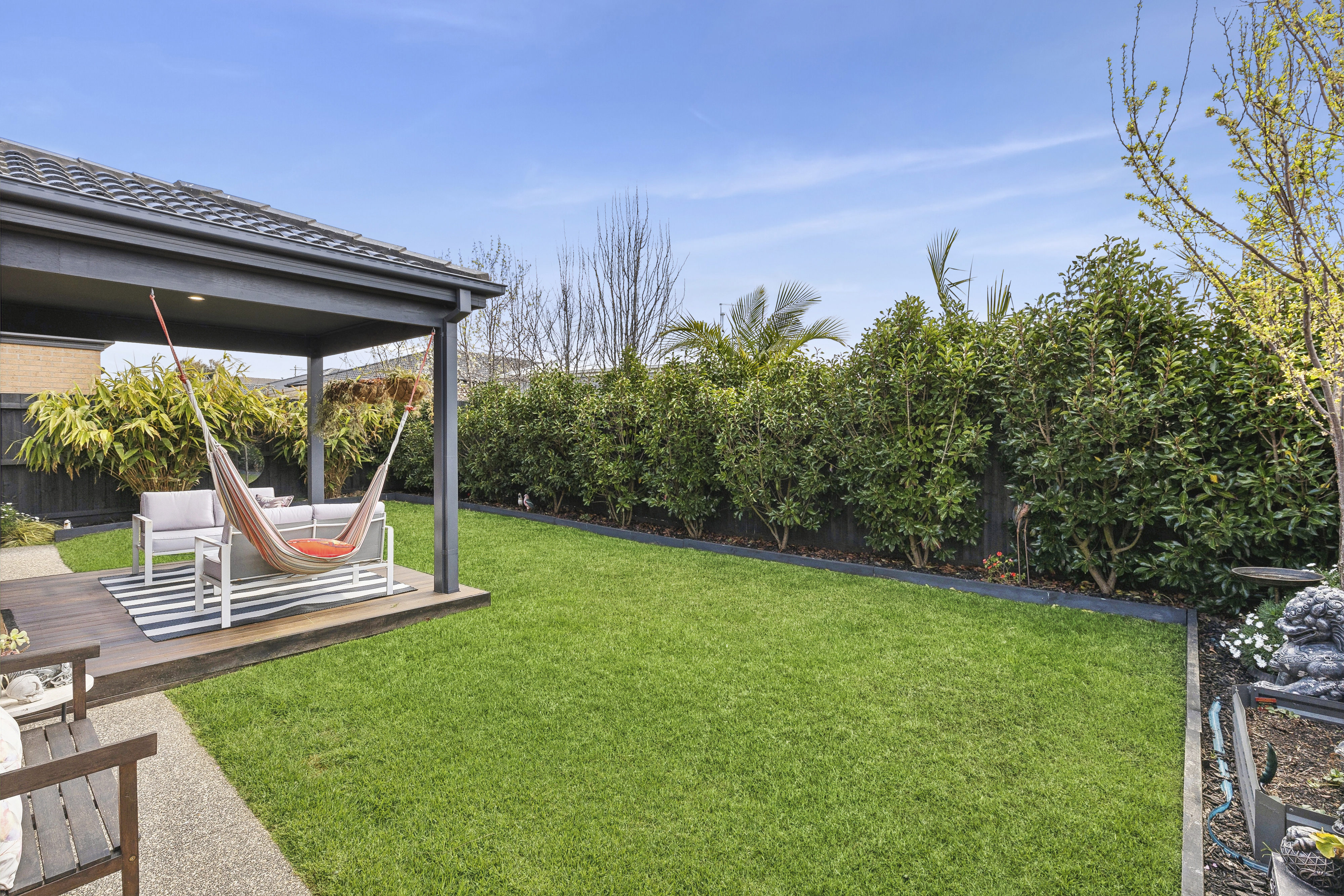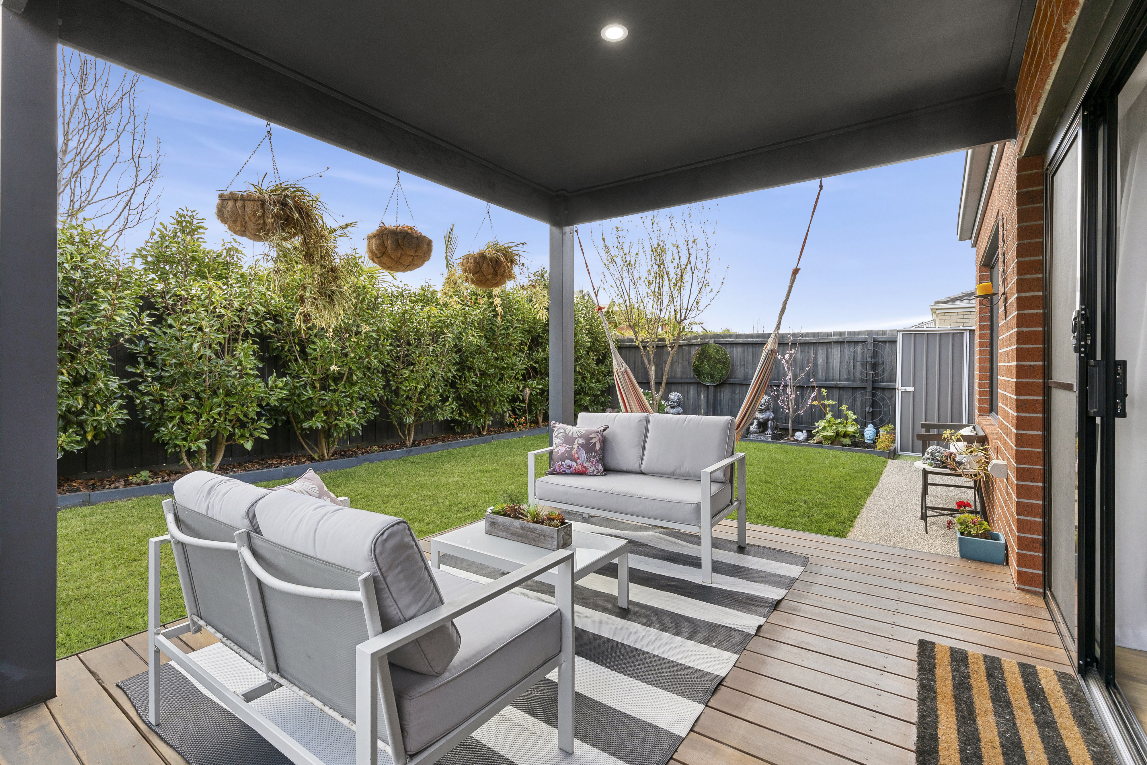 Outdoor: Well maintained front yard with grass and established gardens, feature façade lighting, beautiful streetscape, backyard undercover decked alfresco, glass siding doors to indoor, established grass and greenery, exposed aggregate concrete to single side gate access, low maintenance backyard