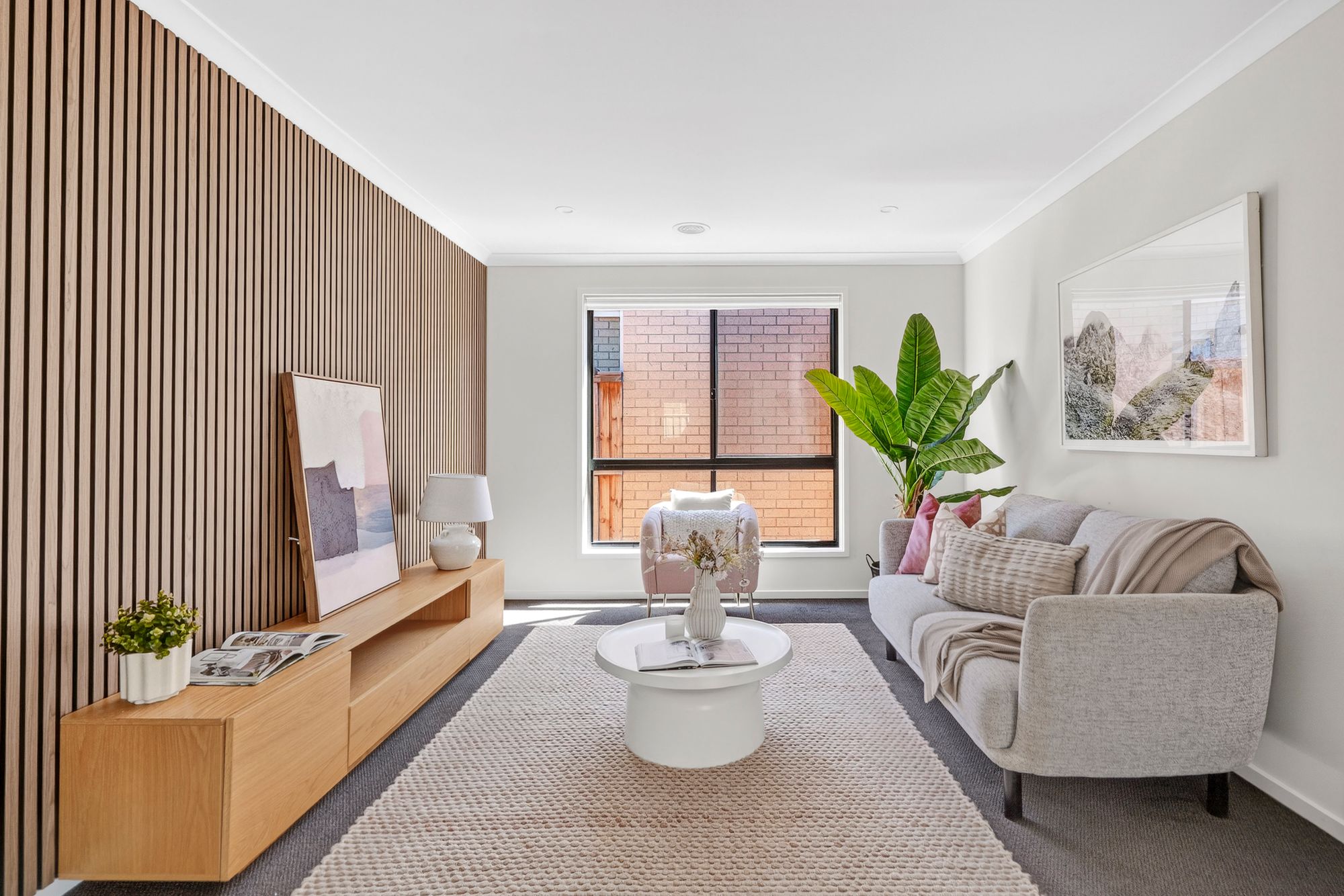 A second living area provides flexibility for a home theatre, kids’ zone, or cosy retreat, enhanced by ducted heating carpet flooring, roller blinds, and a stylish feature wall panelling.