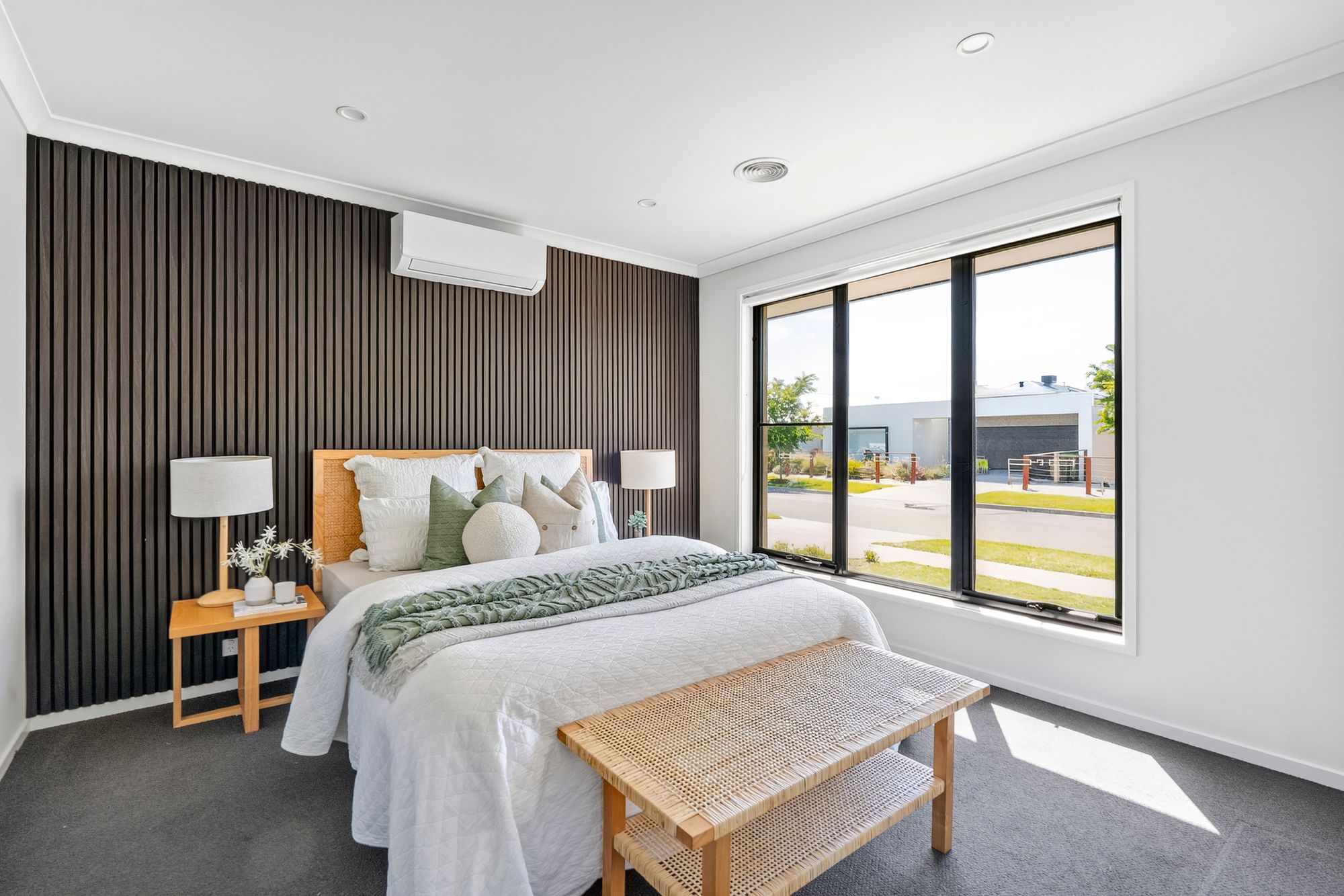 The master bedroom offers a peaceful retreat with ducted heating, a split system, large window that fills the space with natural light. Complete with carpet flooring and roller blinds and wall panelling this space balances comfort and privacy perfectly. The adjoining ensuite features a semi-tiled shower, black tapware, stone-topped vanity, mirror splashback, and toilet – all in a contemporary, elegant design.