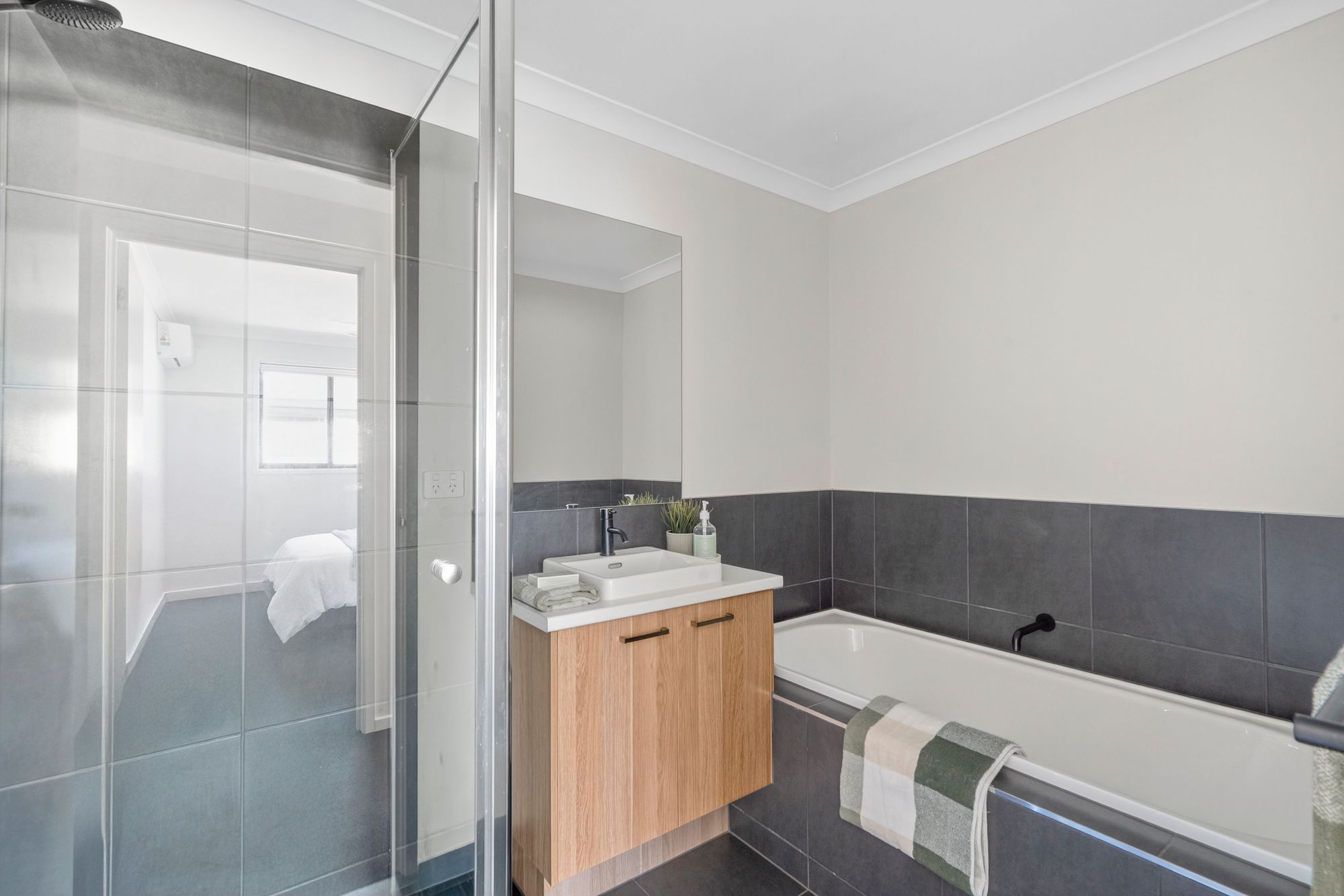 The main bathroom, located at the rear of the home, includes a semi-tiled shower, black fixtures, stone-topped vanity, mirror splashback, tiled bath, toilet and towel rack – blending function and style.