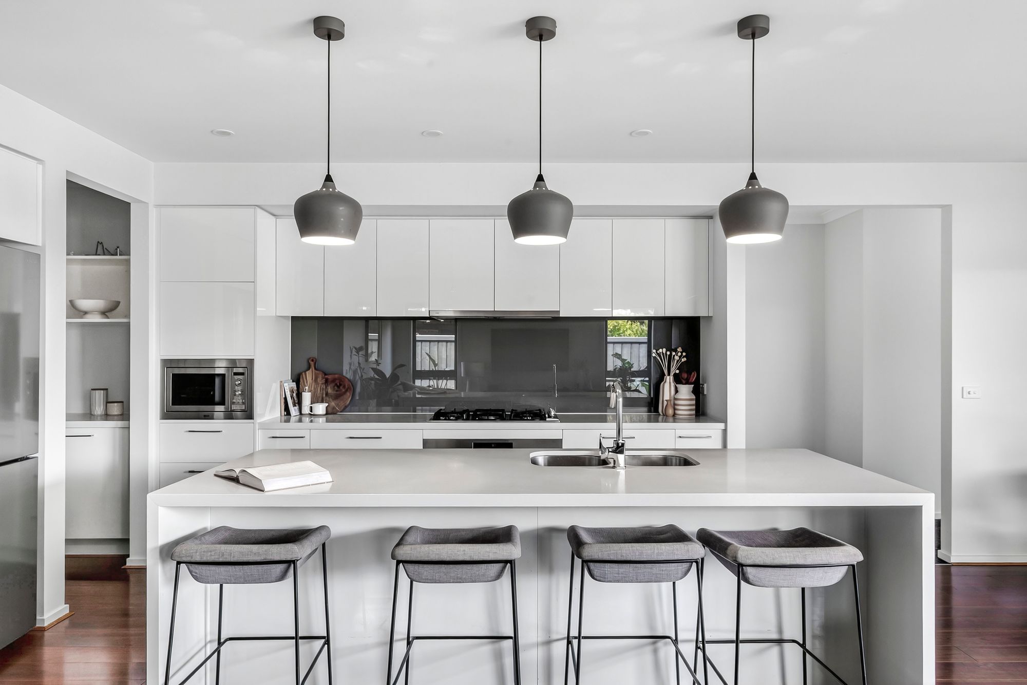 Kitchen: The heart of the home showcases luxury with 40mm stone waterfall benchtops to the island and matching stone to the rear bench, complemented by a sleek coloured glass splashback. High ceilings with square set cornices create a sense of space and sophistication, while timber look flooring adds warmth and style. The kitchen is equipped with a 900mm built-in oven and stovetop, pullout rangehood, double undermount sink, and large fridge cavity with water point. An incredible walk-in pantry with 40mm stone benchtops, additional shelving and cabinetry enhances functionality. Ambient downlights and pendant lighting elevate the space, and upgraded cabinetry with pot drawers and overhead storage, along with ducted refrigerative cooling and ducted heating, deliver year-round comfort and convenience.