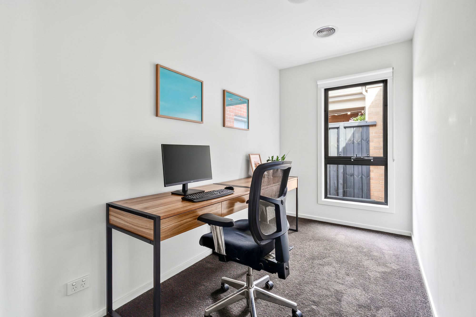 Additional Living Space: Positioned at the rear of the home, this versatile second living space offers the perfect retreat for relaxation. It features high ceilings, plush carpet, as well as ducted heating and refrigerative cooling for complete comfort. Wide double glazed windows with roller blinds and sheer curtains fill the room with soft natural light. The additional study includes high ceilings with square set cornices, plush carpet, ducted climate control, downlights, and a double glazed window, making it ideal for working from home or study needs.