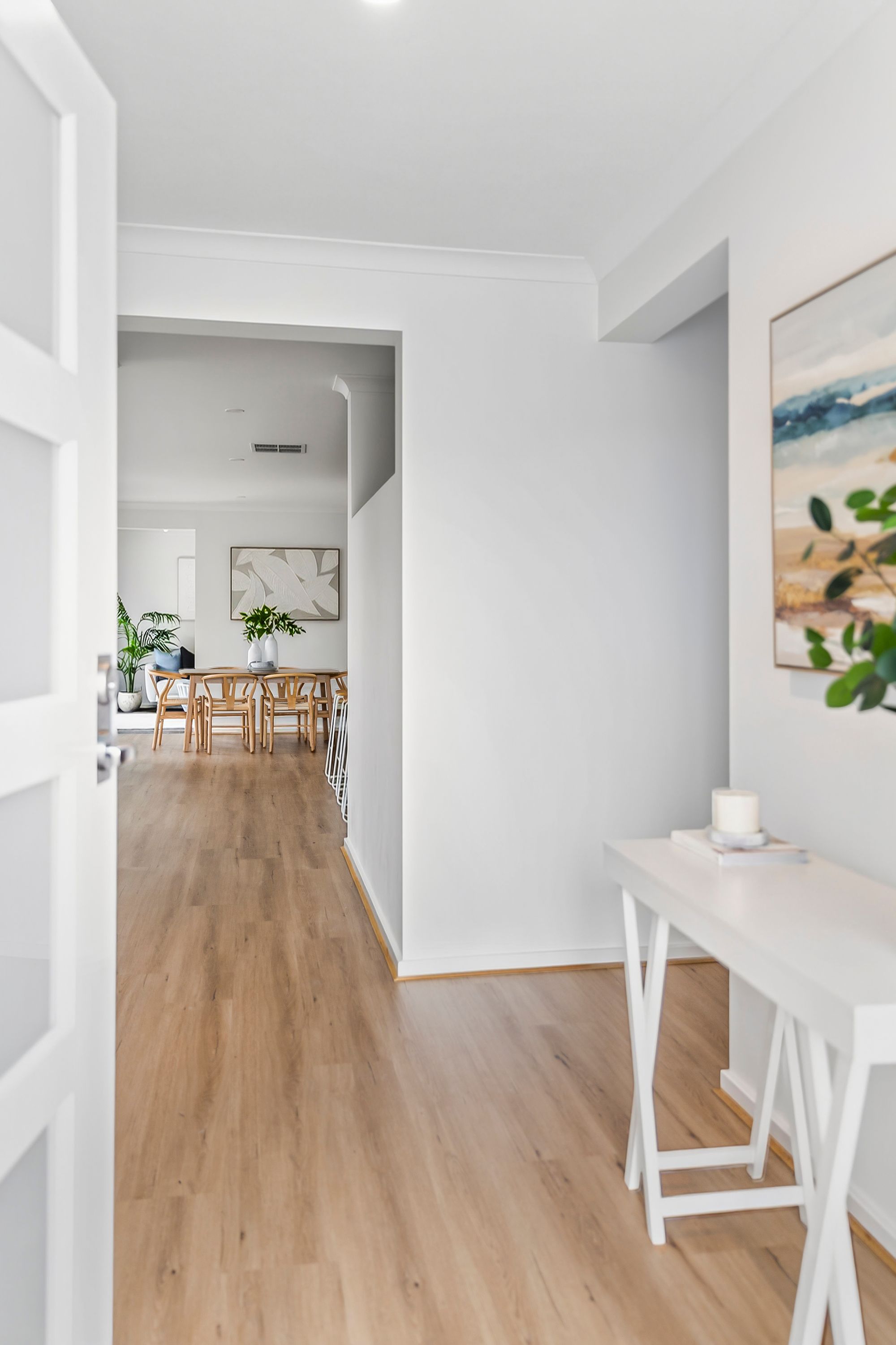 Living/Dining: Open plan with sliding doors to undercover alfresco, ample natural light, large windows, roller blinds, downlights, evaporative cooling, ducted heating, hybrid flooring.