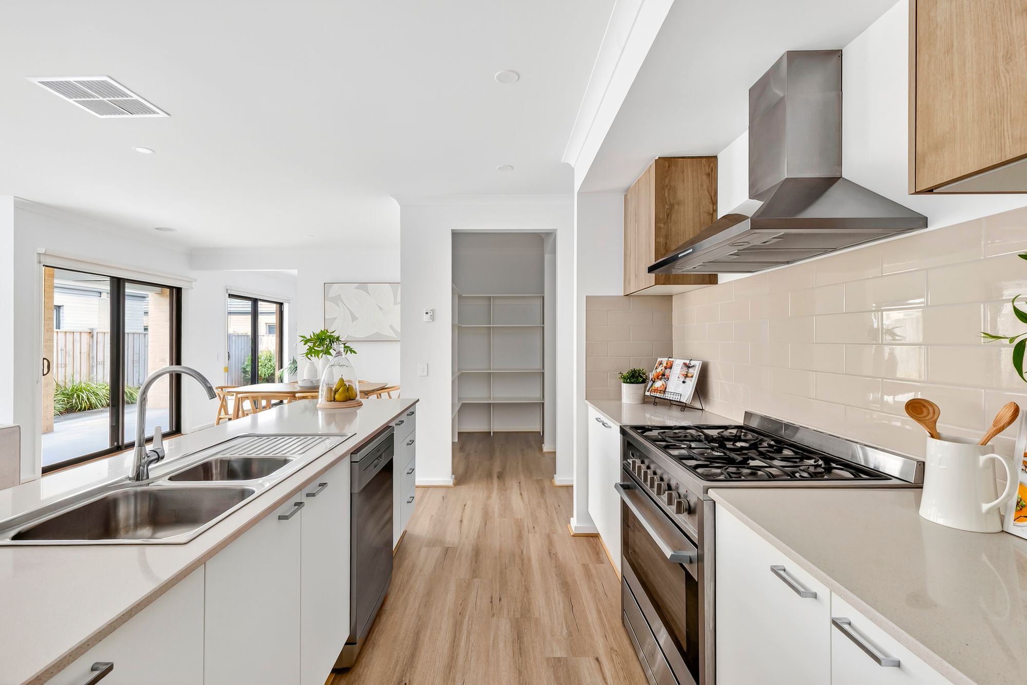 Kitchen: 20mm stone benchtops and breakfast bar, large walk in pantry with plumbed fridge cavity and powerpoints, dual sink with chrome tapware, 900mm gas cooktop & rangehood, oven, tile splashback, dishwasher, microwave cavity, ample storage & overhead cabinetry, downlights & hybrid flooring.