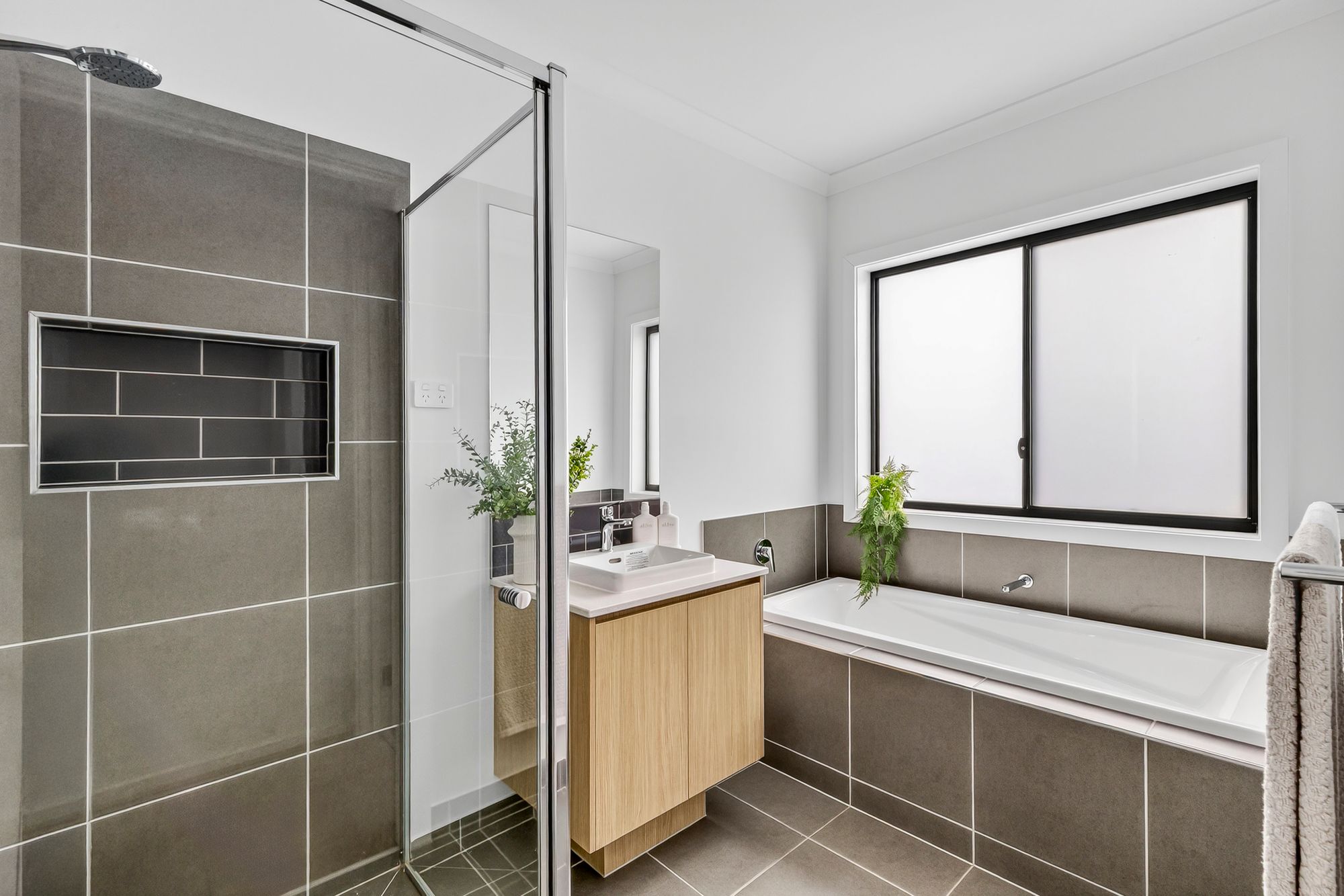 Main Bathroom: 20mm stone benchtop, bath, semi frameless shower with niche, single vanity with mirror splashback, frosted window, chrome fittings & separate toilet.