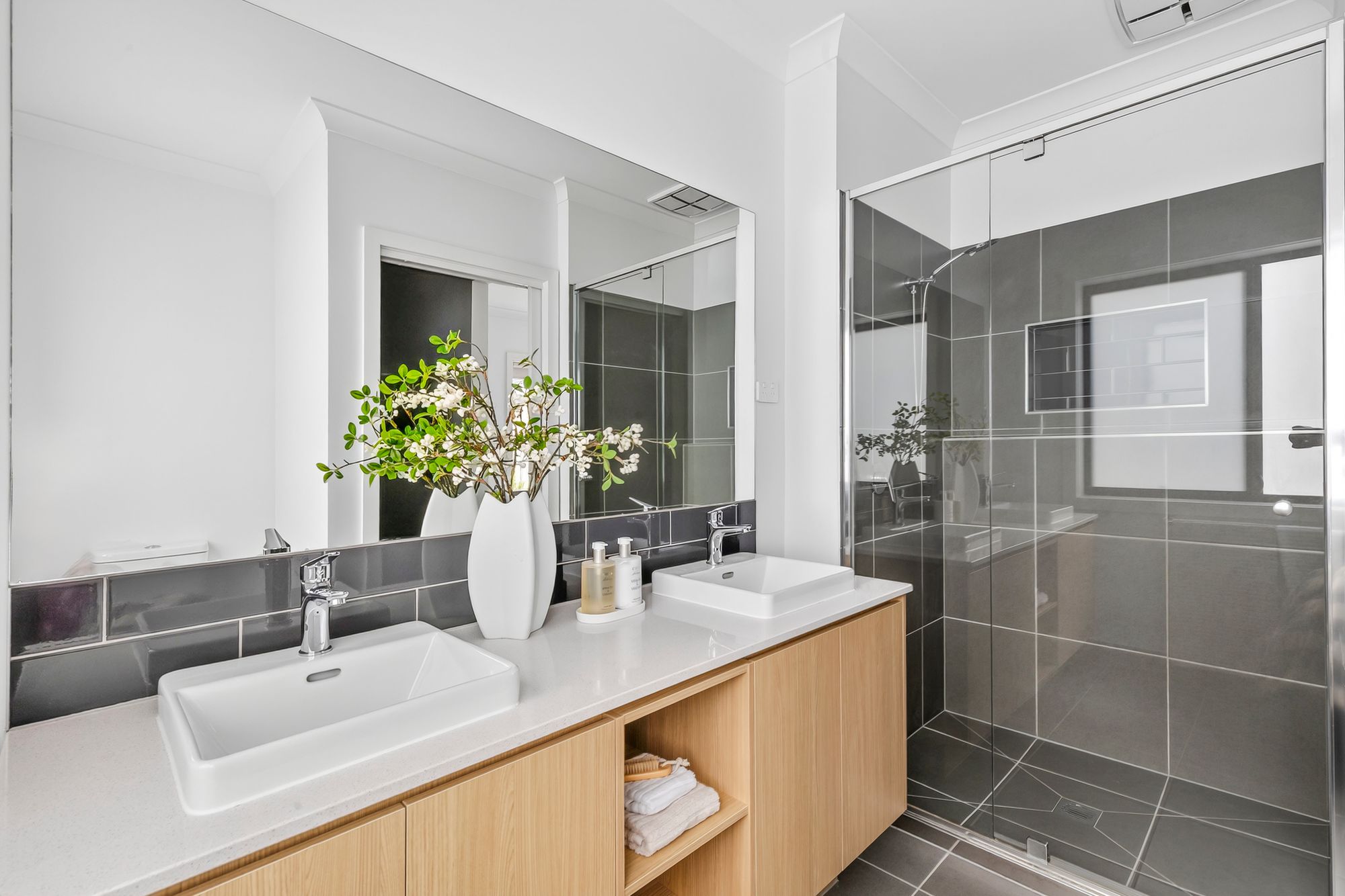 Ensuite: Extended semi-frameless dual shower with niche, hand-held shower head, 20mm stone benchtop, dual vanity and basins, mirror splashbacks, chrome fittings & open toilet.