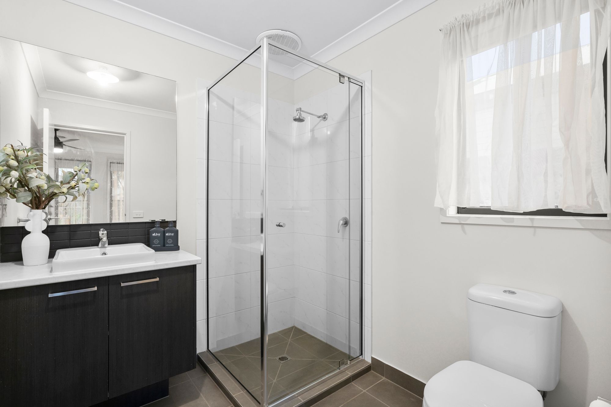 Ensuite: Semi-frameless shower, single vanity with ample storage, window, sheer curtain, open toilet, tiles.