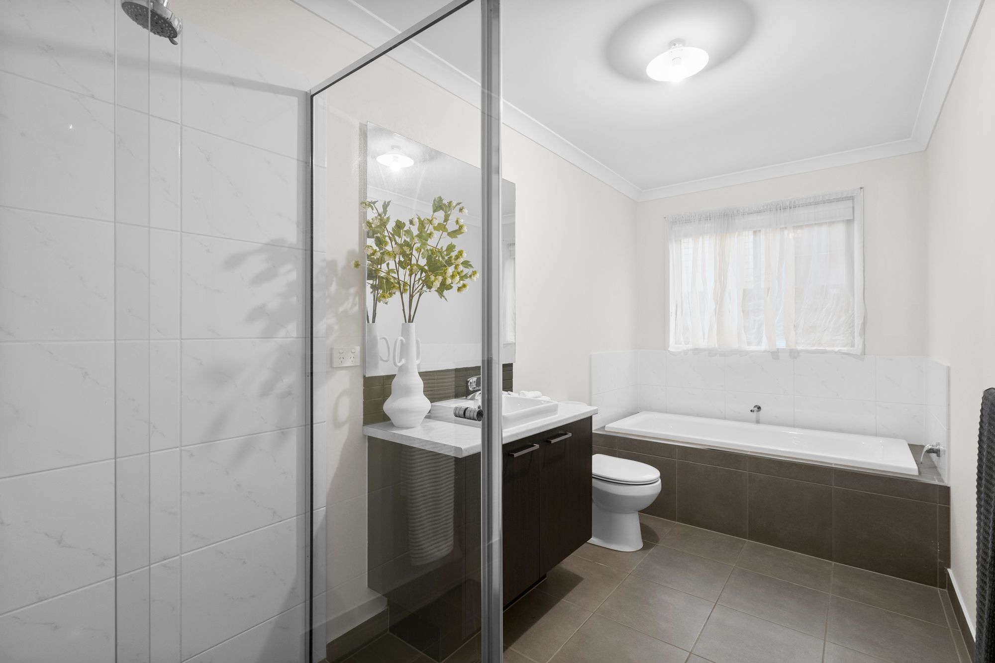 Main bathroom: Semi-frameless shower, bath, tiles, towel rack, single vanity with ample storage, roller blinds, open toilet.