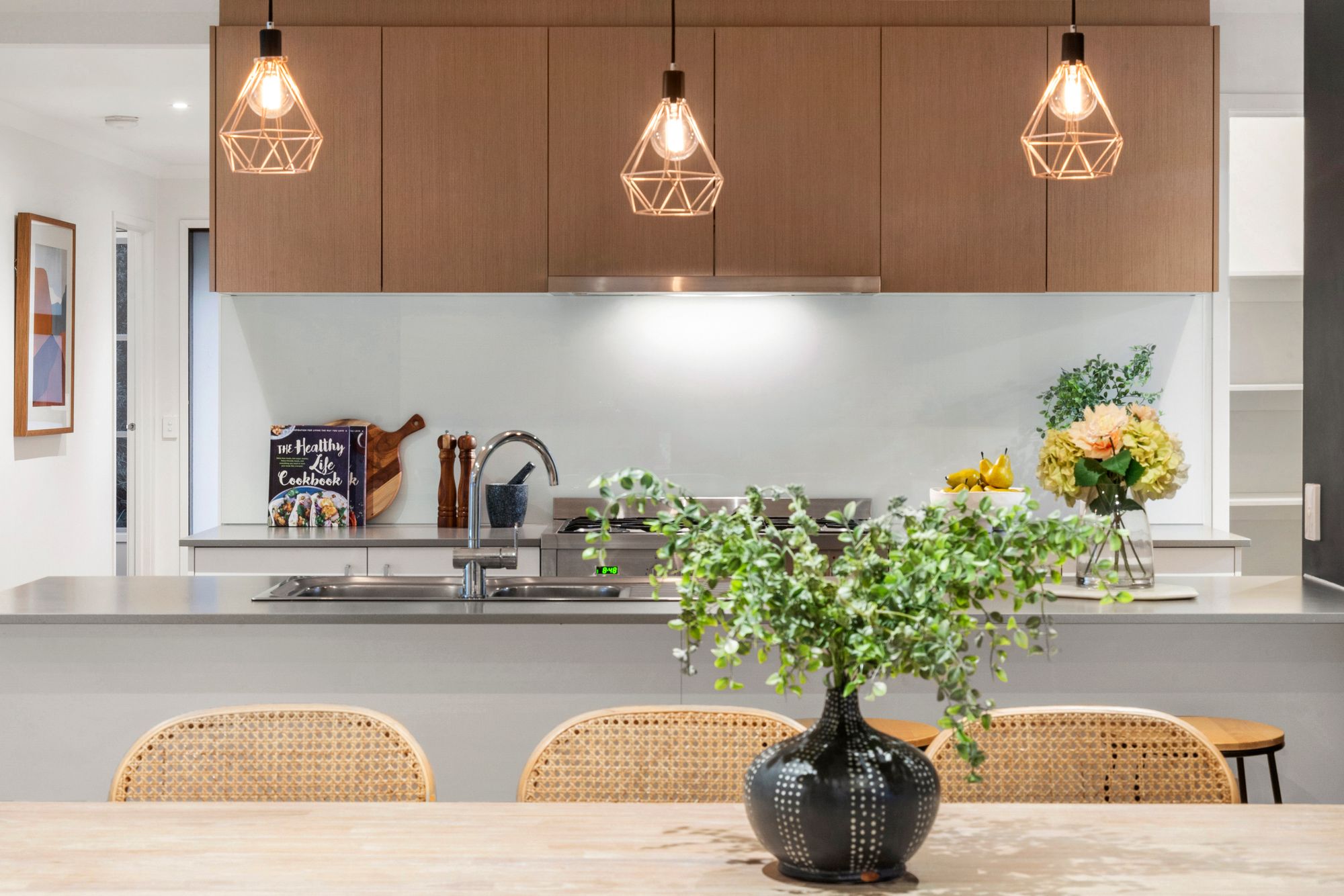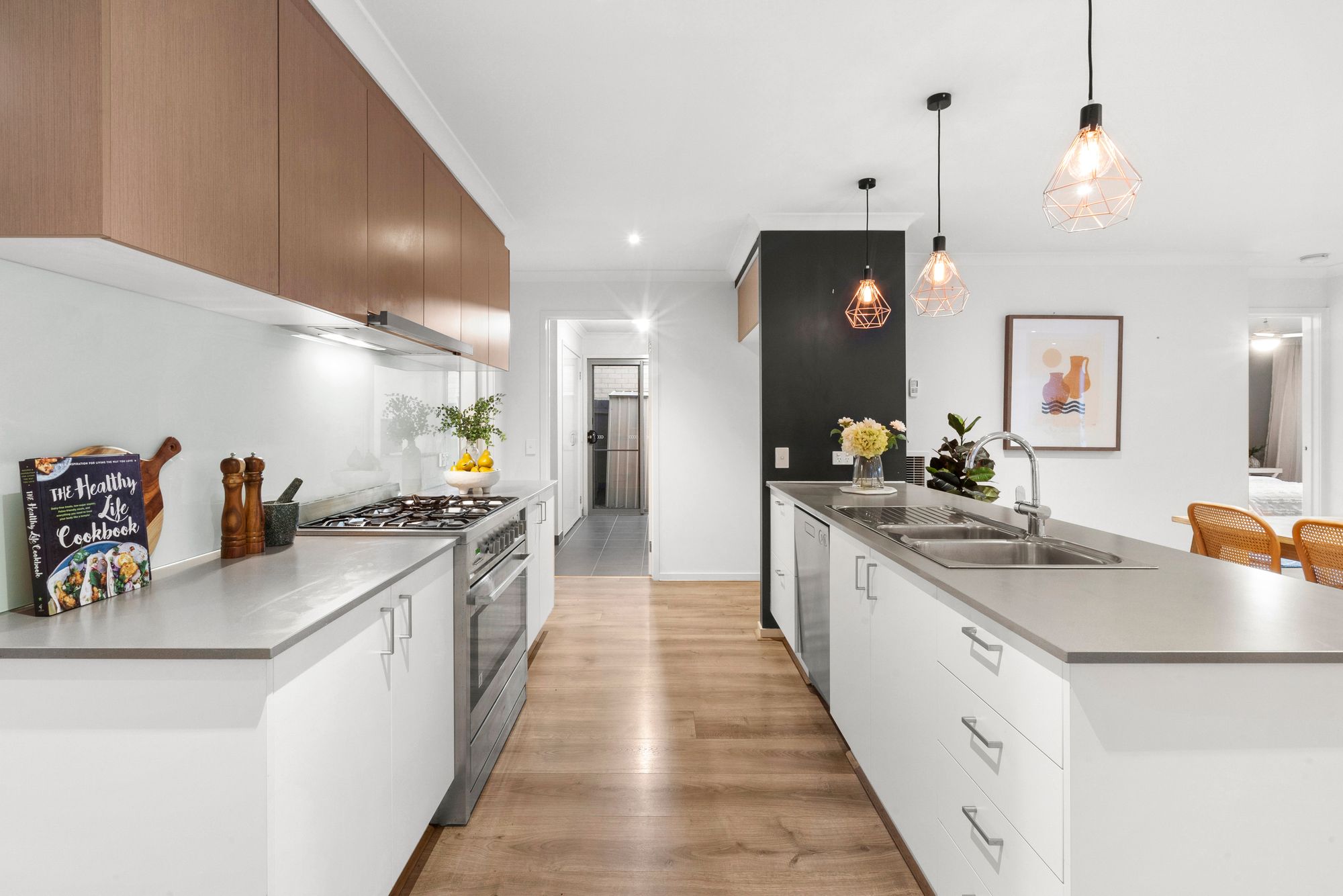 Kitchen- timber laminate flooring, 20mm stone bench tops, island bench with breakfast overhang, pendant lights, 900mm stainless steel appliances including dishwasher, overhead cabinetry, extensive walk in pantry fitted out with shelving and cavity sliders