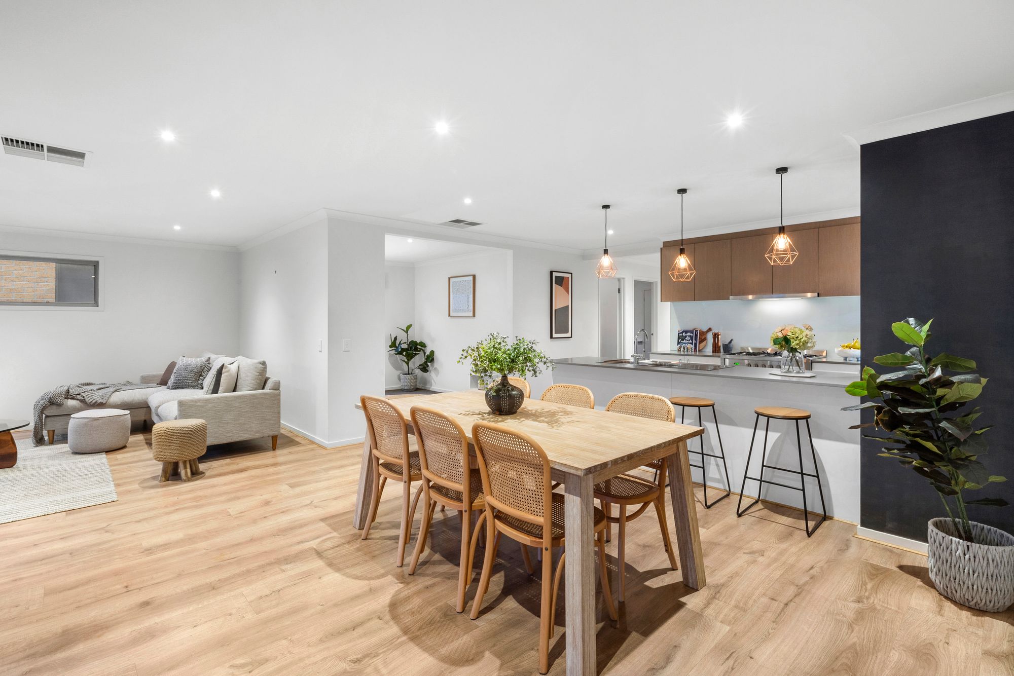 Living- open plan kitchen/ living/ dining, spacious, down lights, timber laminate flooring, evaporative cooling, ducted heating, roller blinds, glass sliding doors to outdoor alfresco creating an indoor/ outdoor entertaining flow and glass sliding doors directly to backyard