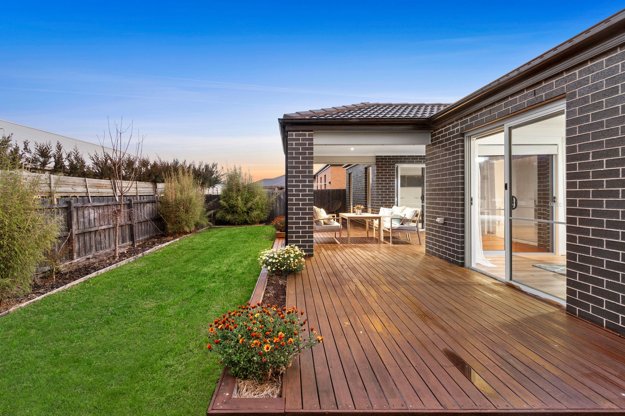 Outdoor- large outdoor undercover alfresco with timber deck spanning the width of the house, spacious backyard with grass area, low maintenance plants