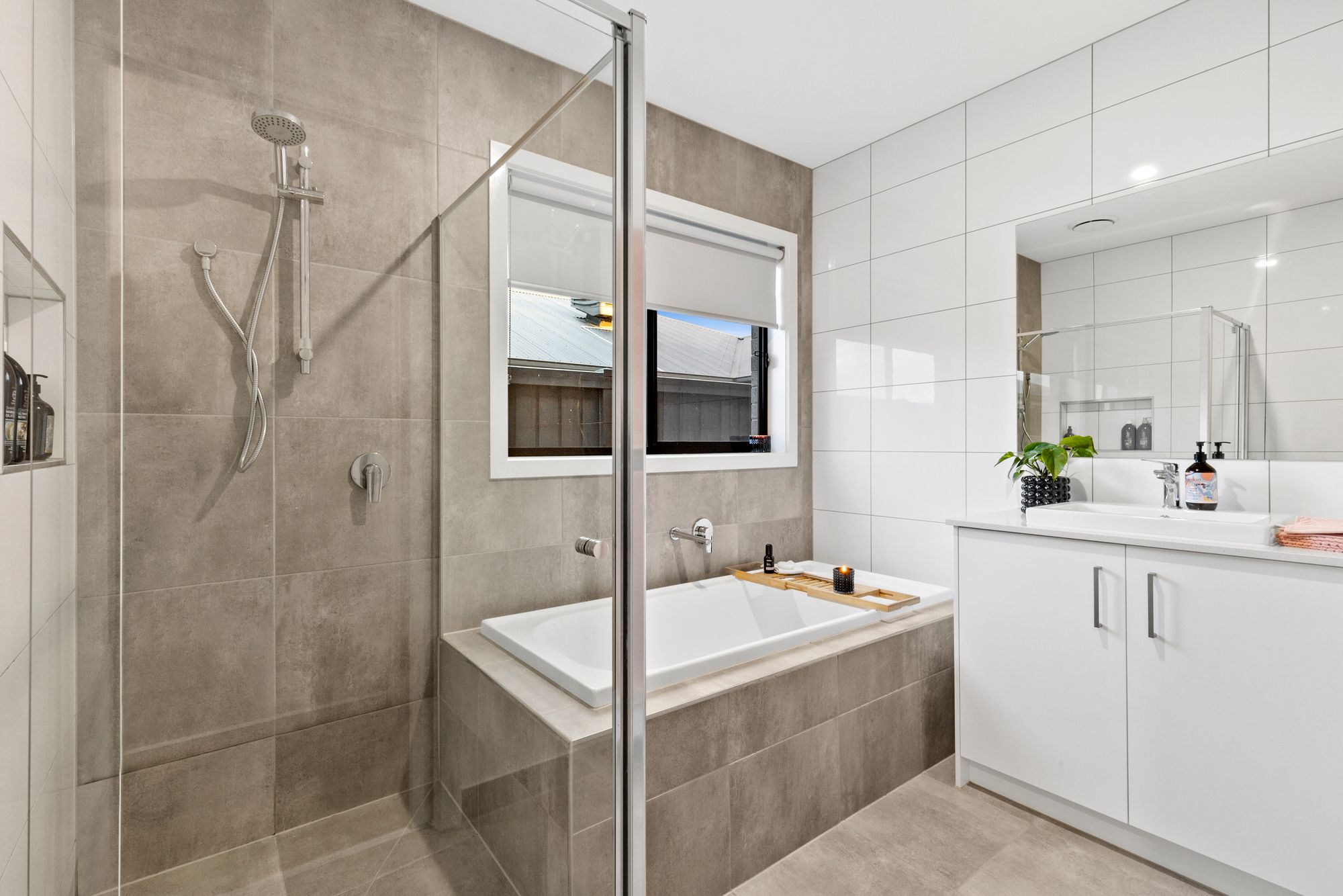 Main Bathroom: Floor to ceiling tiles, semi-frameless shower with handheld shower head and niche, stone benchtop with single vanity, mirror splashback, bath & separate toilet