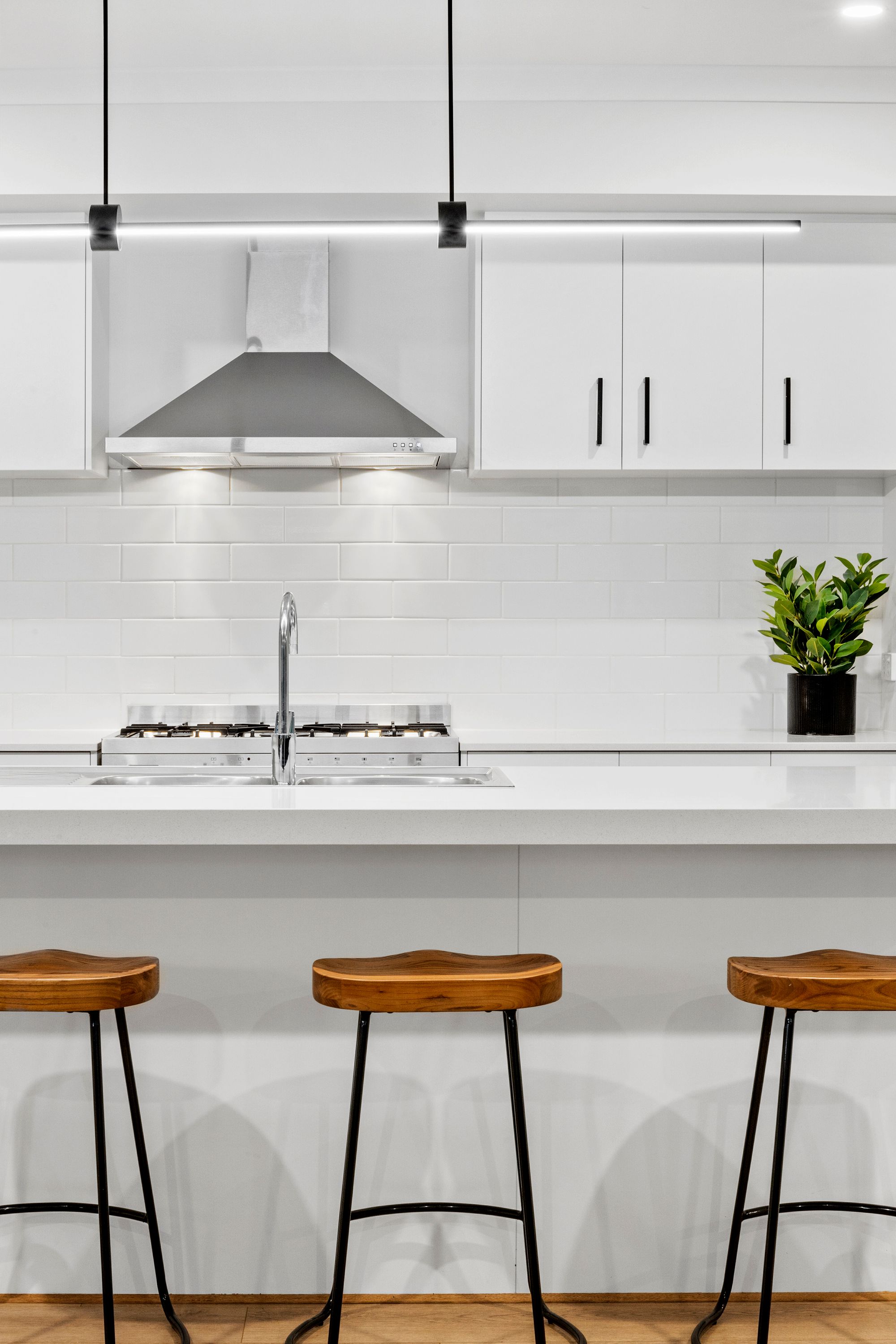 Kitchen: 900mm gas cooktop and oven, 60mm stone island benchtop with breakfast overhang, timber laminate flooring, double sink, contemporary linear pendant light, microwave cavity, dishwasher, overhead cabinetry, black finishes, downlights, ample storage, extensive pantry