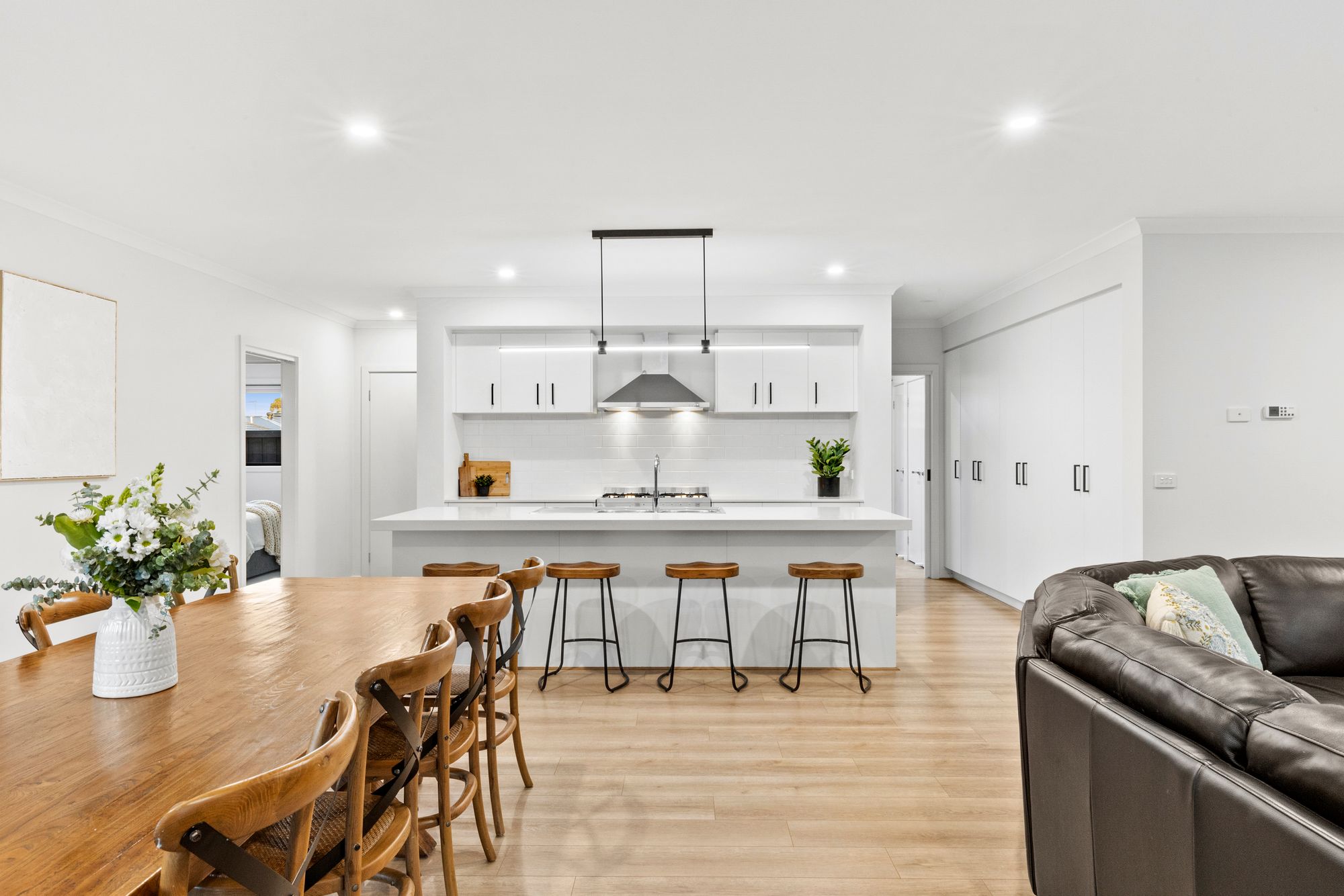 Living: Open plan kitchen/ living/ dining, timber laminate flooring, down lights throughout, ducted heating, large windows allowing for overflowing natural light, roller blinds, sliding doors through outdoor alfresco