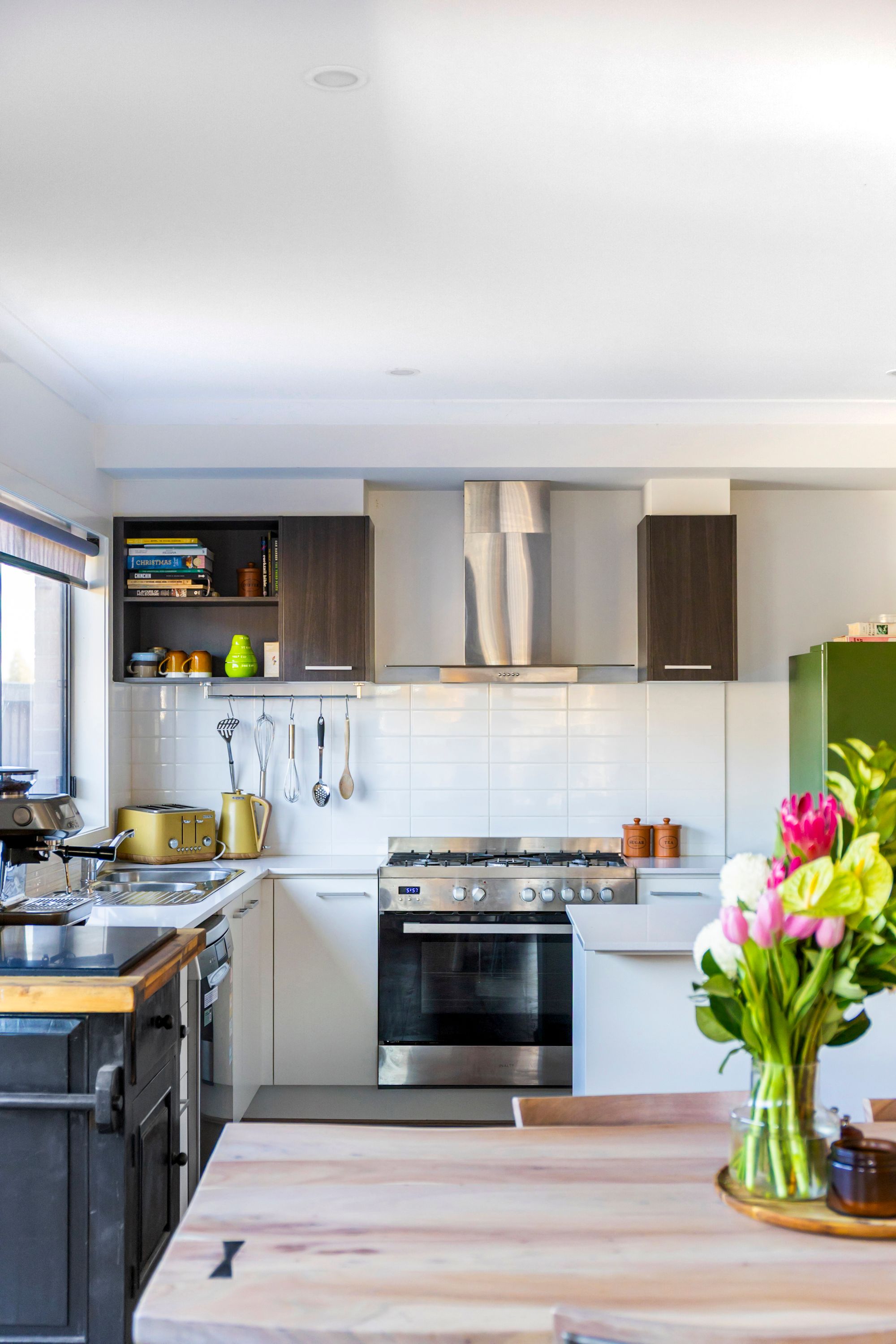Kitchen: 20mm Stone Island Benchtop, 900mm stainless steel oven and rangehood, large fridge cavity, window splashback, downlights, hybrid flooring.