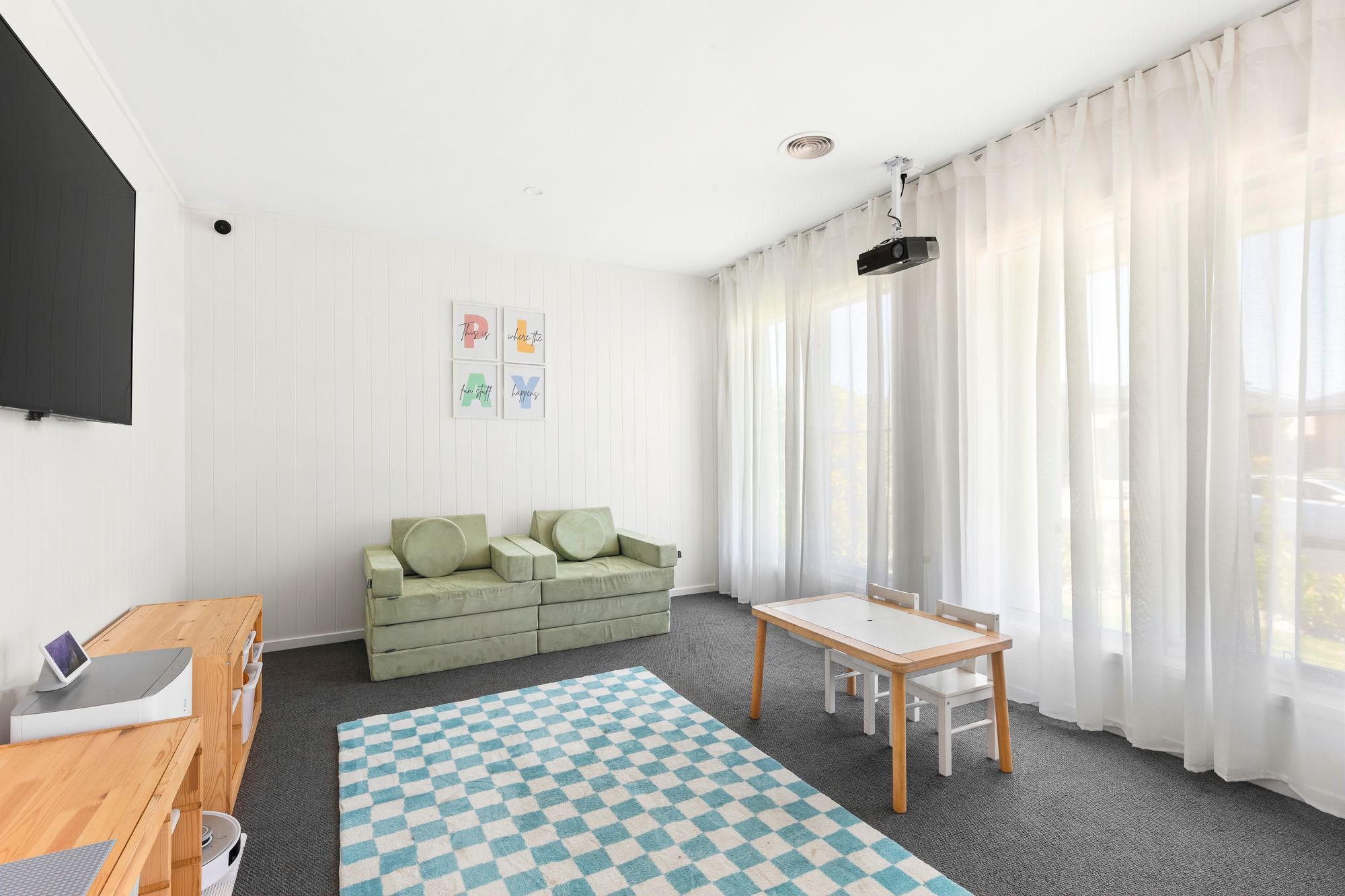 Second Living: Double glazing, spacious, projector, VJ panelling, sheer curtains, downlights, ducted heating, carpet.