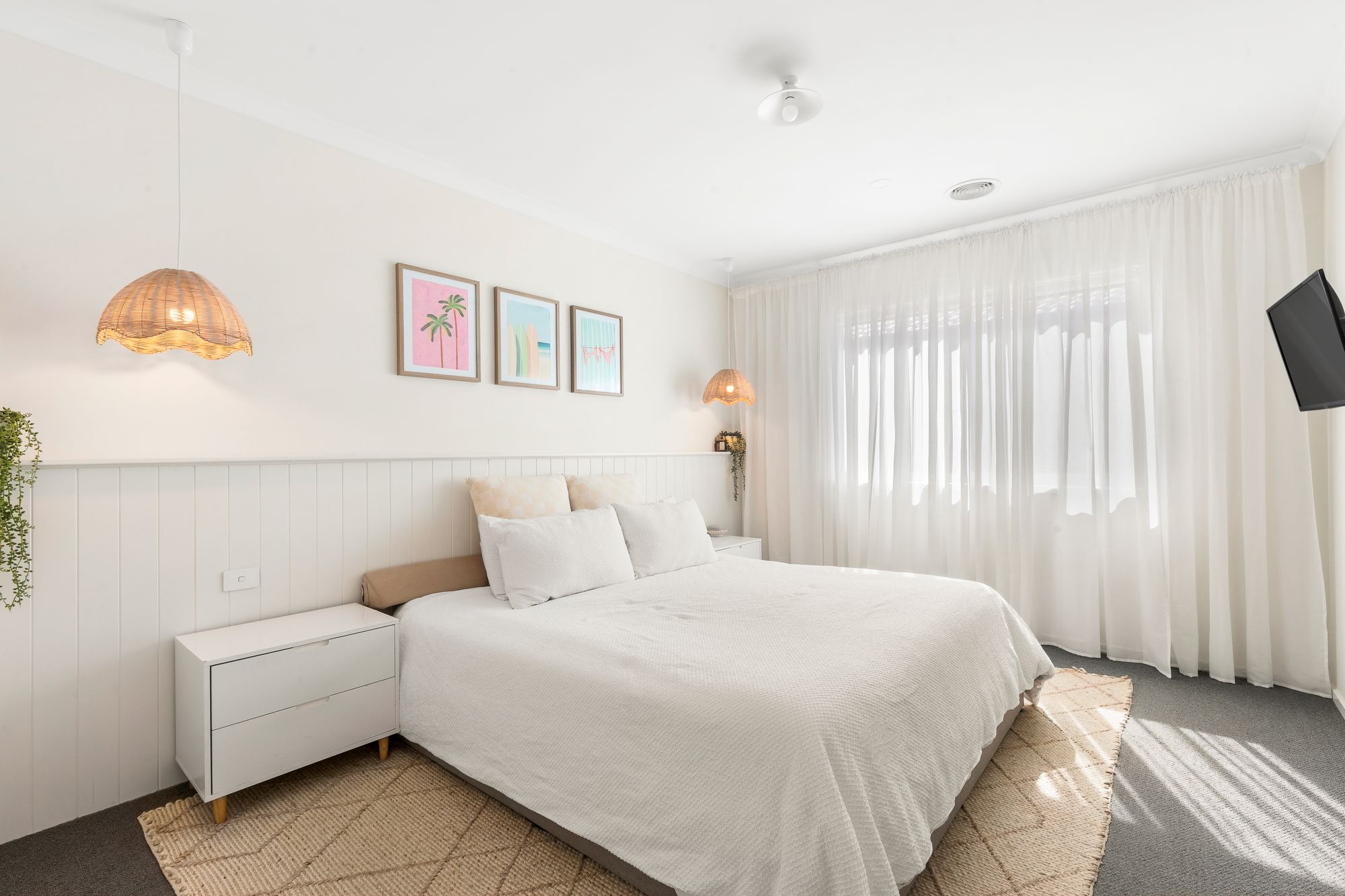 Master: Spacious, double glazing, pendant lights, raised ceiling and door frames, VJ panel shelf, Sheer curtains, Ducted heating, Down lights, carpet, windows, fan provision, walk in robe.
