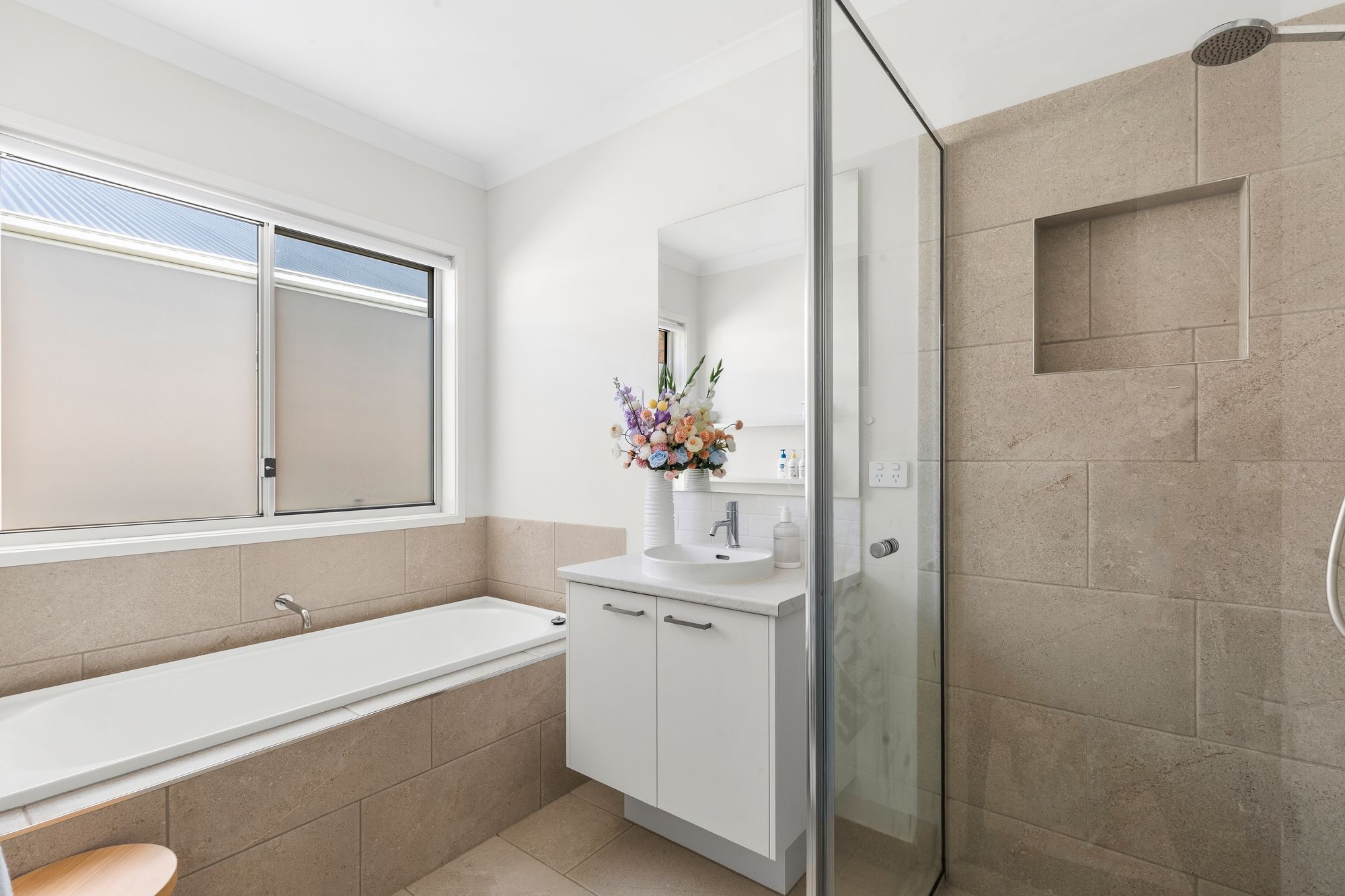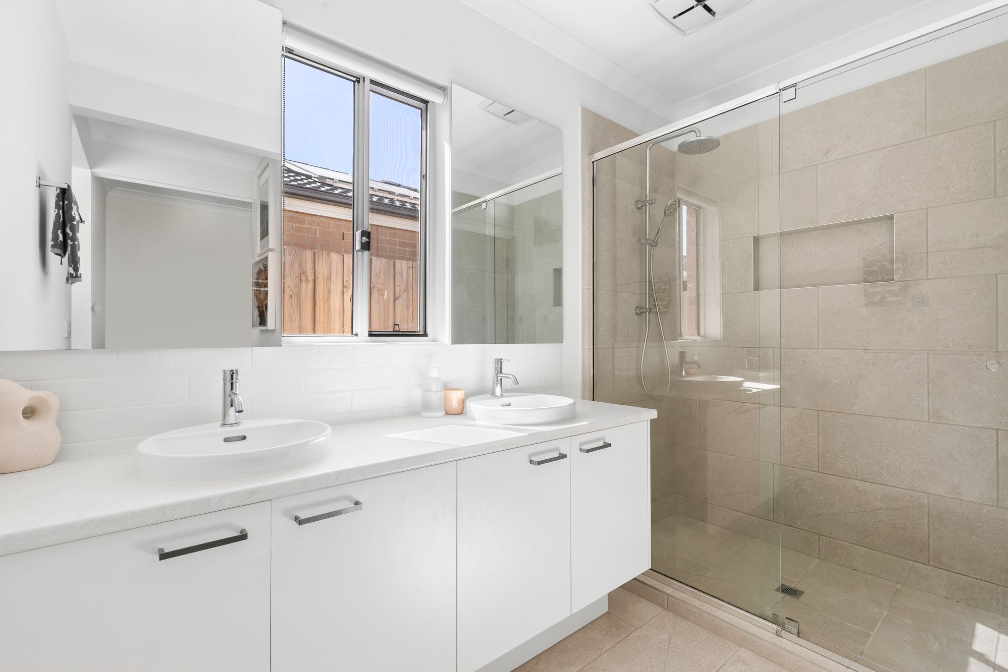 Ensuite: Double shower, shower niche, fully tiled, rainfall and hand held shower head, twin vanity, Tiles, towel rack, window, blind, seperate toilet.