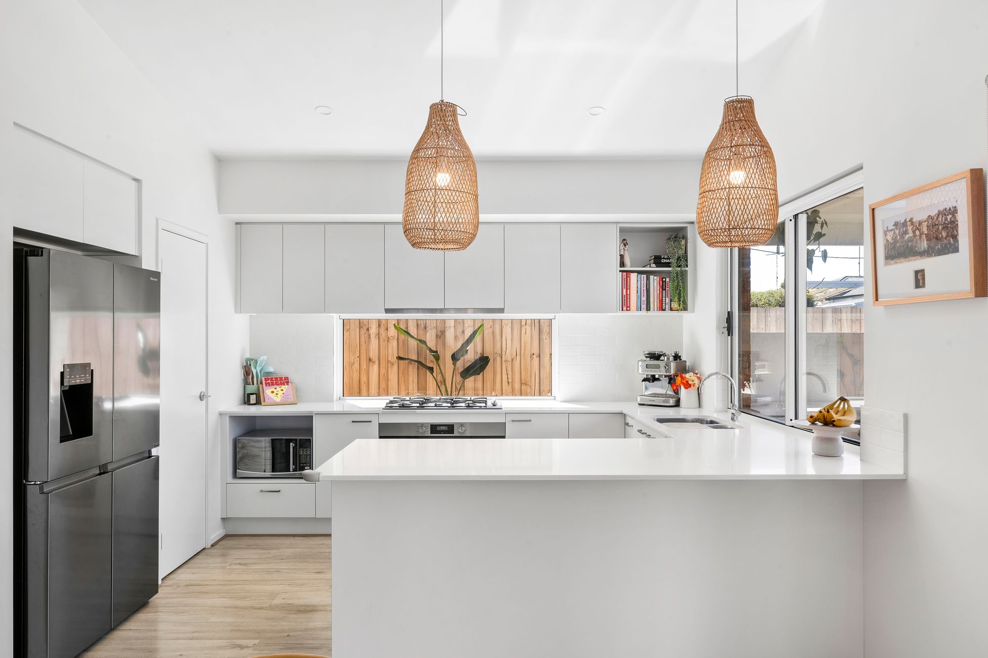 Kitchen: 20mm stone benchtops, Window splash back and tile outline, Window servery, 900mm Westinghouse built in appliances and hidden range hood, Pendant lights, under mount sink, window blinds, downlights, ducted heating, overhead cupboards, walk in pantry, hybrid flooring.