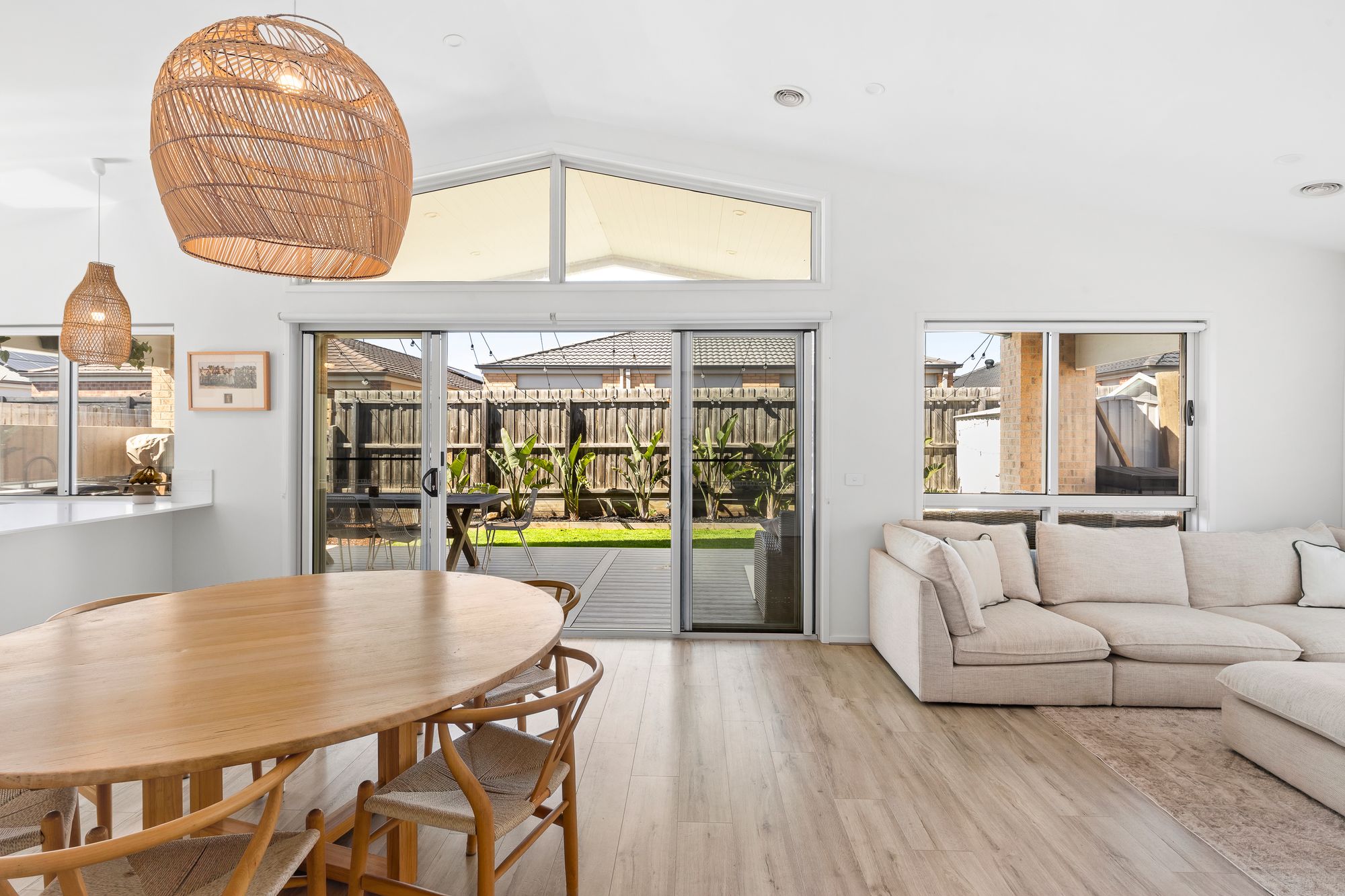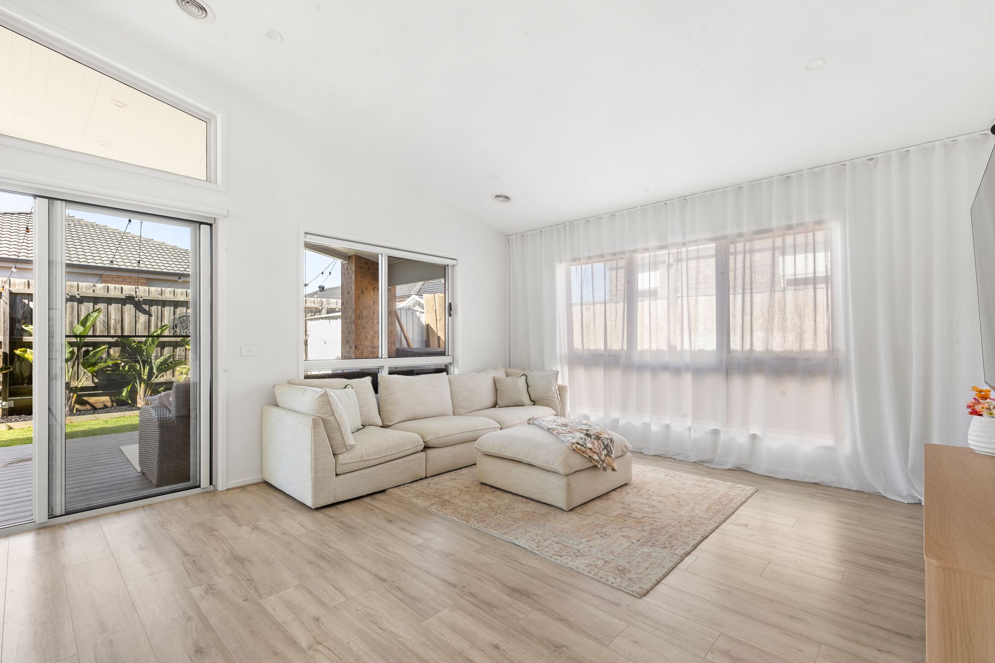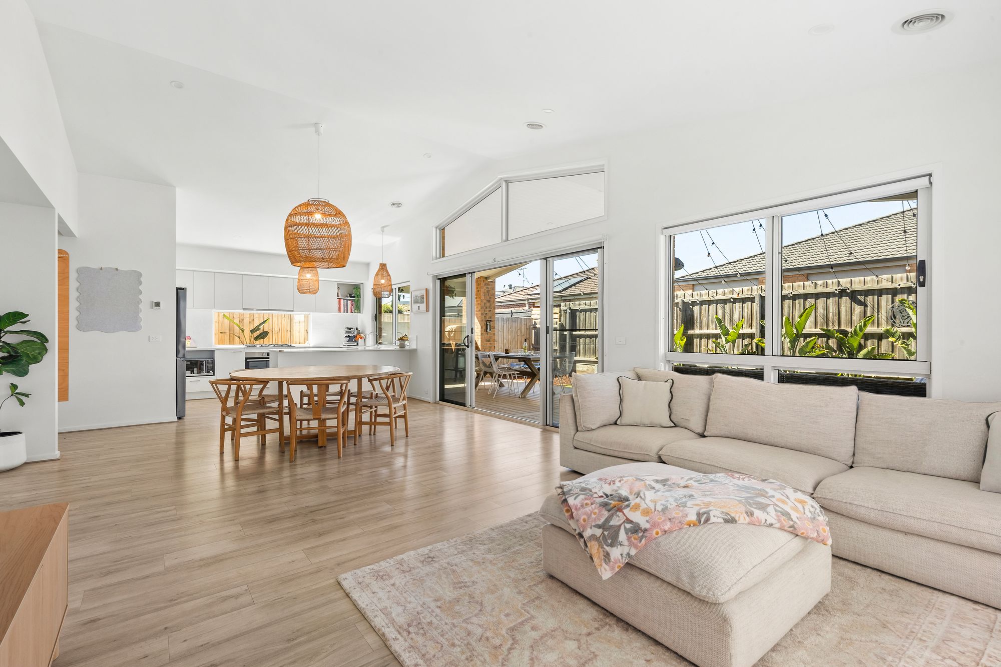 Cathedral ceiling, double glazing to back windows, multiple windows, sheer curtains, feature pendant lighting, feature paneling, alcove, ducted heating, hybrid flooring,
