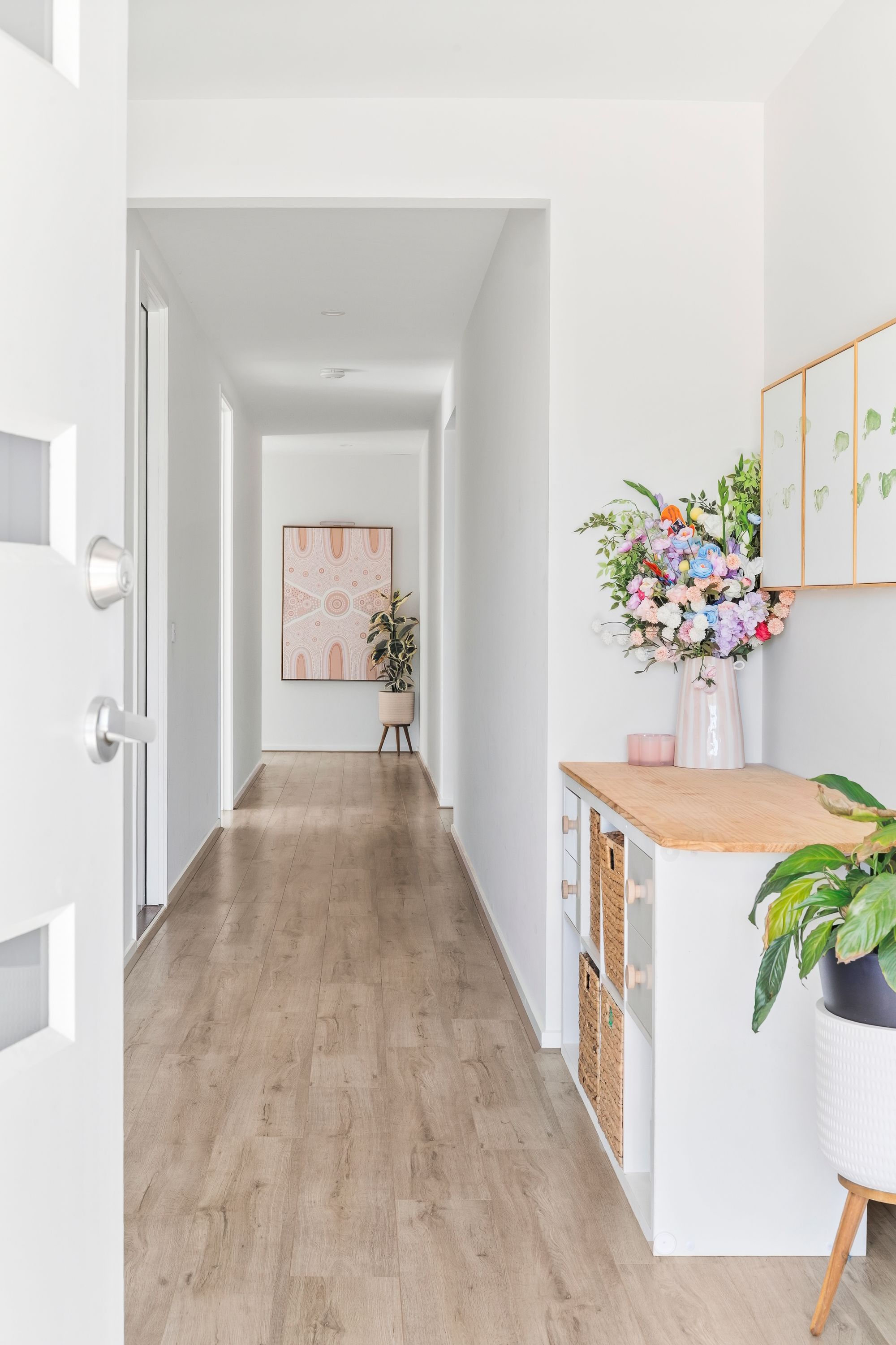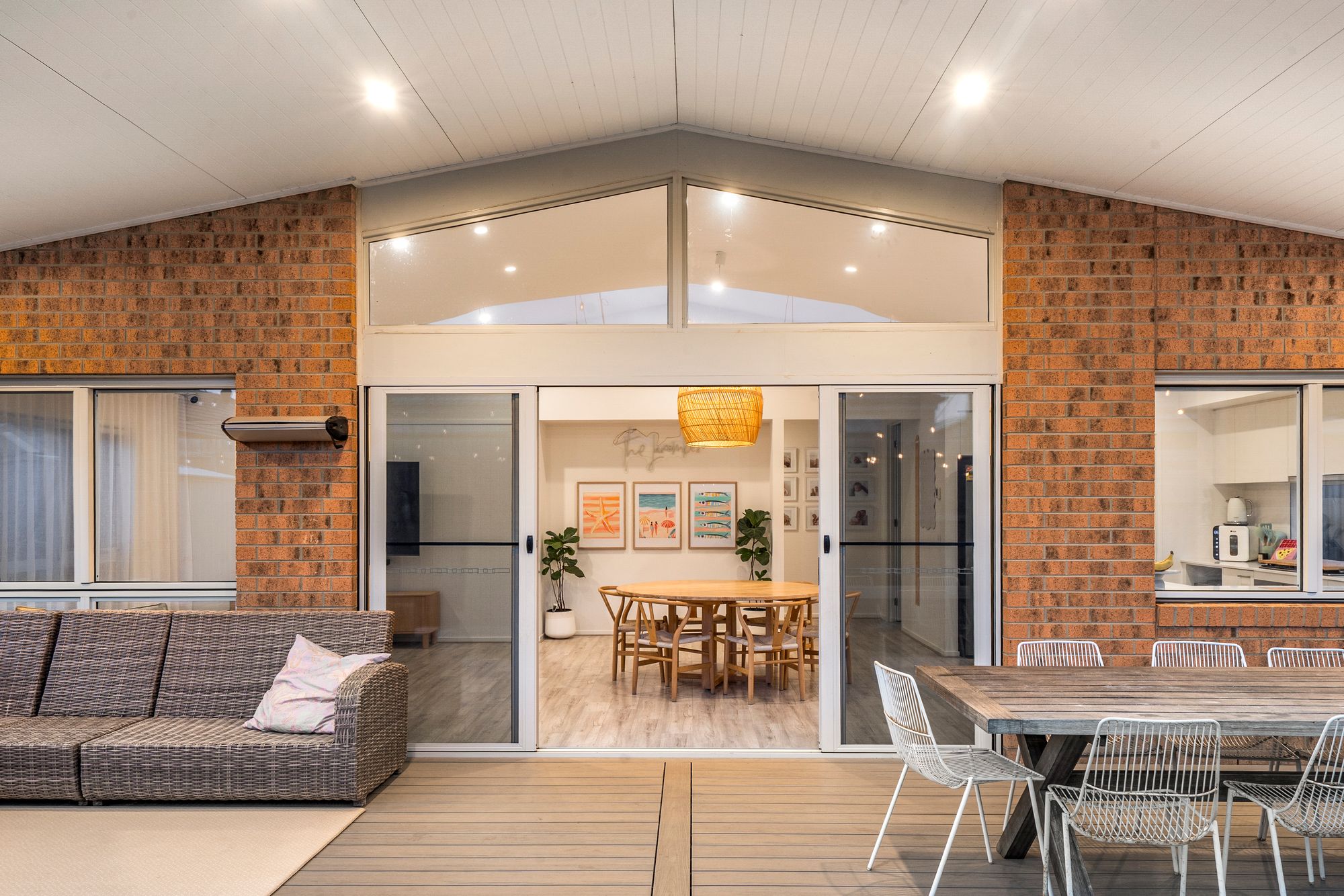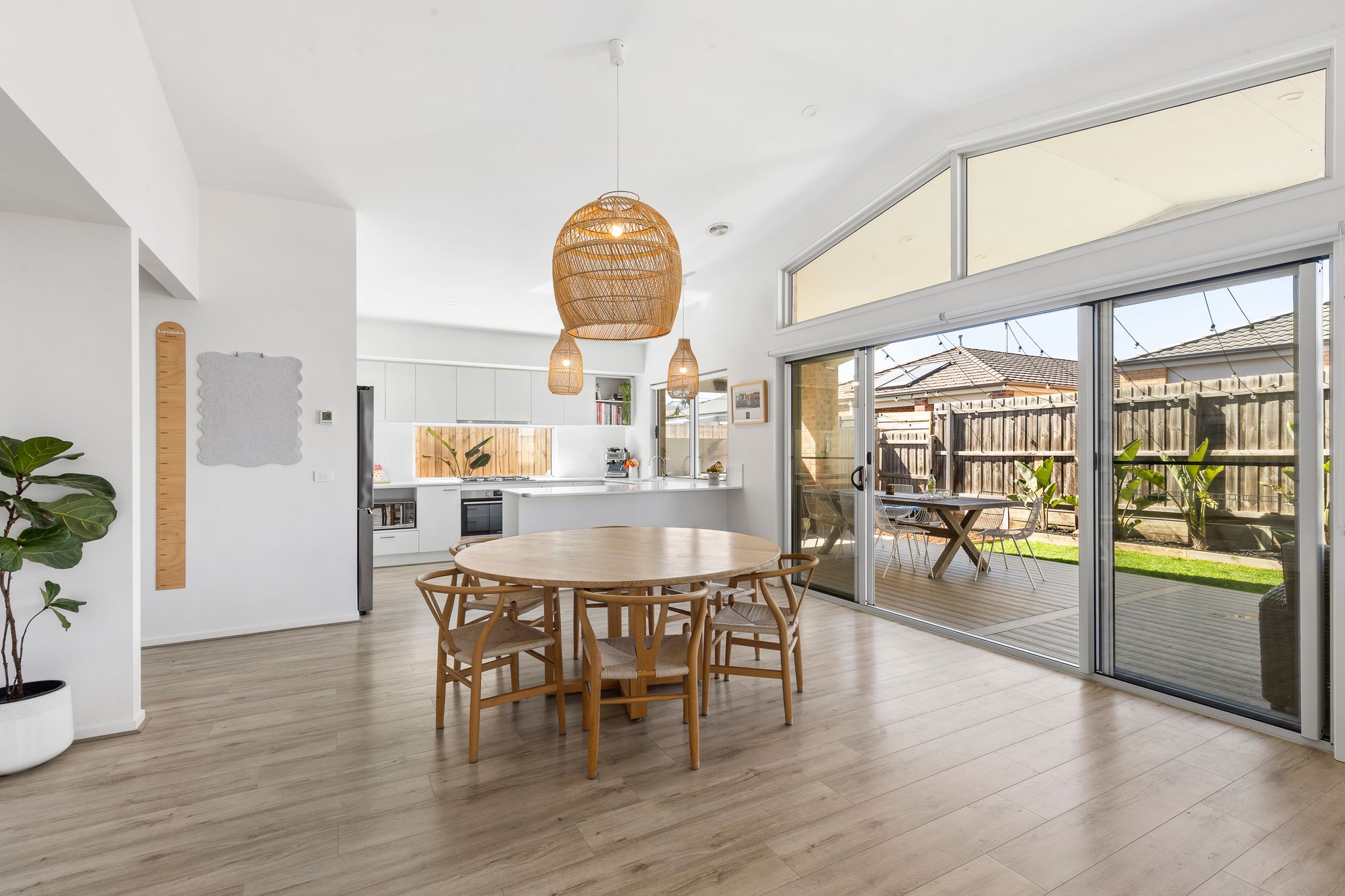 Cathedral ceiling, double glazing to back windows, multiple windows, sheer curtains, feature pendant lighting, feature paneling, alcove, ducted heating, hybrid flooring,