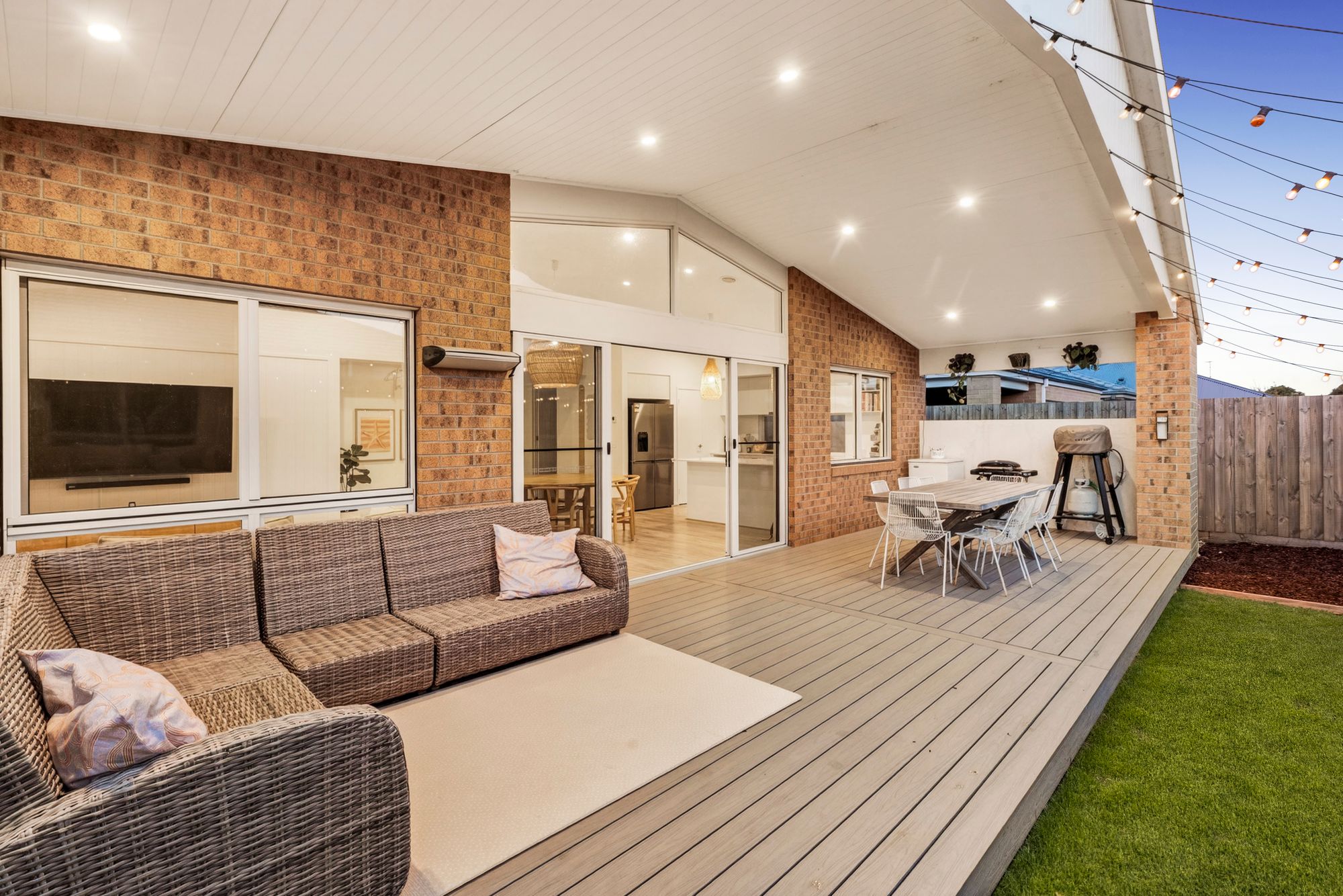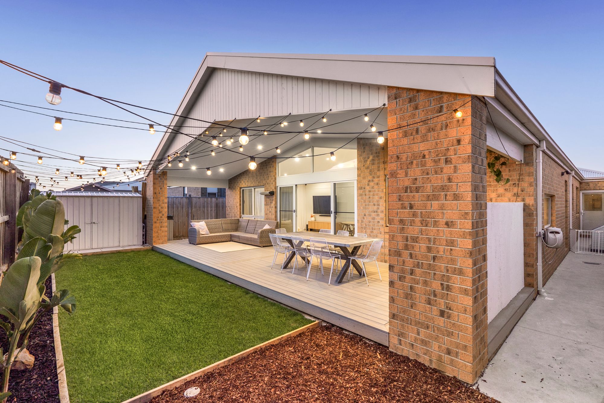 Outside: Cathedral undercover alfresco, downlights, large eco deck, grassed area, garden beds, side gate access, garden shed,