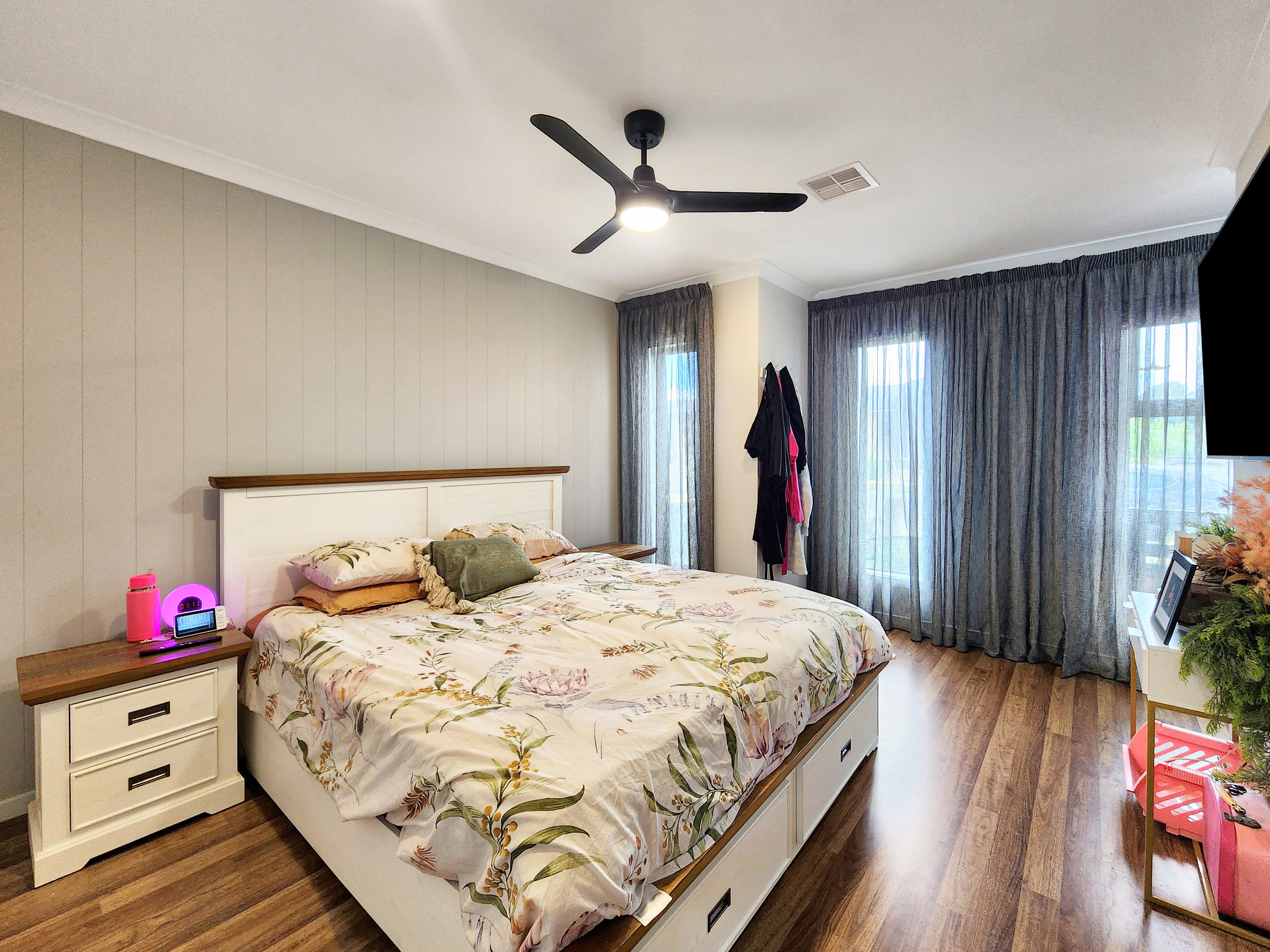 Master Suite: The master suite is a true sanctuary. North-facing windows allow for an abundance of natural light, complemented by timber-look flooring and a stunning VJ paneling feature wall. Comfort is guaranteed with ducted heating, refrigerative cooling, and a ceiling fan with lighting. Dual walk-in robes provide ample storage, while the stylish ensuite boasts a large vanity with 20mm stone benchtops, an expansive mirror, upgraded cabinetry, and a wide wall-to-wall shower. A private toilet completes this luxurious space.