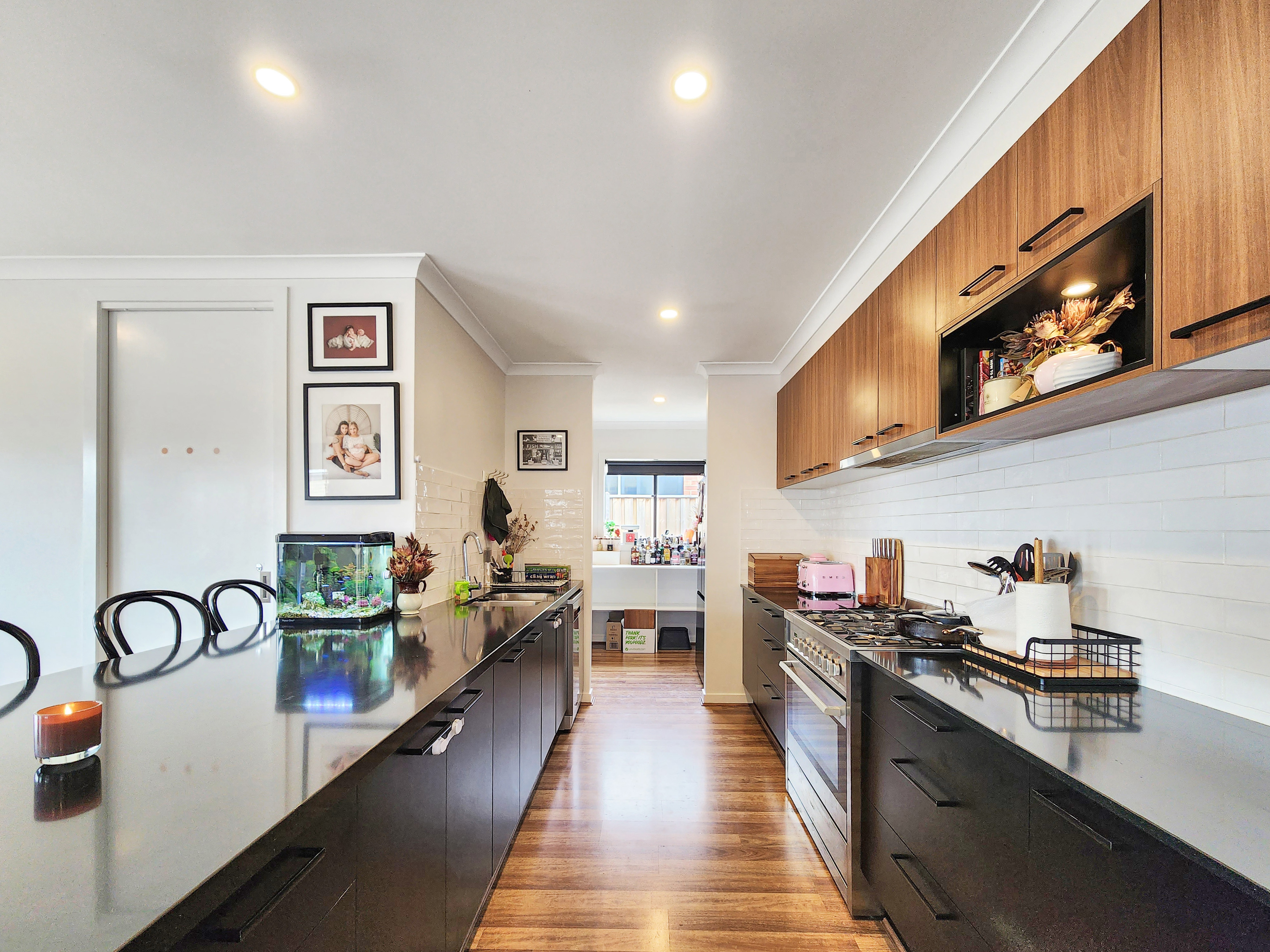 Kitchen: The highlight of the home, this impressive kitchen blends style and functionality with every feature you could want. Showcasing 20mm stone benchtops to both the island and rear benches, tiled splashback, high ceilings, and a double undermount sink, it exudes modern luxury. The 900mm freestanding oven and stovetop, rangehood, and timber-look flooring add warmth and practicality. A well-equipped butler’s pantry offers additional shelving, benchtops, cabinetry, and a large fridge cavity, perfect for families and entertainers alike. With downlights, upgraded cabinetry including pot drawers and overhead storage, as well as ducted refrigerative cooling and heating, this space is both beautiful and efficient.