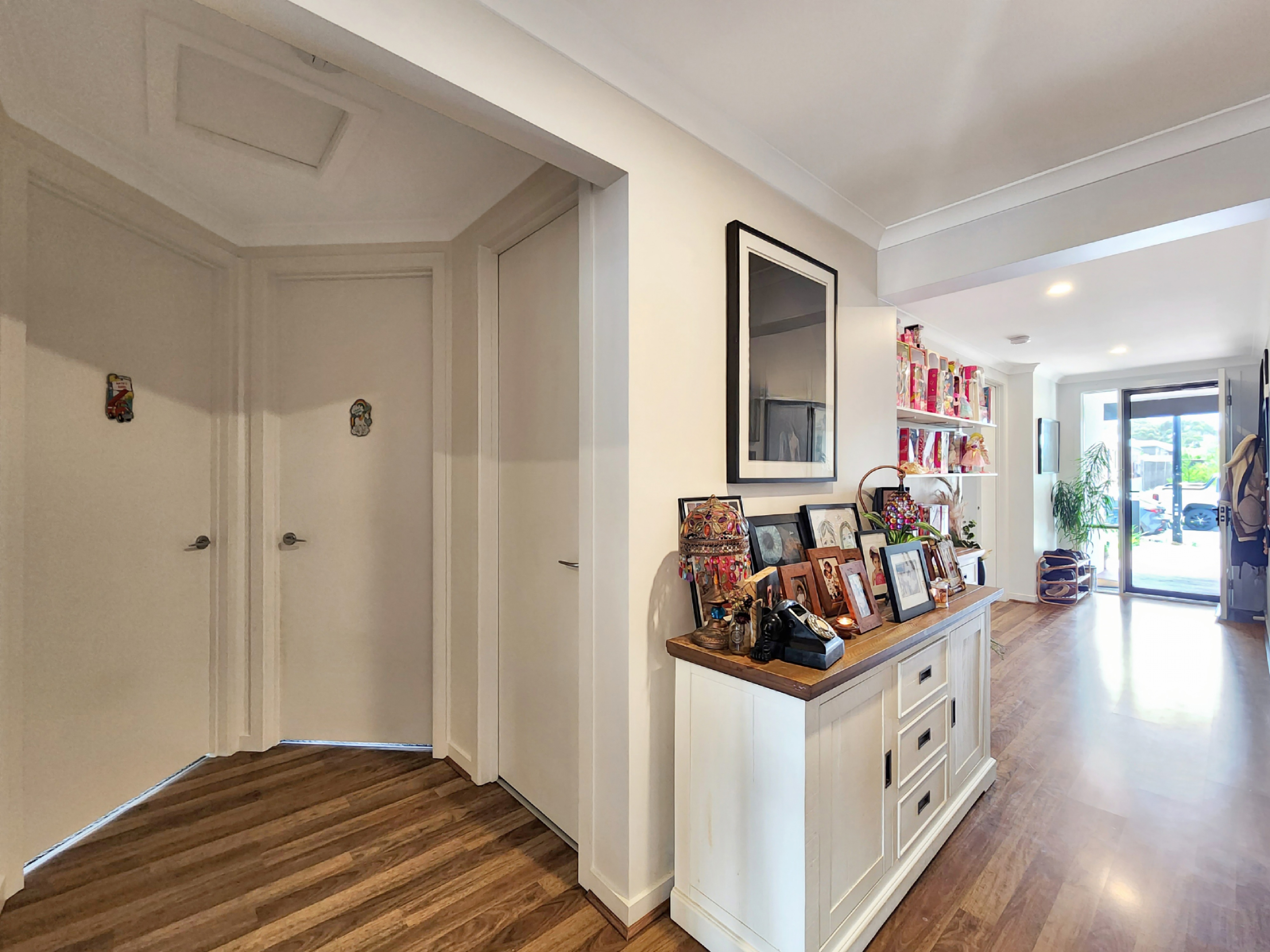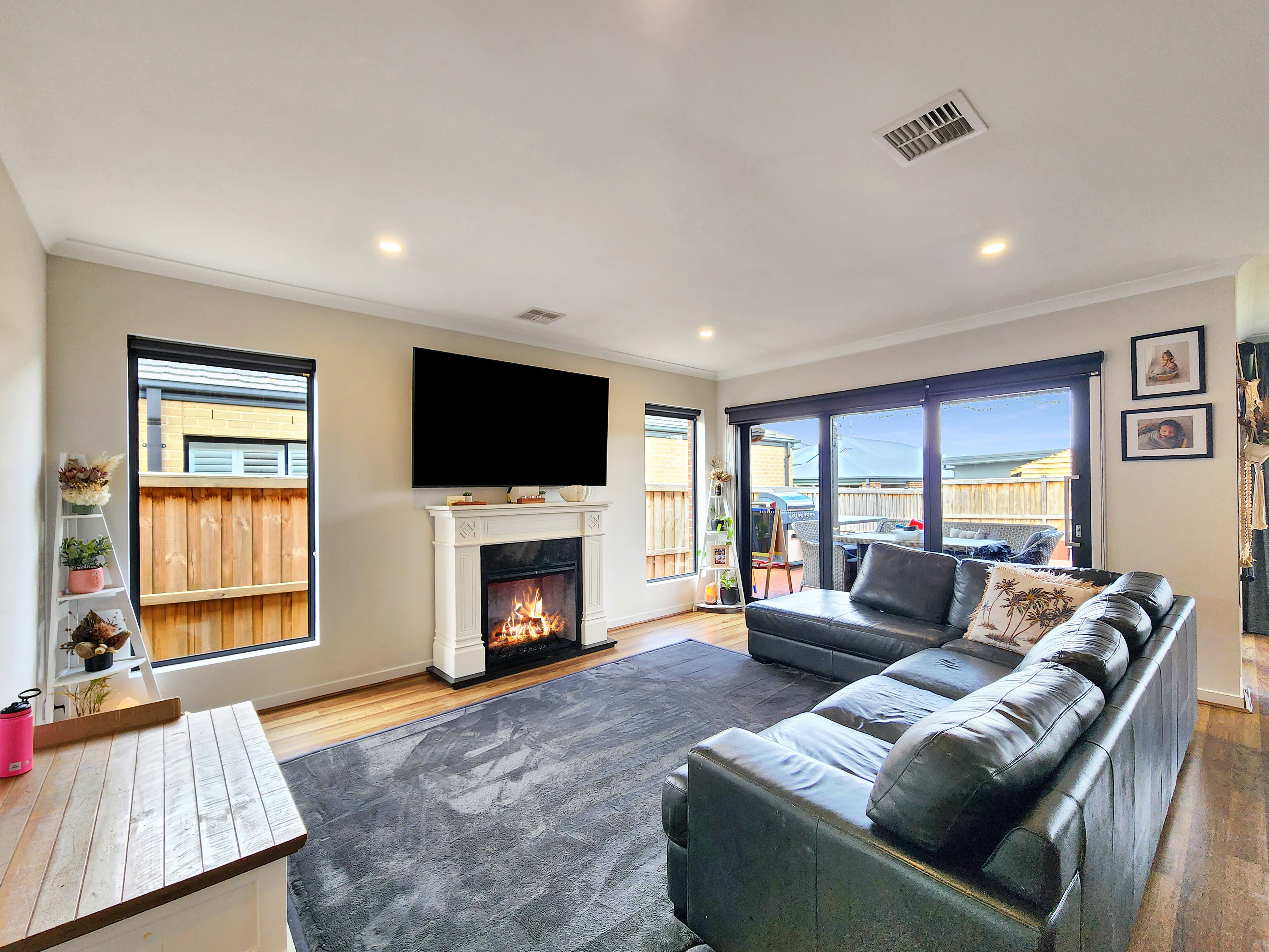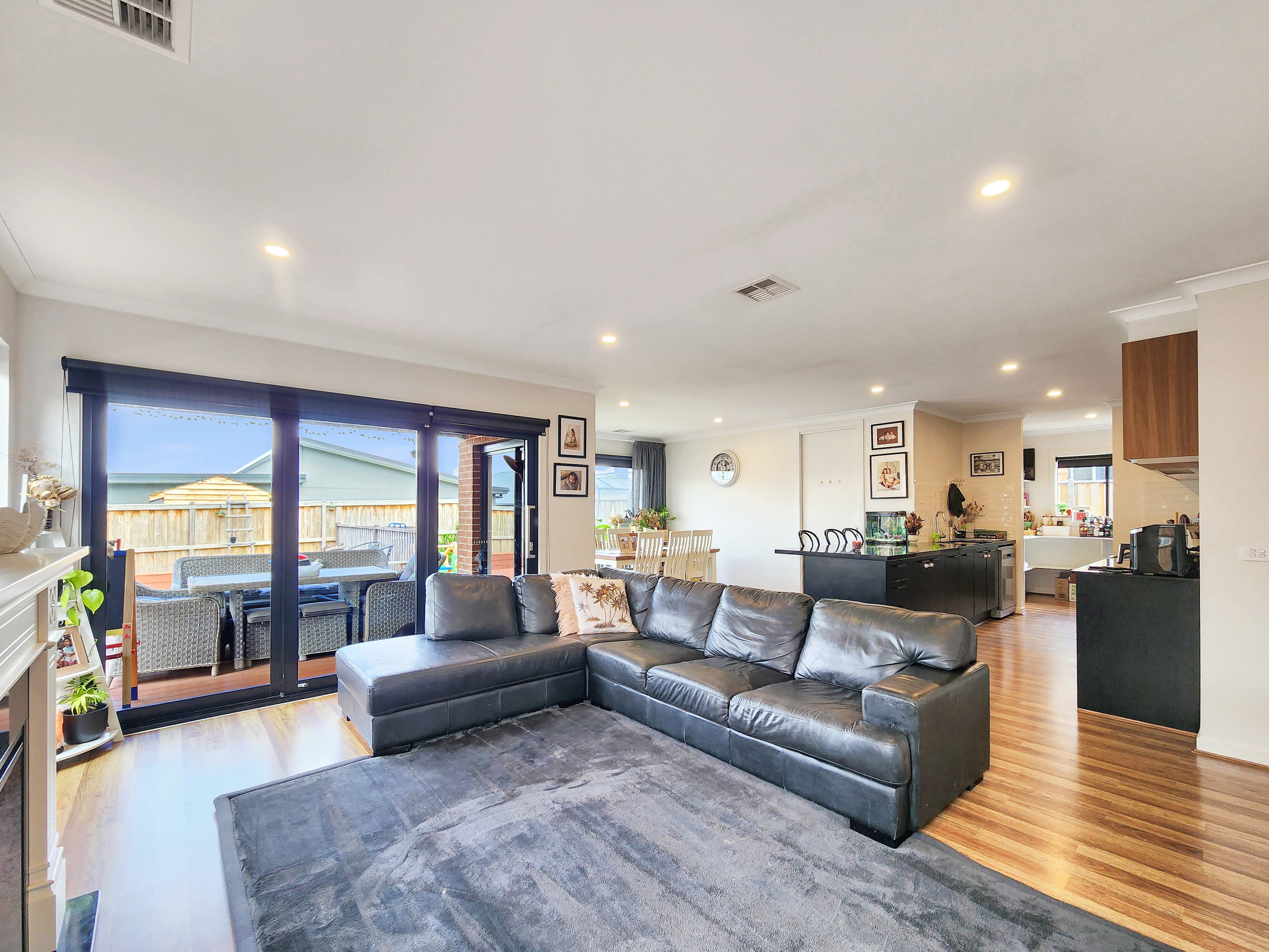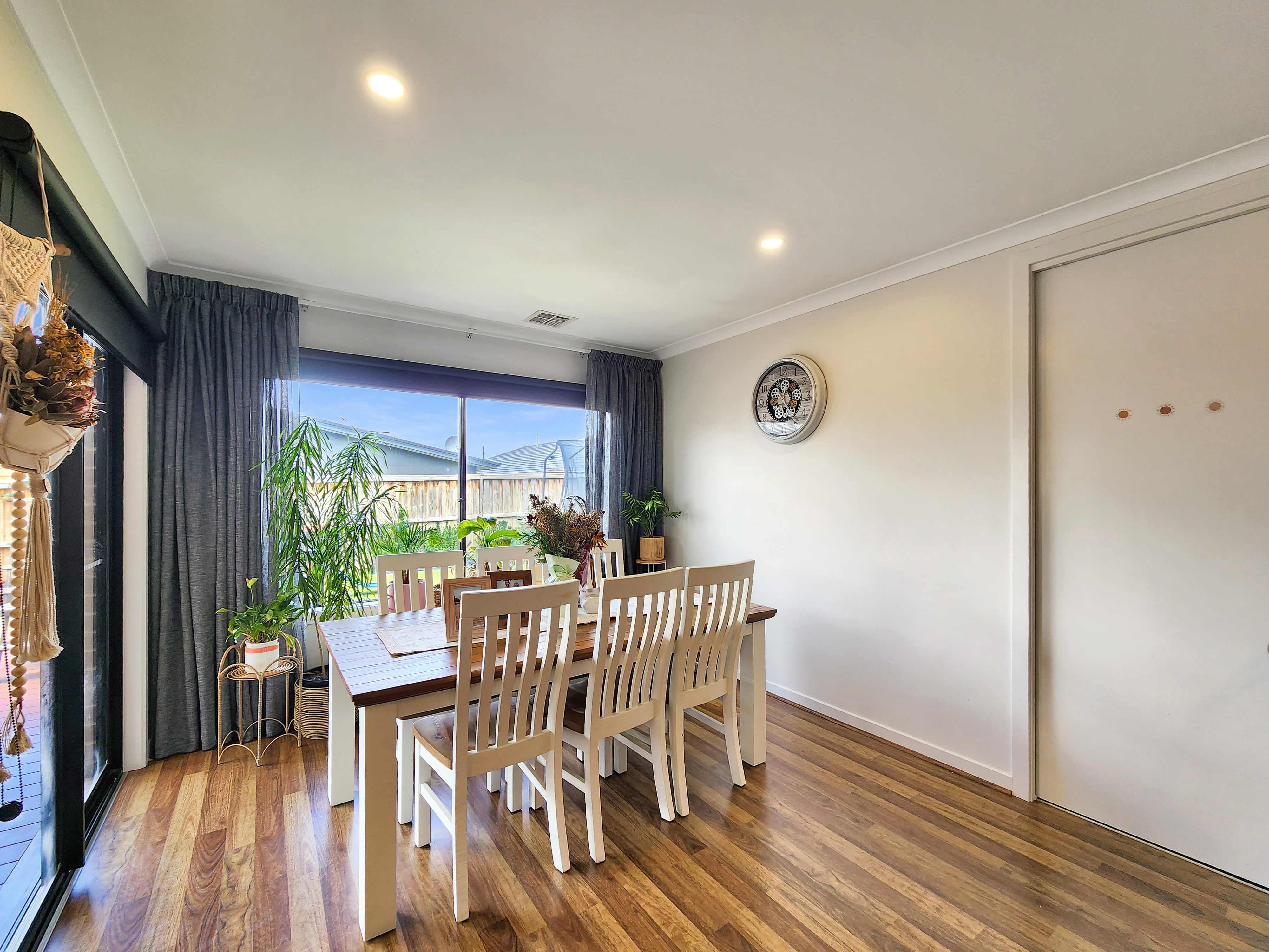 Open Plan Living/Dining: The open plan living and dining area forms the heart of the home, framed by high ceilings and timber-look flooring that enhance its sense of space. All-day sunlight streams through wide windows dressed with roller blinds and sheer curtains, creating a warm and welcoming atmosphere. Ducted refrigerative cooling and heating ensure year-round comfort, while downlights illuminate the space beautifully. Glass stacking doors open seamlessly to the south-facing alfresco and rear yard, extending your living space outdoors.