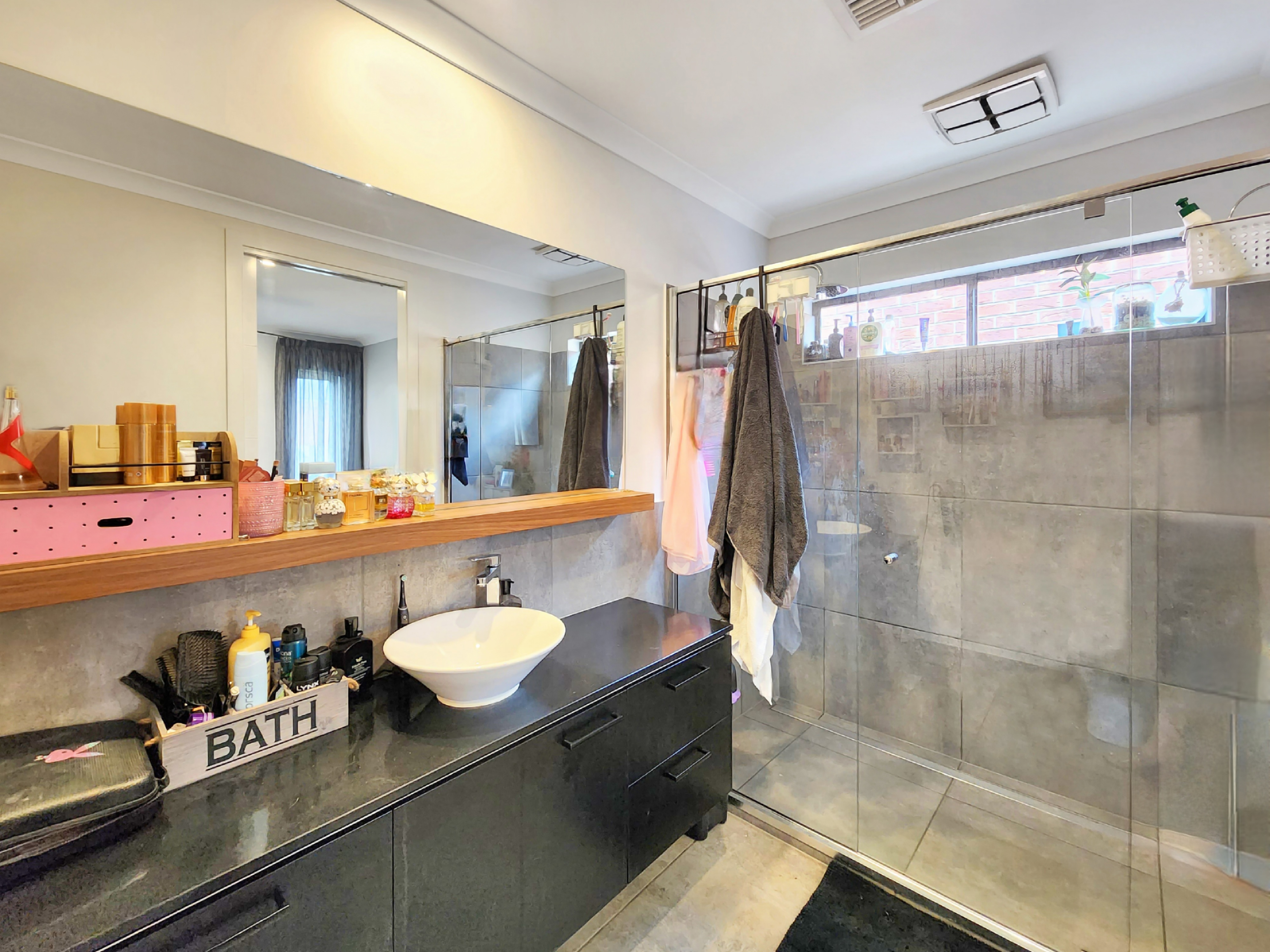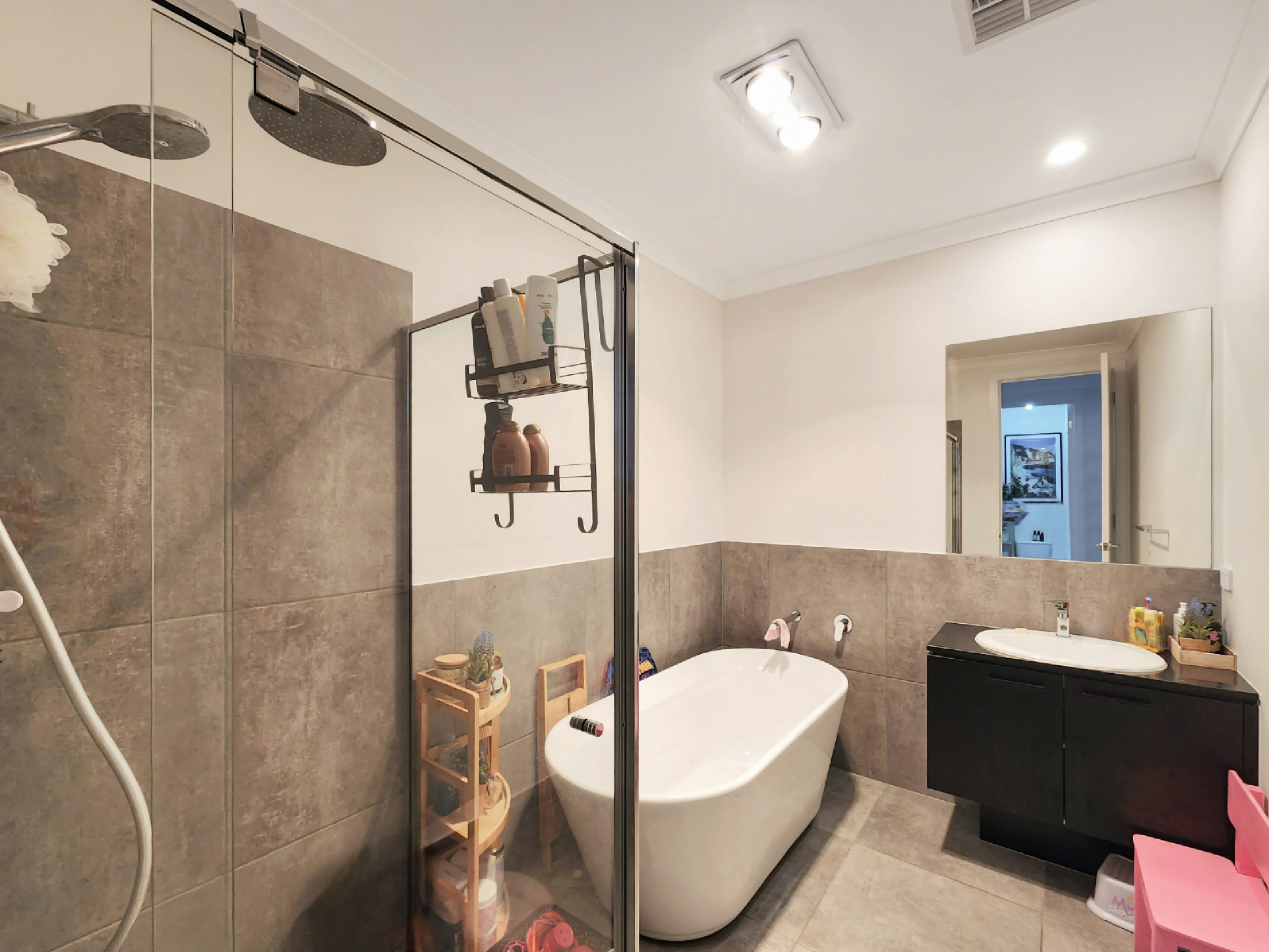 Additional Bathroom: Beautifully appointed, the main bathroom showcases a single vanity and basin with 20mm stone benchtops and cabinetry, a freestanding bath, mirrored splashback, and a spacious shower with a waterfall showerhead and niche. A separate toilet, heat lamp, and downlights complete this refined and functional space.
