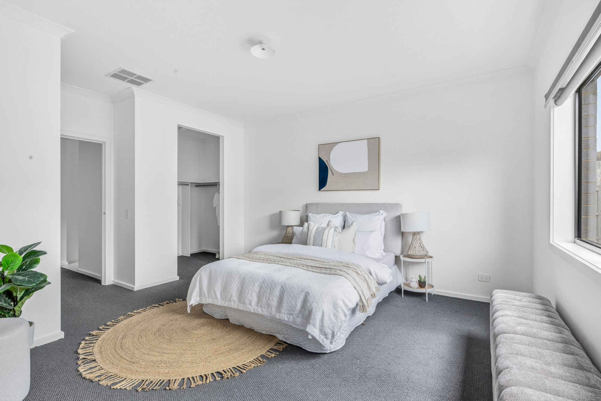 The master bedroom is a private retreat located at the rear of the home, carpeted for comfort and featuring large window with dual roller blinds, ducted heating, evaporative cooling, and a spacious walk-in robe with ample storage. The luxurious ensuite includes an extended semi-frameless tiled shower with a built-in niche, dual feature basins, a stone benchtop with an extended vanity, an oversized mirror, chrome fittings, and a toilet – offering a truly elegant space to unwind.