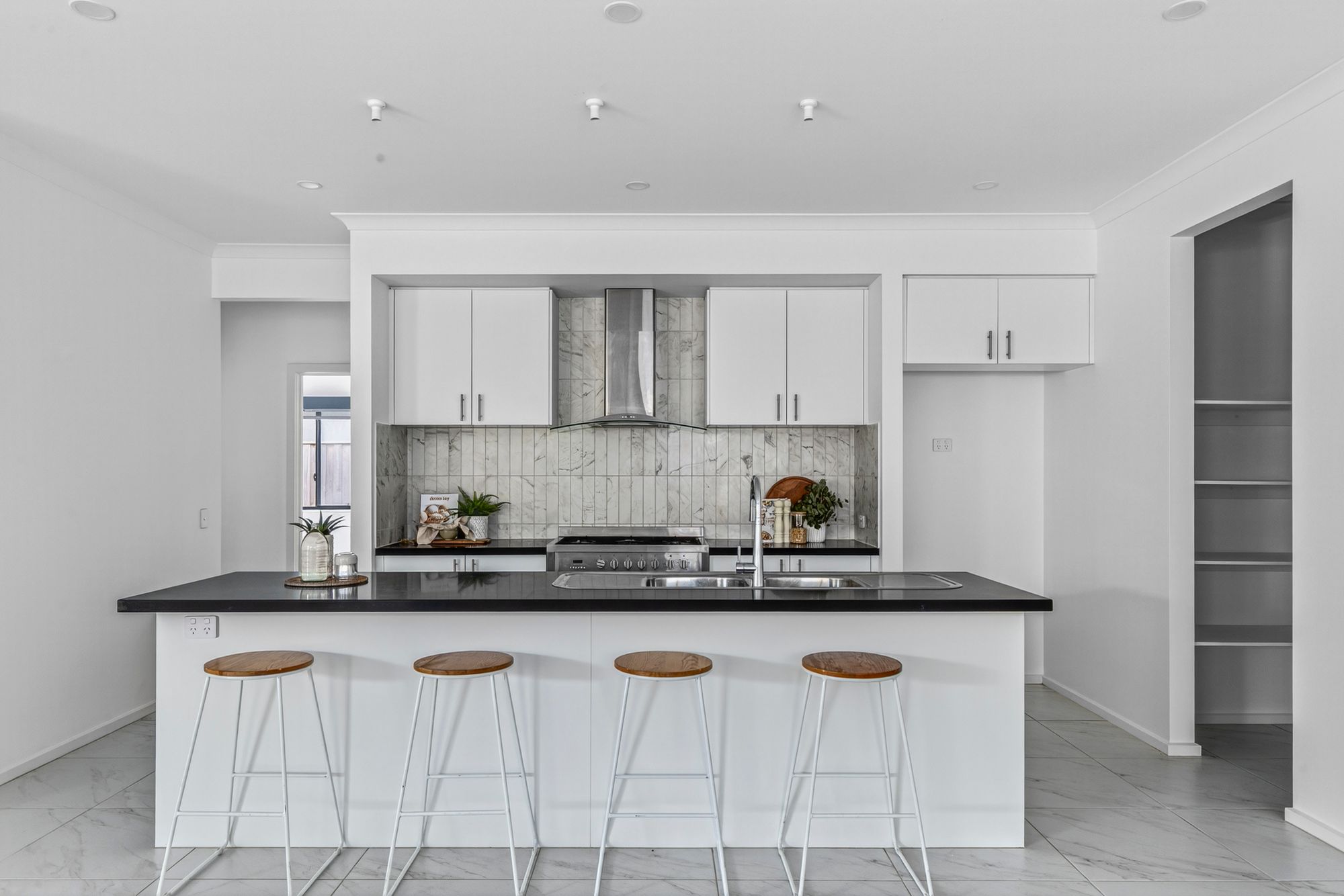 The kitchen is a true centerpiece, featuring 40mm stone benchtops, an island bench with a breakfast bar, butlers pantry, 900mm oven and rangehood, a microwave provision, and a dishwasher. A vertical subway tile splashback adds a modern touch, complemented by overhead cabinetry with ample shelving. With generous bench space, double sink, tiled flooring, chrome fittings, downlights, and multiple power points, this kitchen is designed for both functionality and style.
