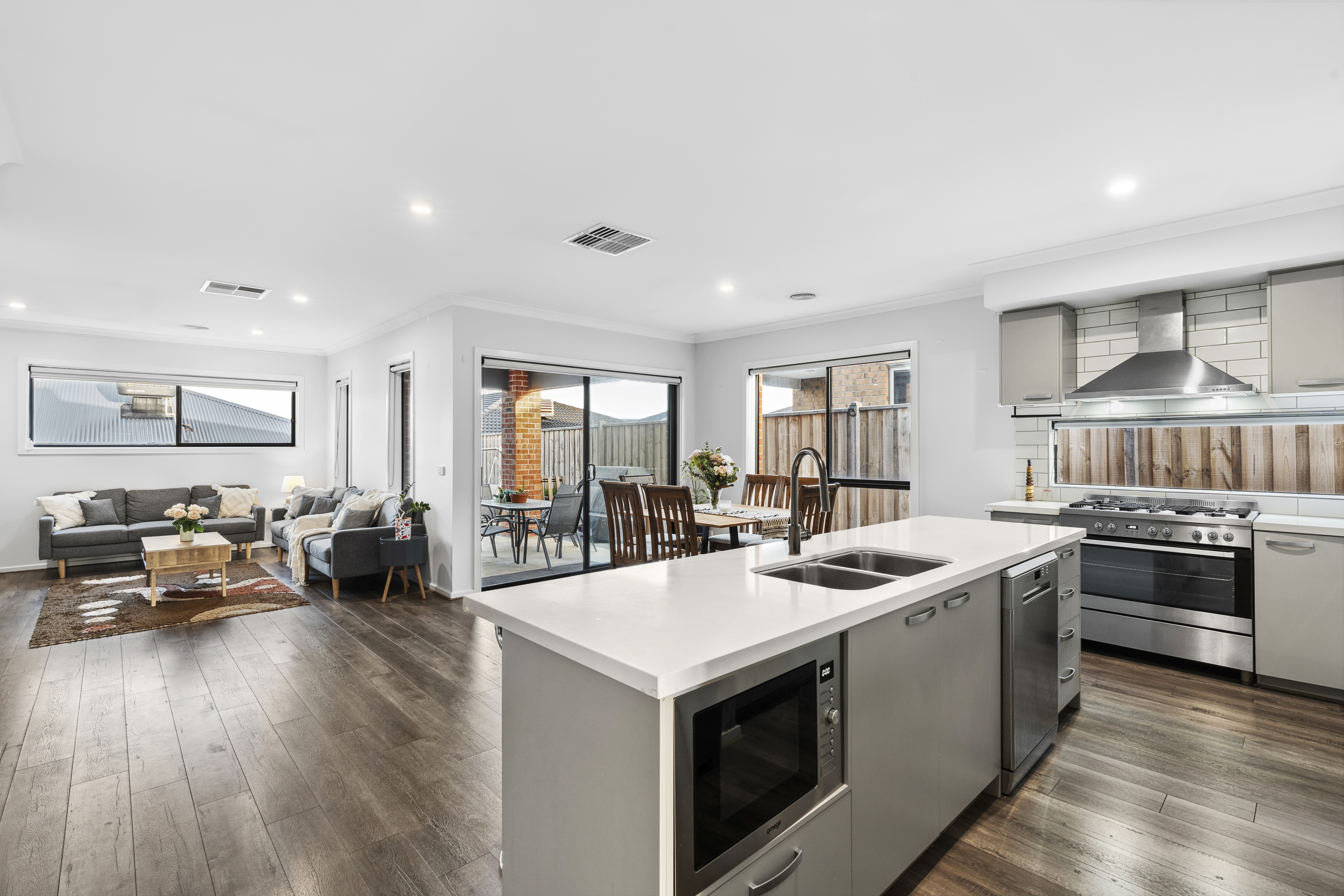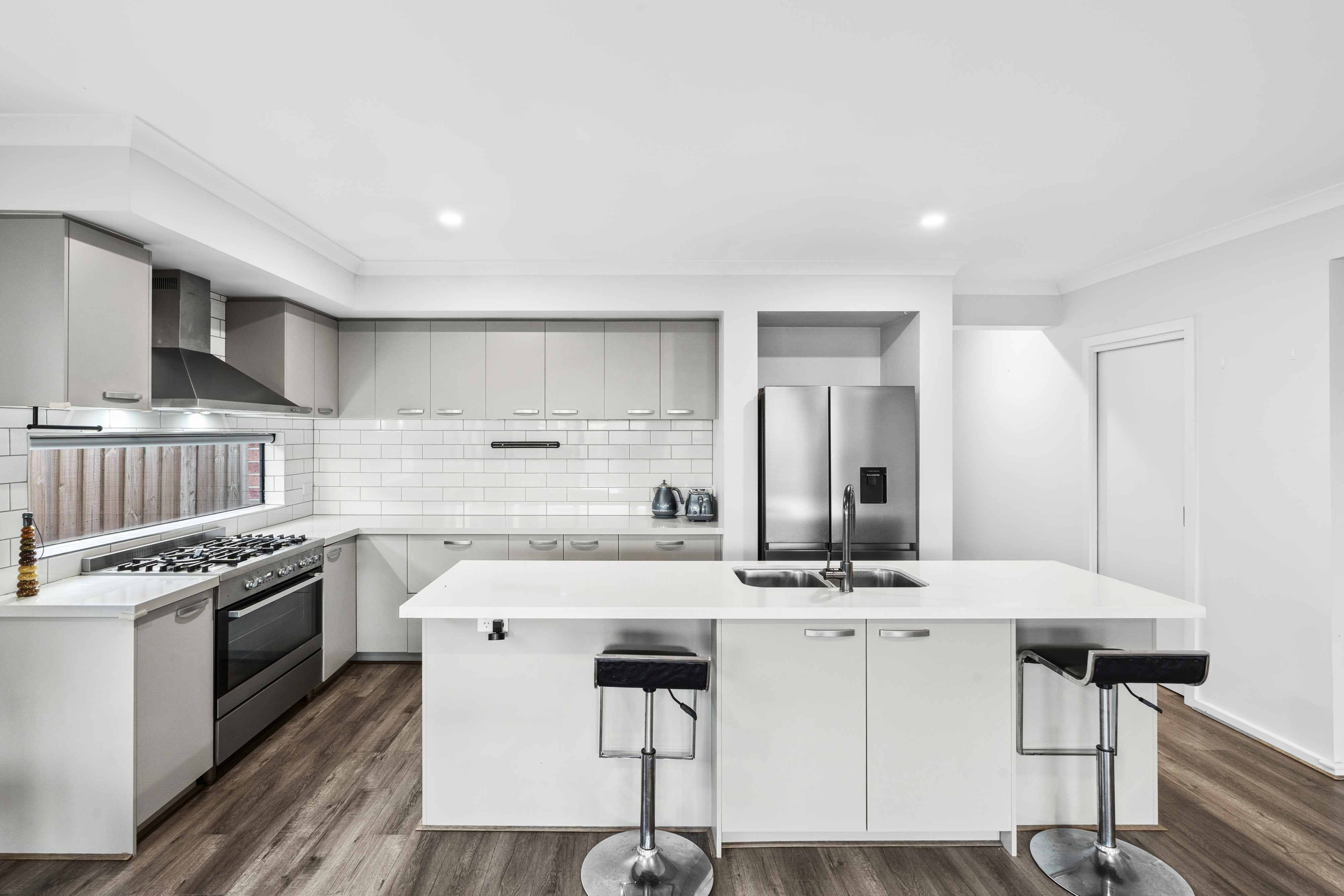 Kitchen: 900mm gas cooktop and oven and rangehood, 40mm stone benchtops, island bench with overhang breakfast bar, contemporary timber laminate flooring, double undermount sink with upgraded tapware, in-built microwave, dishwasher, ample overhead cabinetry, chrome fittings, downlights, walk-in pantry, feature subway tiling & window splashback, ducted heating & evaporative cooling.