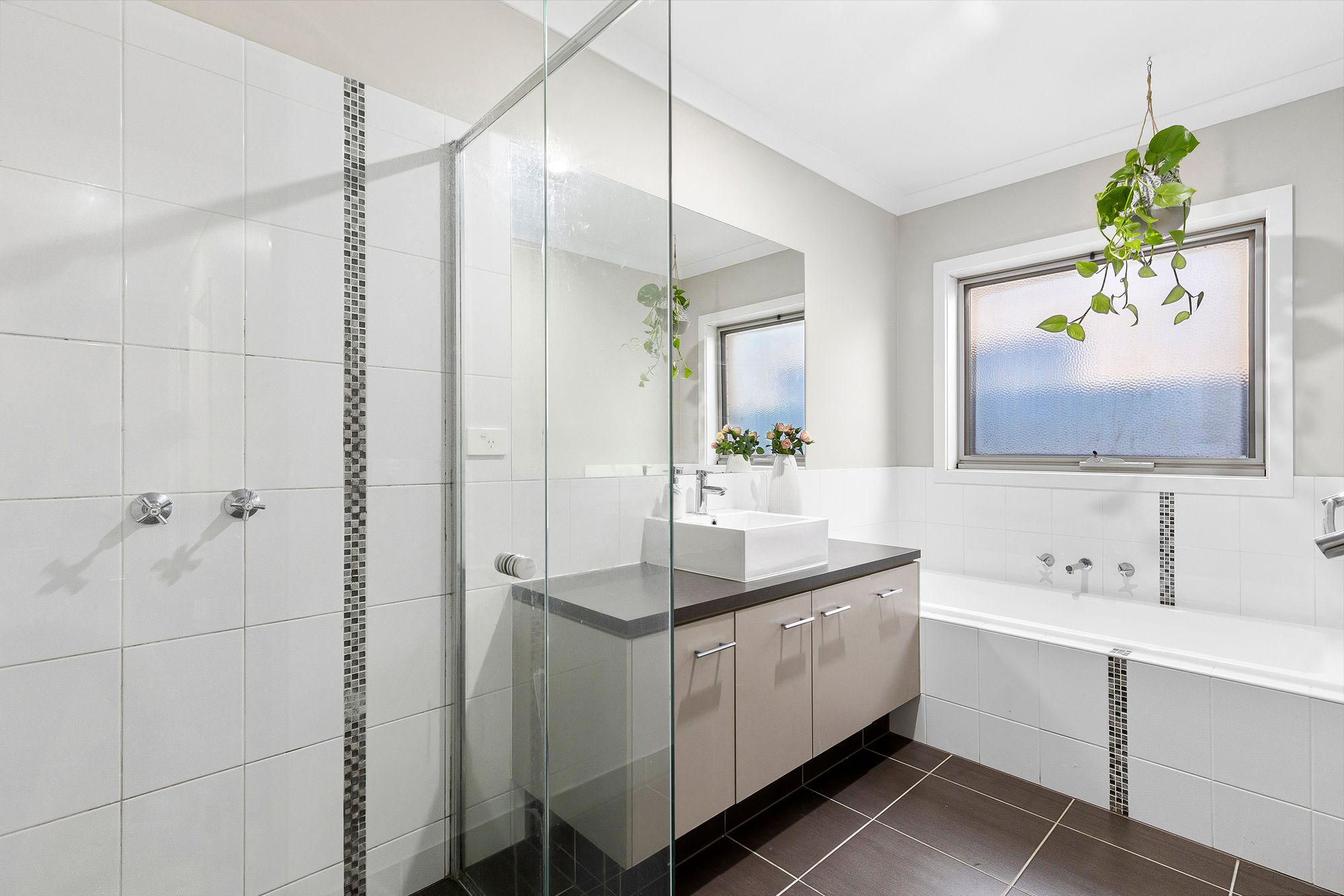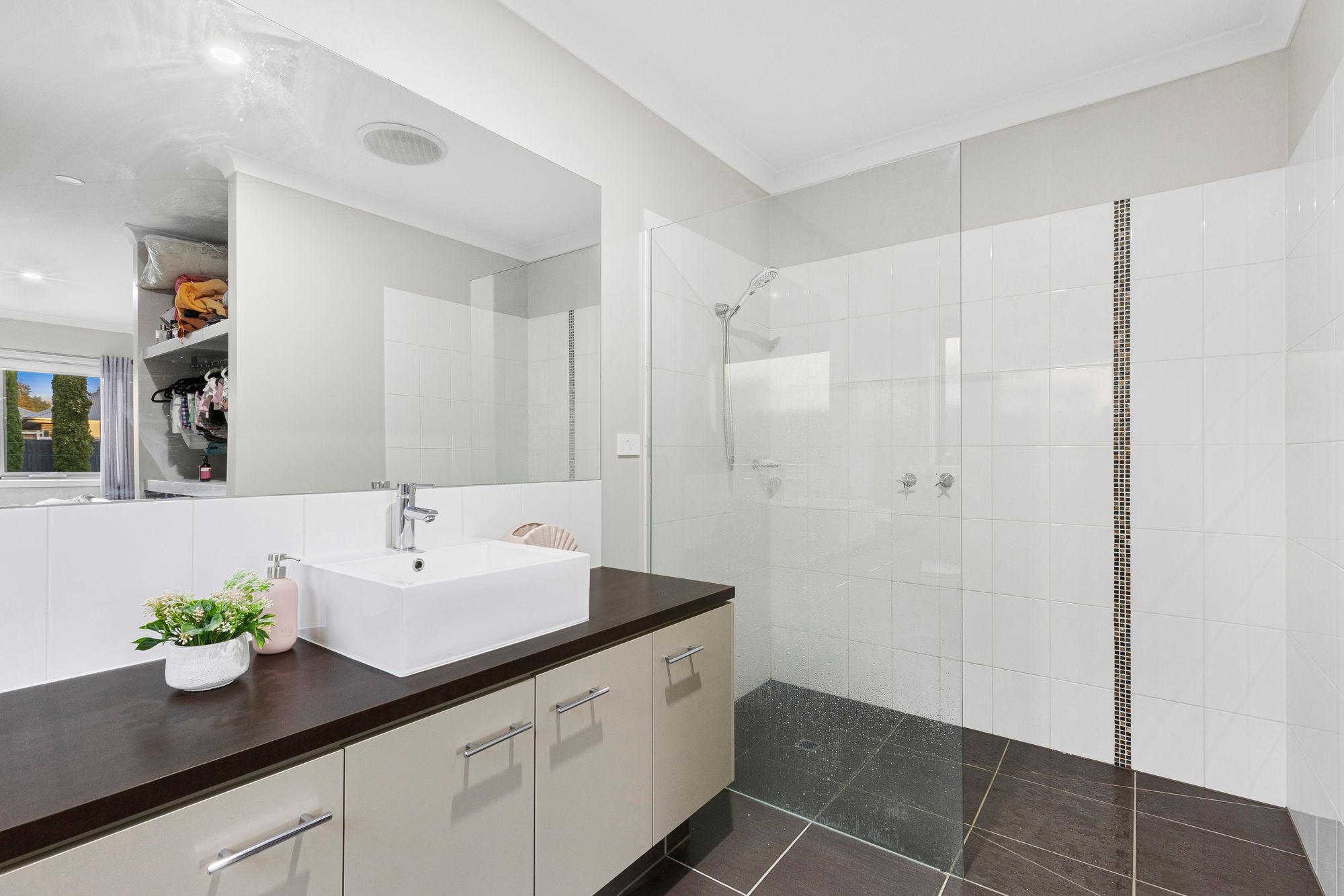 Ensuite: Extended tiled shower, semi-frameless shower, handheld shower head, single basin with extended vanity, ample storage, open toilet, chrome fittings, frosted window.