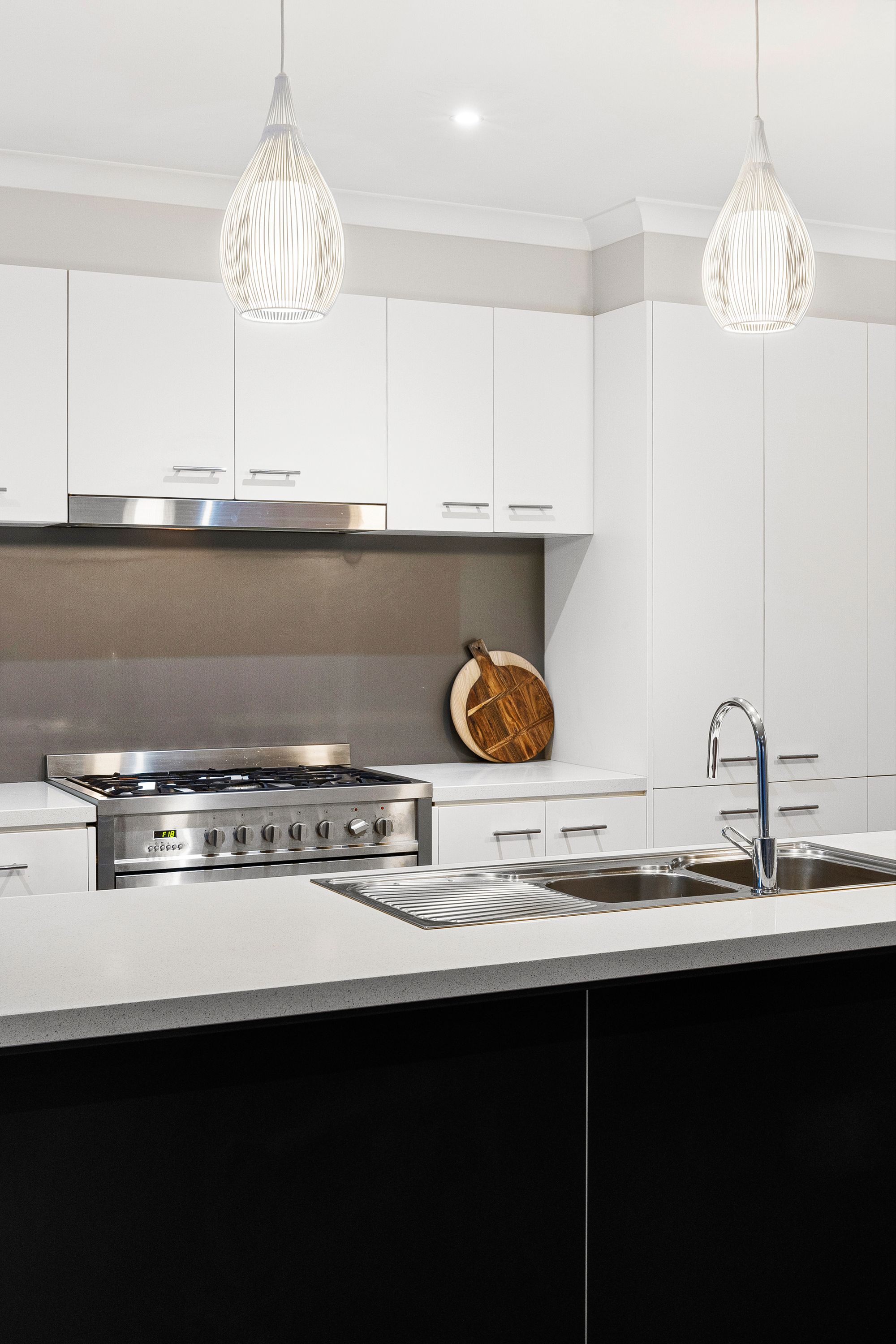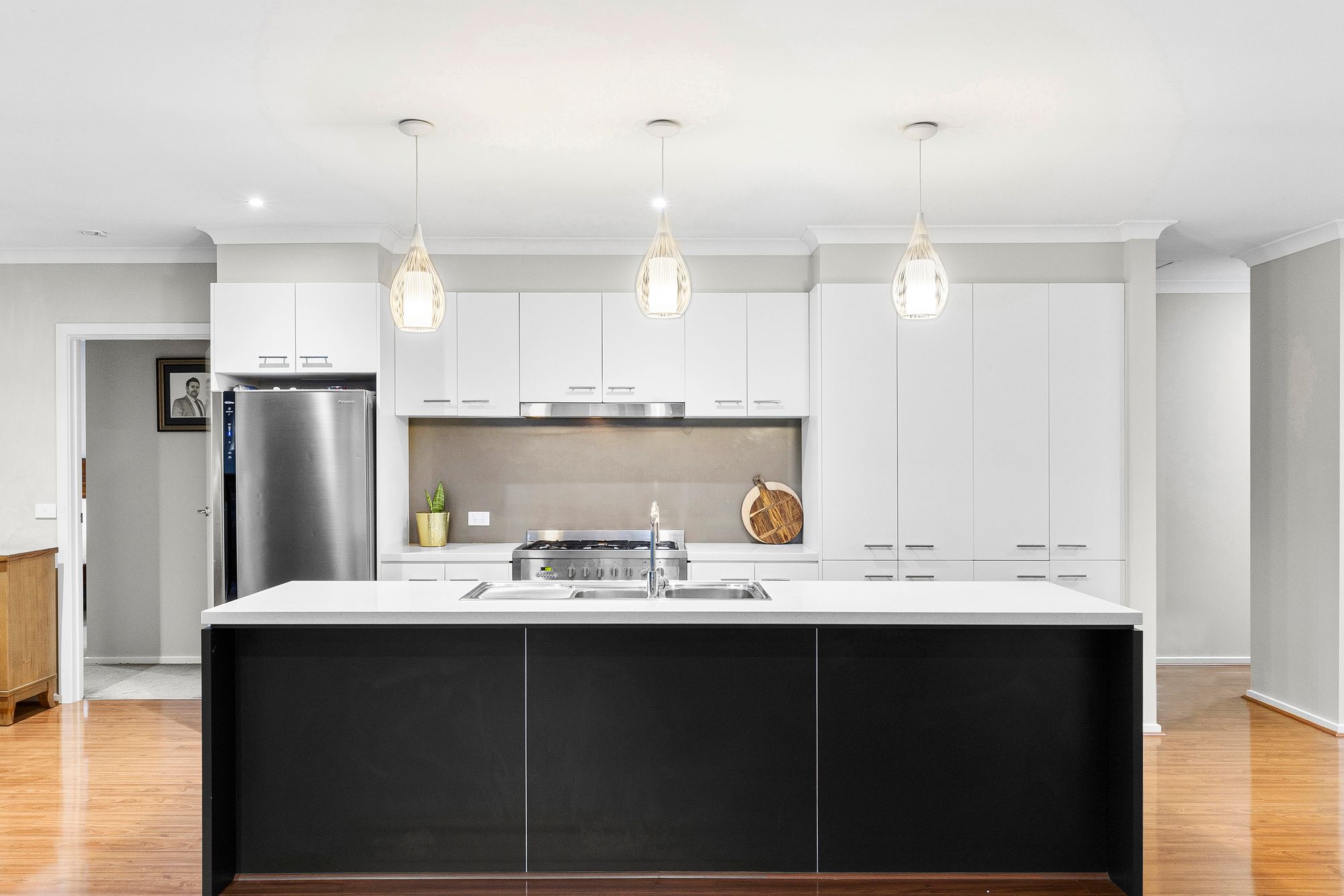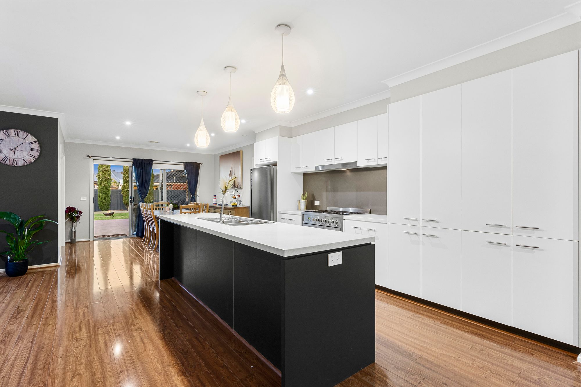 Kitchen: 40mm stone island benchtop, 900mm stainless steel gas cooktop, oven & hidden rangehood, feature pendant lighting, overhead cabinetry, glass splash back, double bowel sink, large built in pantry with ample storage, drawers, timber floorboards, microwave provision, additional powerpoints, dishwasher, chrome fittings.
